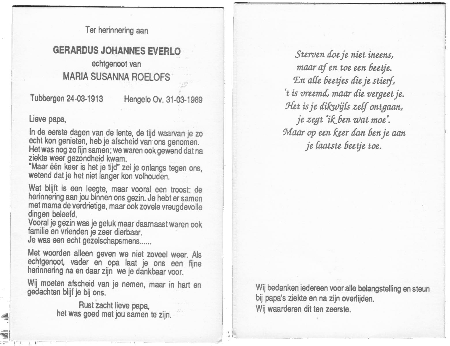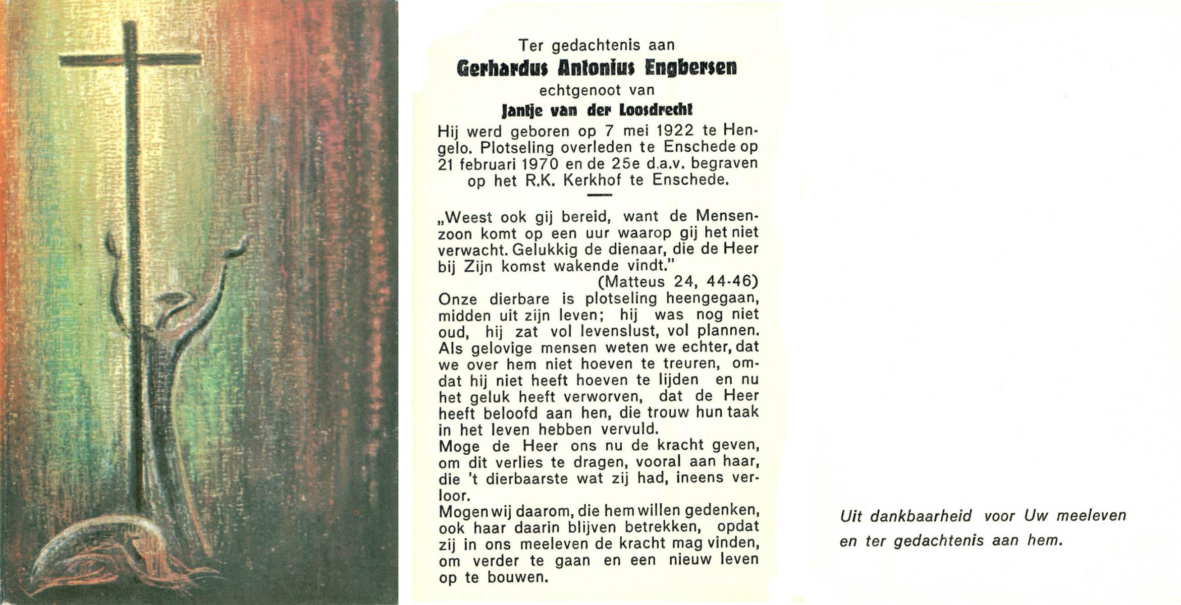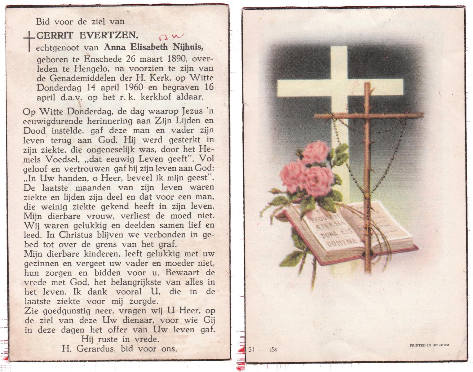 EVERTZEN, Gerrit, geboren op 26-03-1890 te Enschede, overleden op 14-4-1960 te Hengelo (Ov.) op 70-jarige leeftijd, begraven op 16-4-1960 te Hengelo (Ov.).
