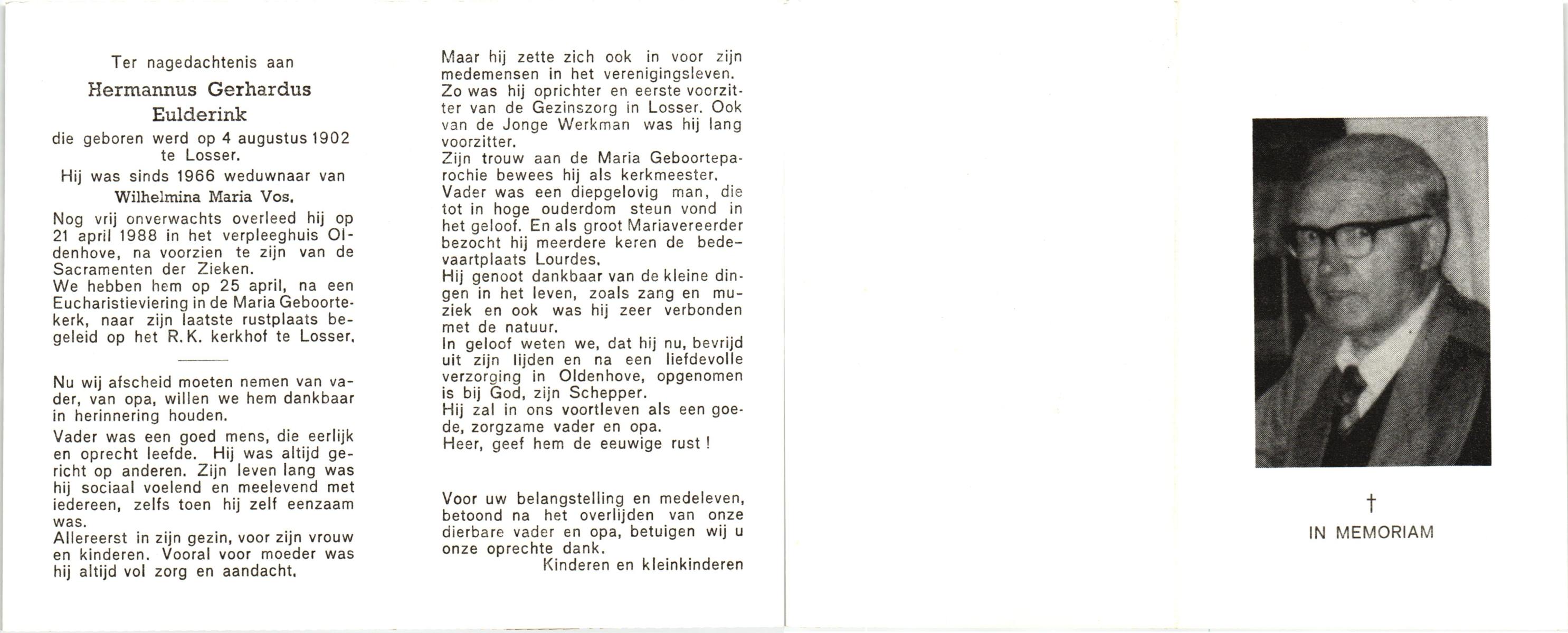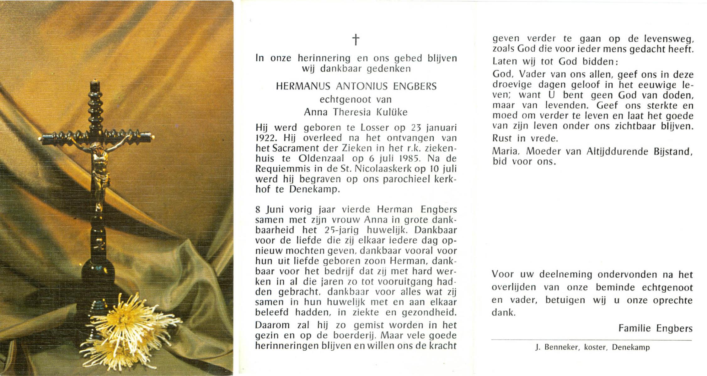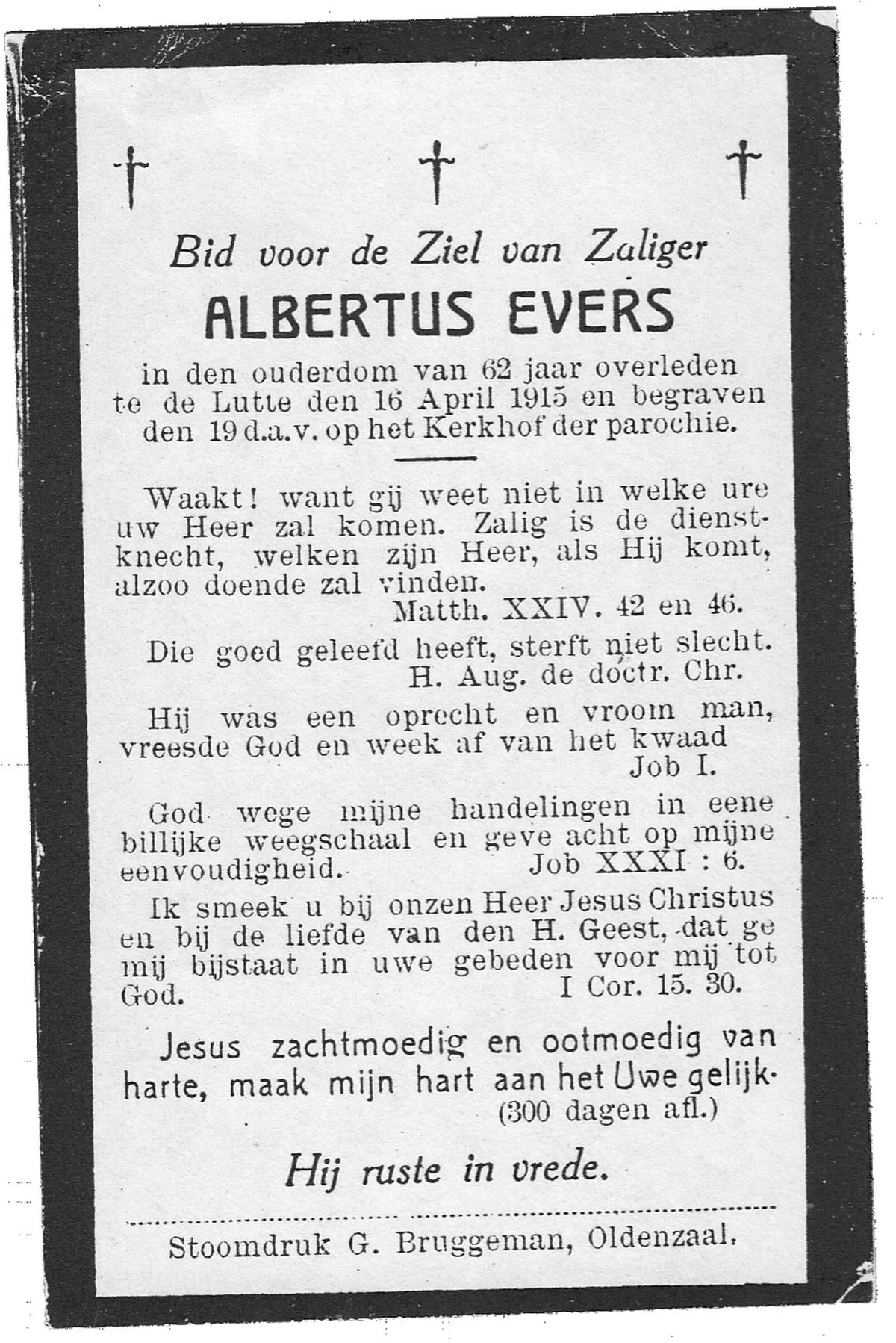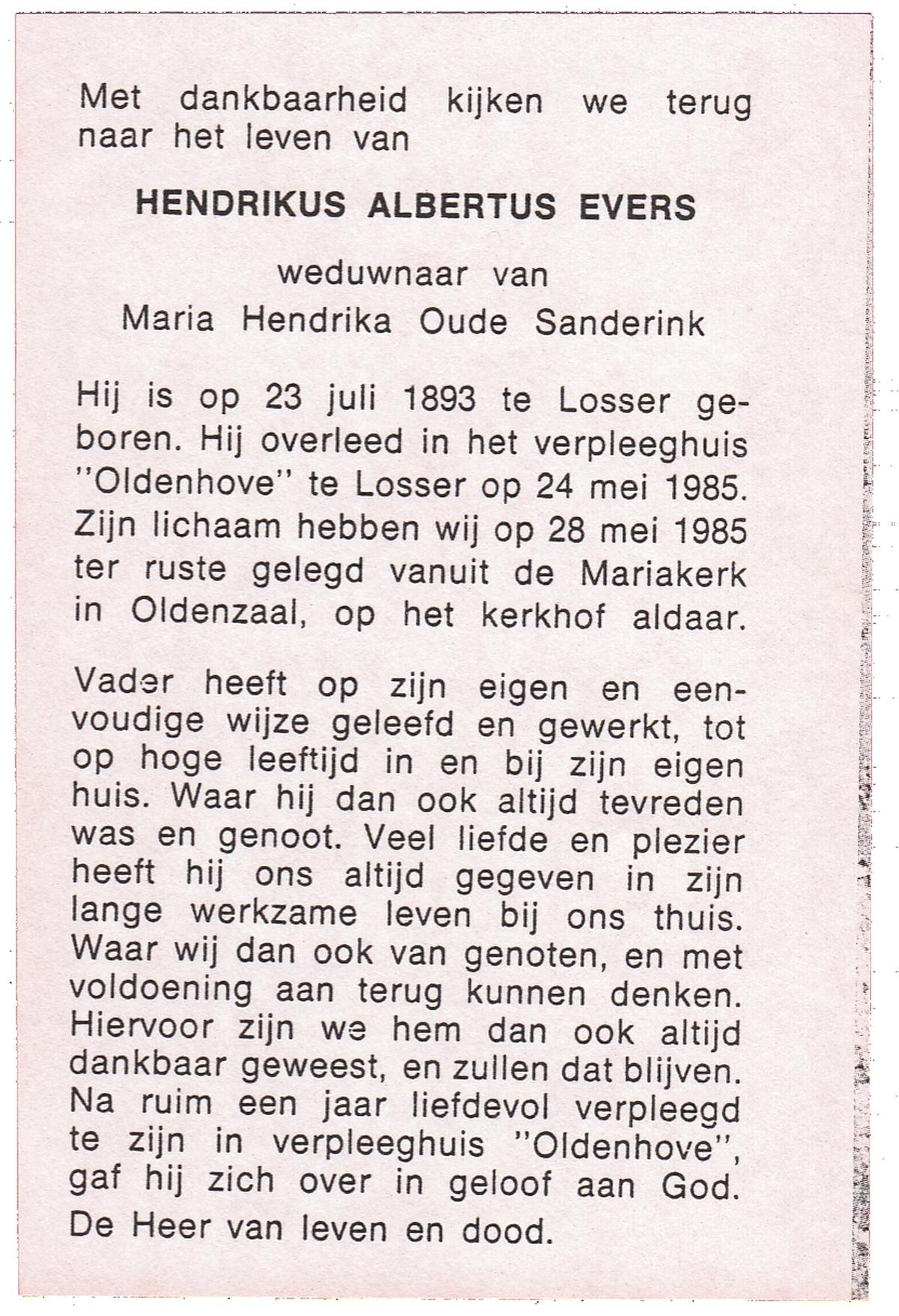 EVERS, Hendrikus Albertus, geboren op 23-07-1893 te Losser, overleden op 24-5-1985 te Losser op 91-jarige leeftijd, begraven op 28-5-1985 te Oldenzaal.