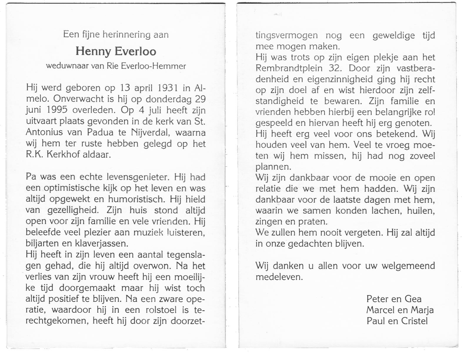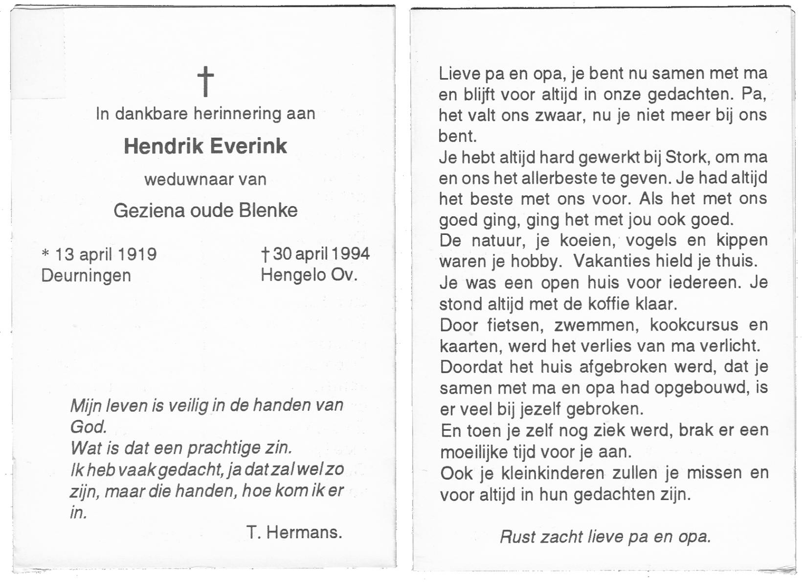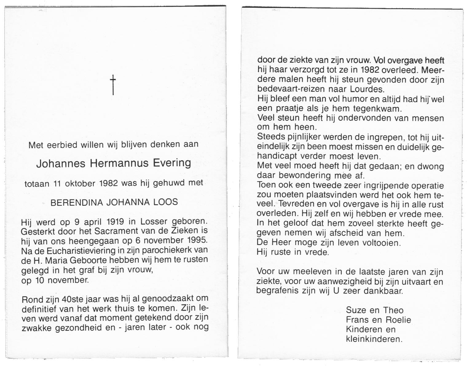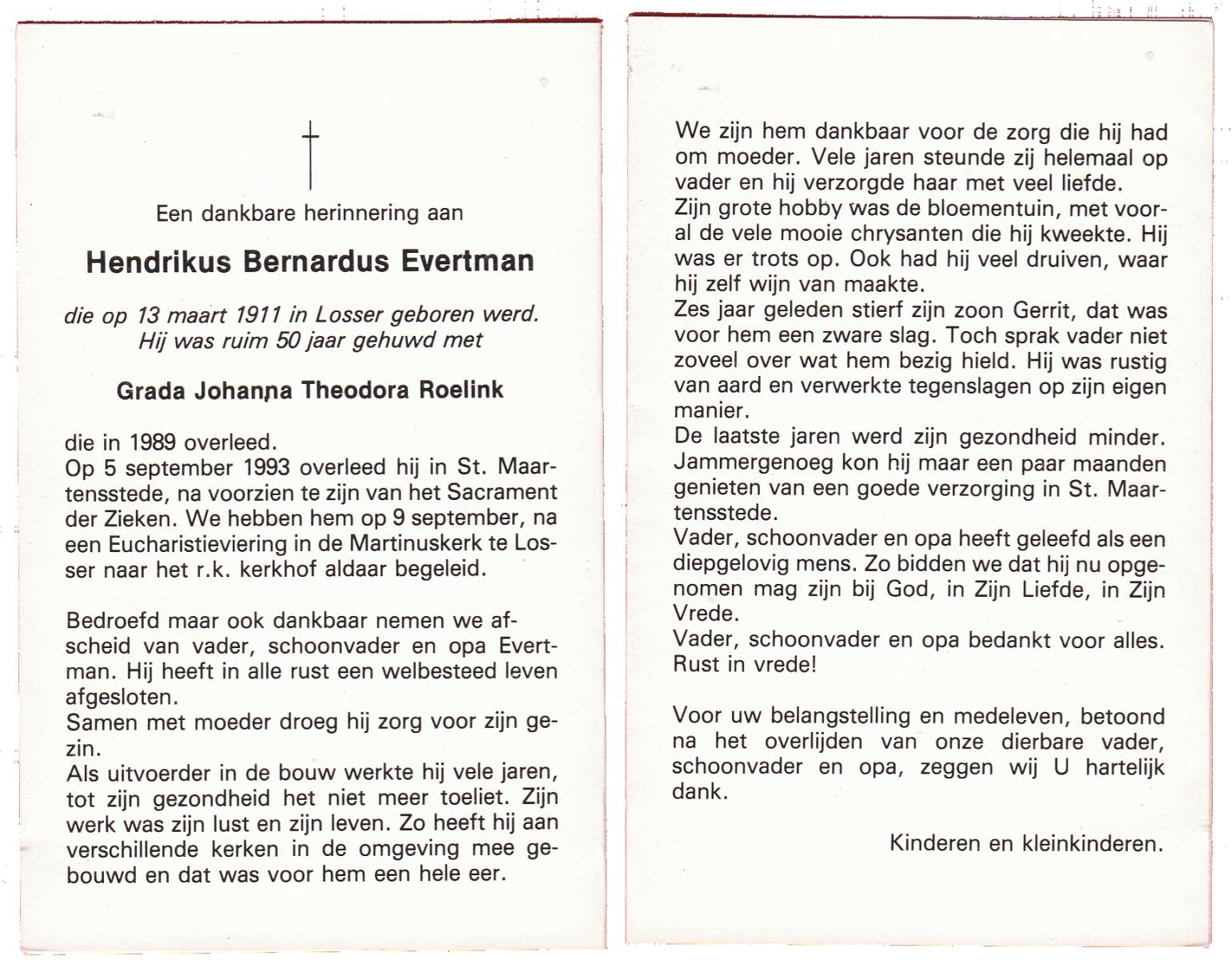 EVERTMAN, Hendrikus Bernardus, geboren op 13-3-1911 te Losser, overleden op 5-9-1993 te Losser op 82-jarige leeftijd, begraven op 9-9-1993 te Losser.