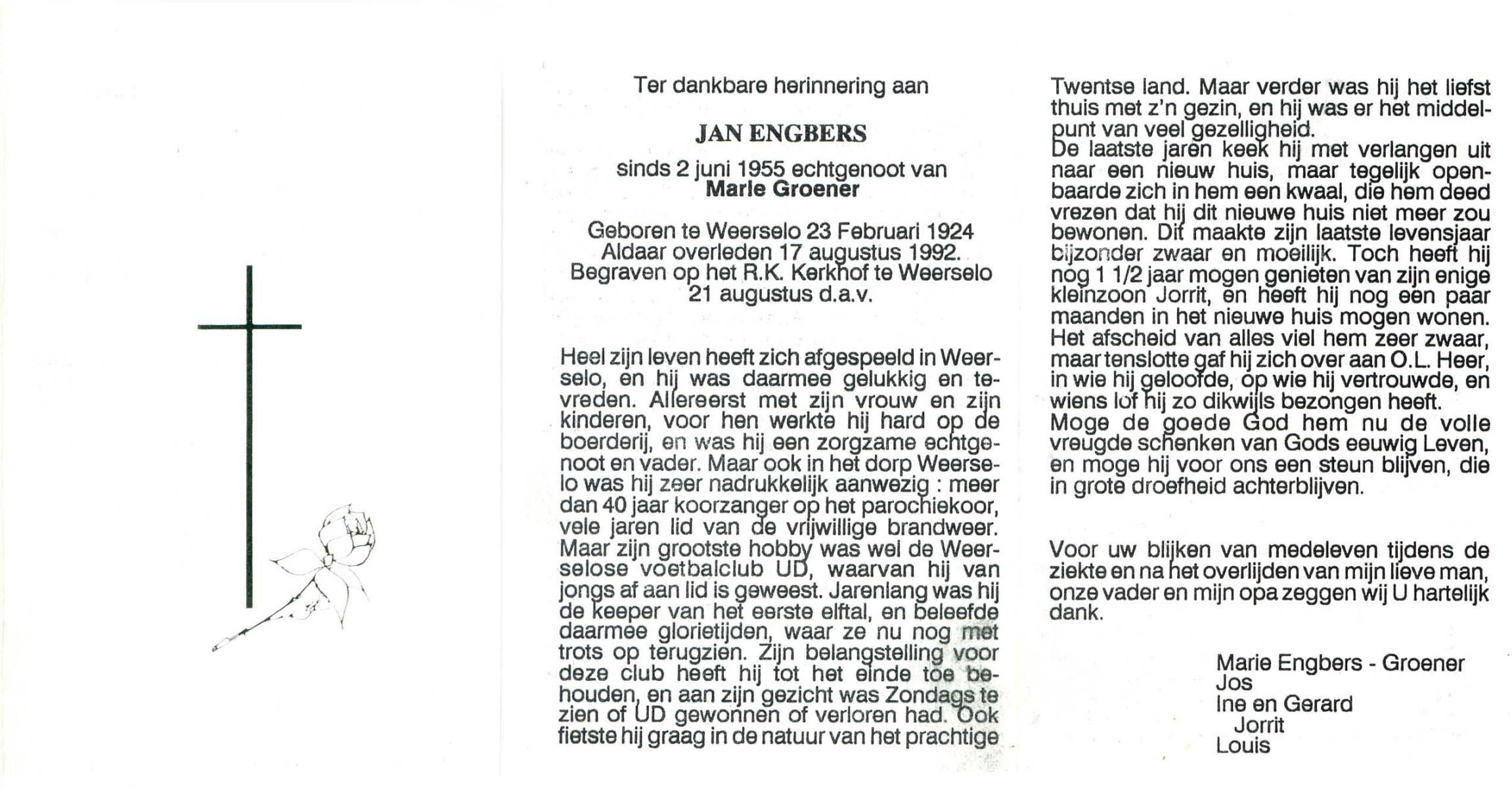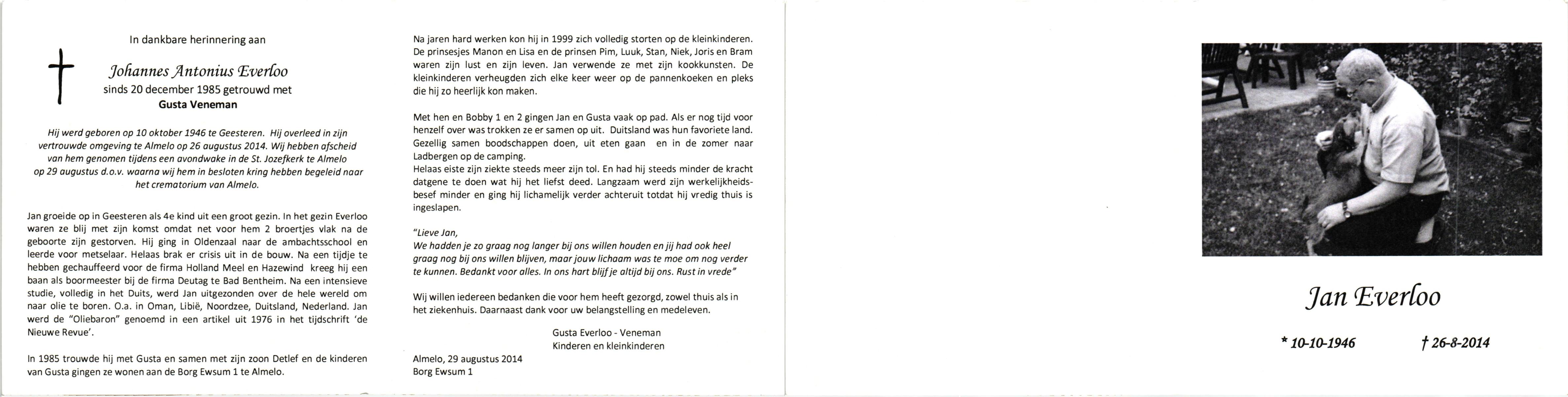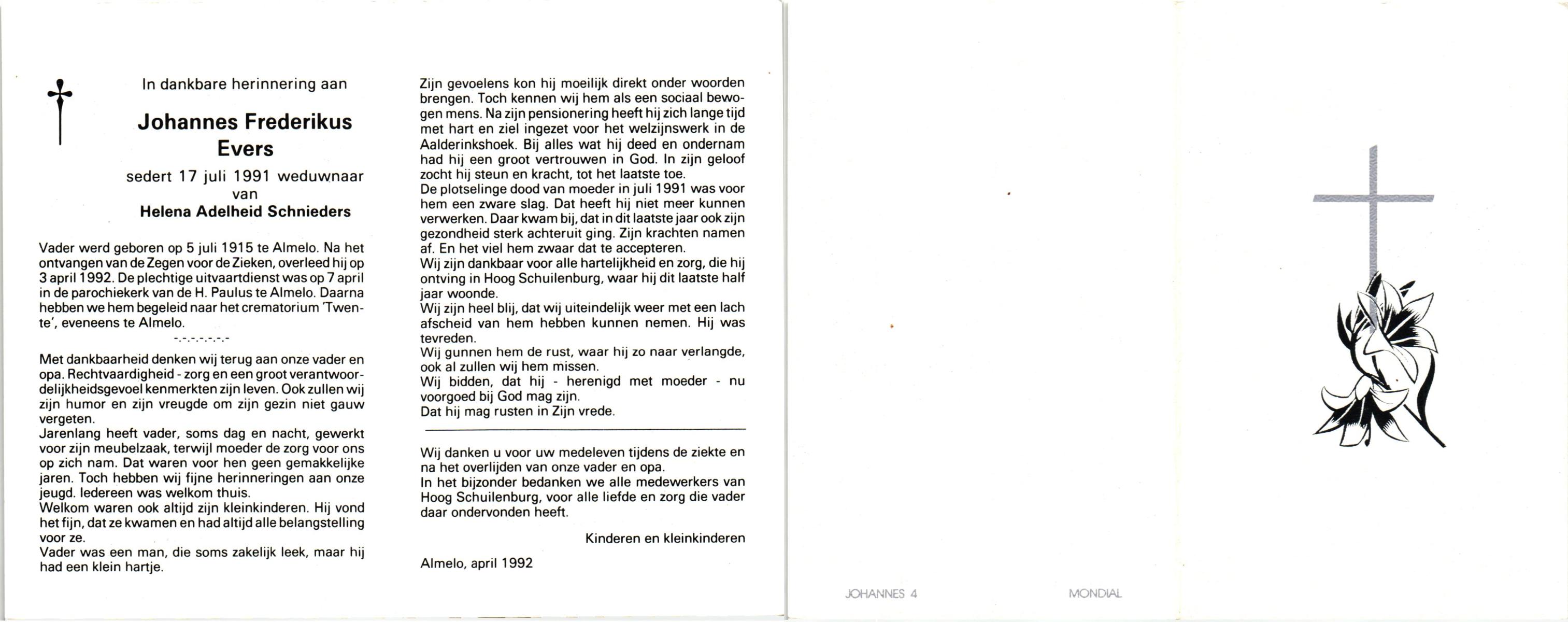 EVERS, Johannes Frederikus, geboren op 5-7-1915 te Almelo, overleden op 3-4-1992 op 77-jarige leeftijd, gecremeerd op 7-4-1992 te Almelo.
