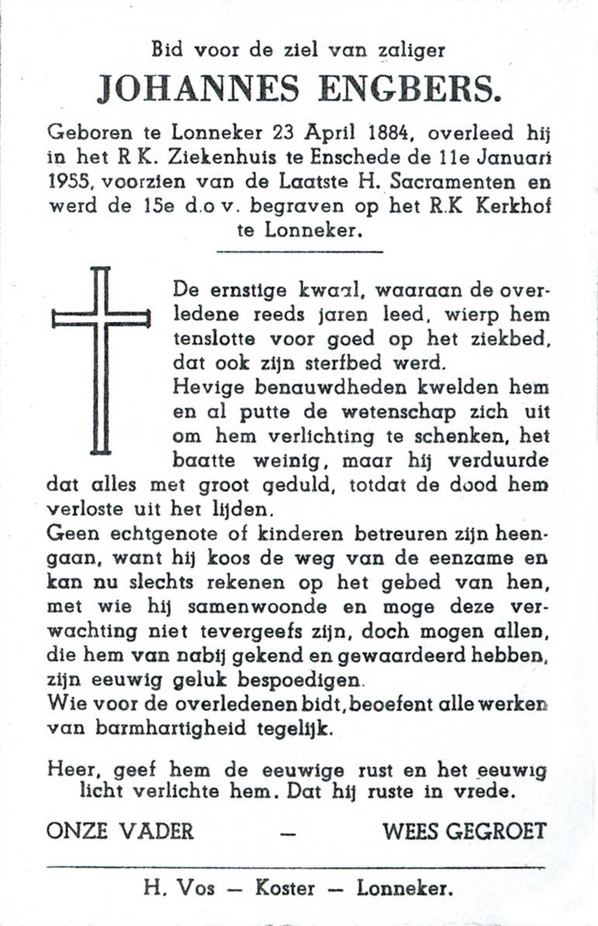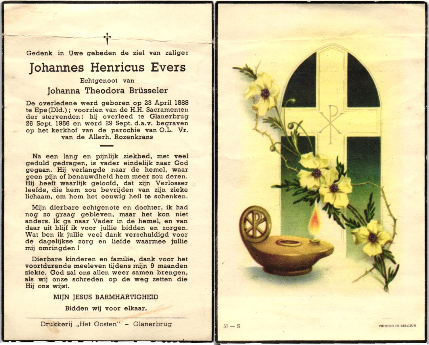 EVERS, Johannes Henricus, geboren op 23-04-1888 te Epe, Dld, overleden op 26-9-1956 te Glanerbrug op 68-jarige leeftijd, begraven op 29-9-1956 te Glanerbrug.