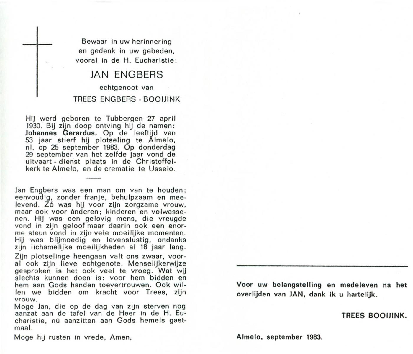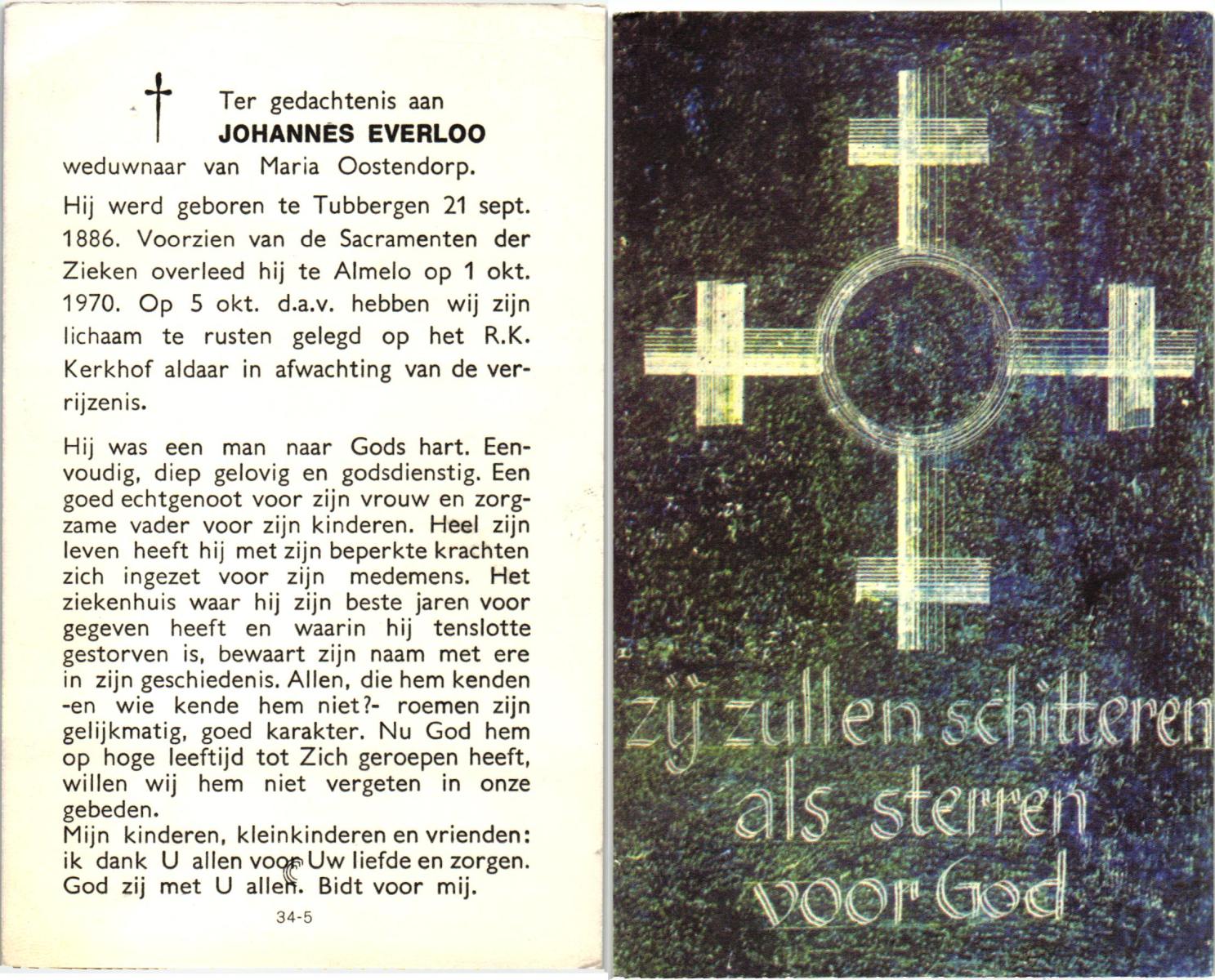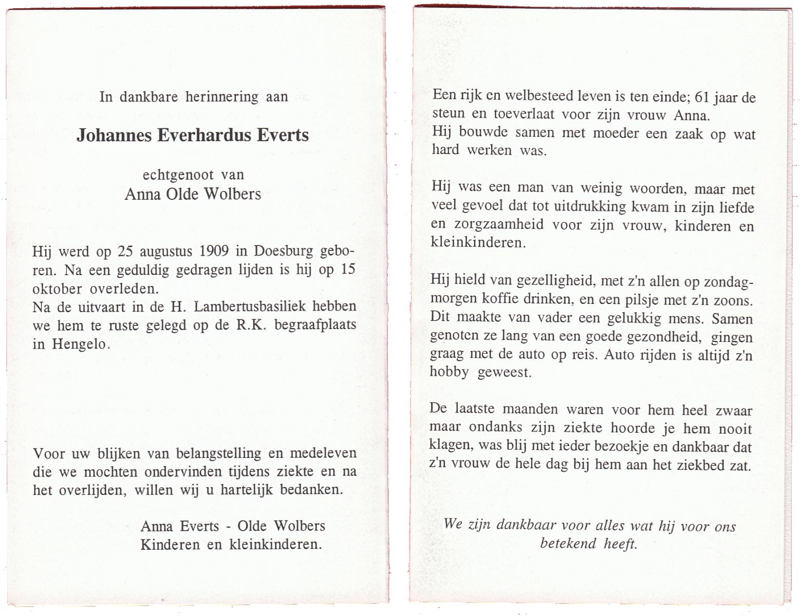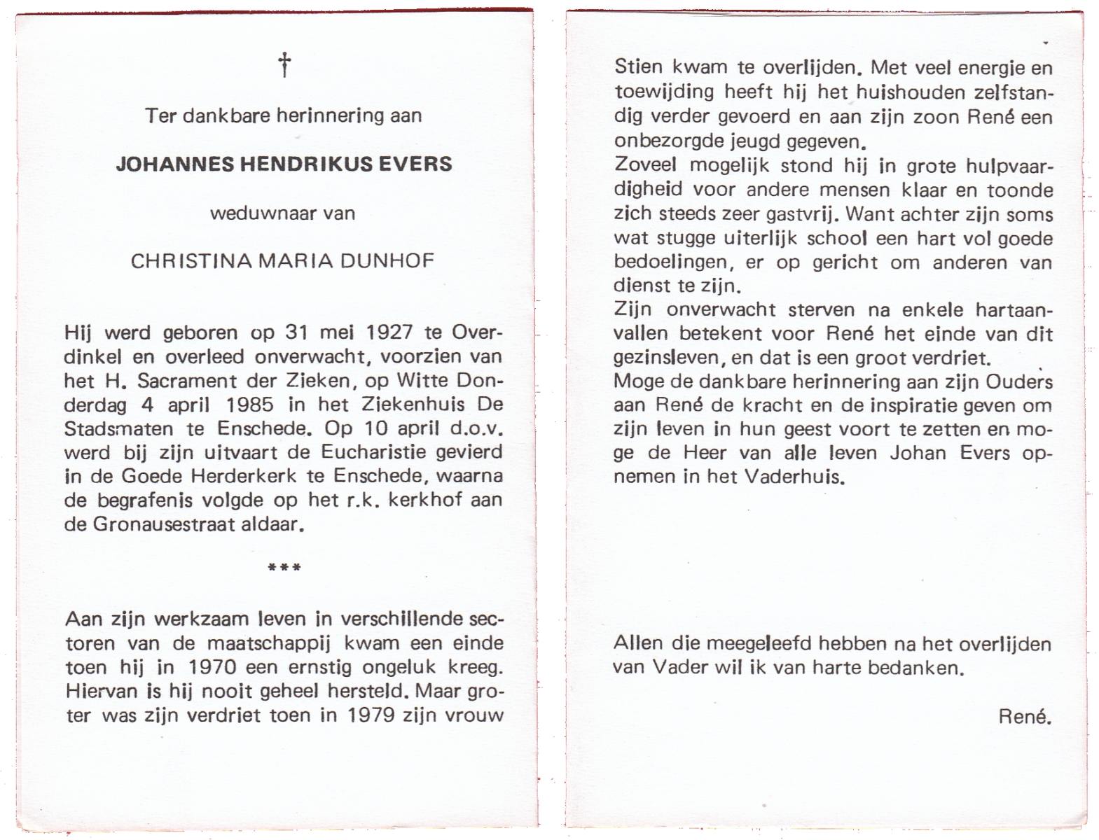EVERS, Johannes Hendrikus, geboren op 31-5-1927 te Overdinkel, overleden op 4-4-1985 te Enschede op 57-jarige leeftijd, begraven op 10-4-1985 te Enschede.