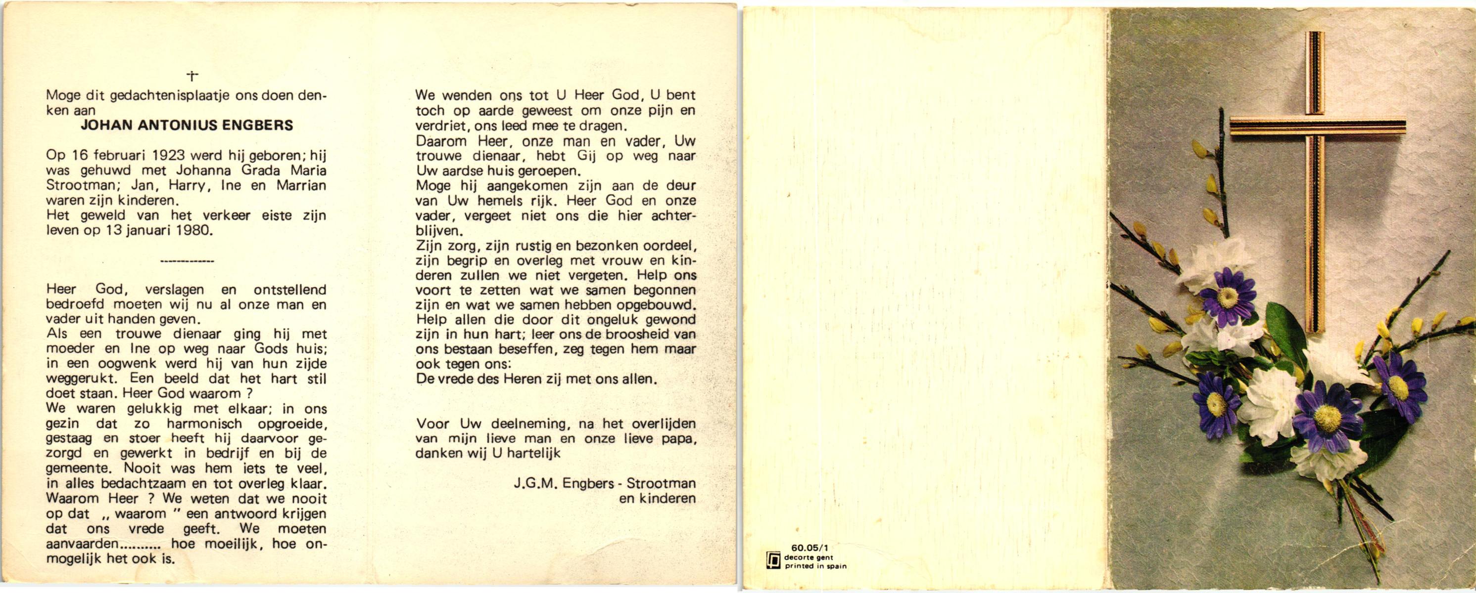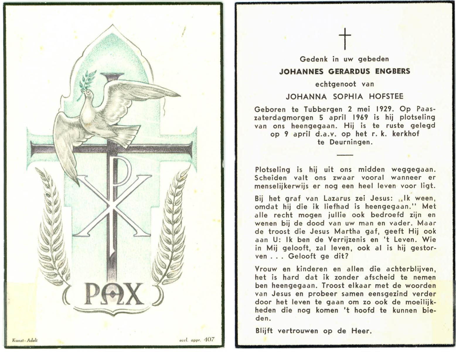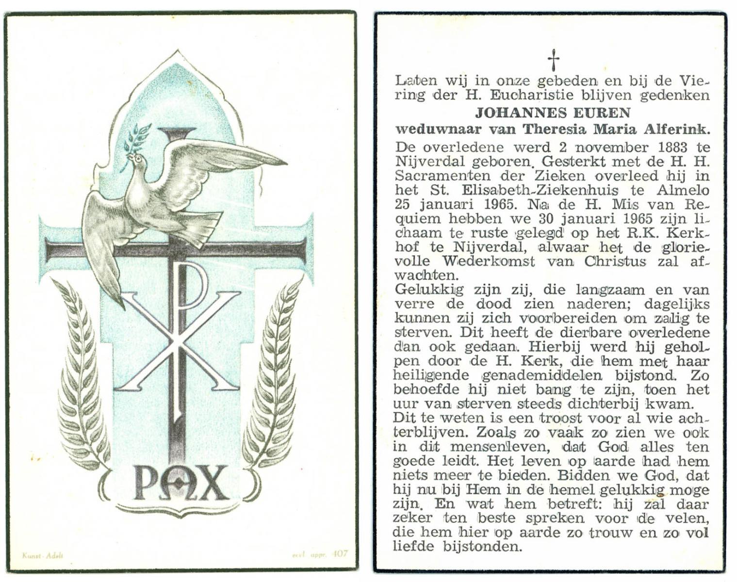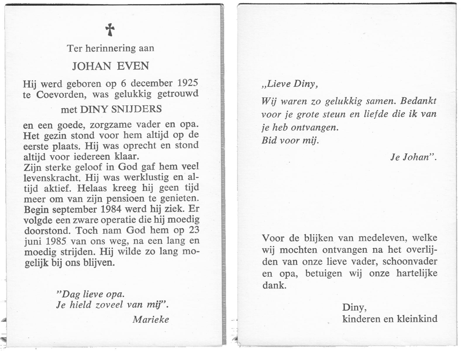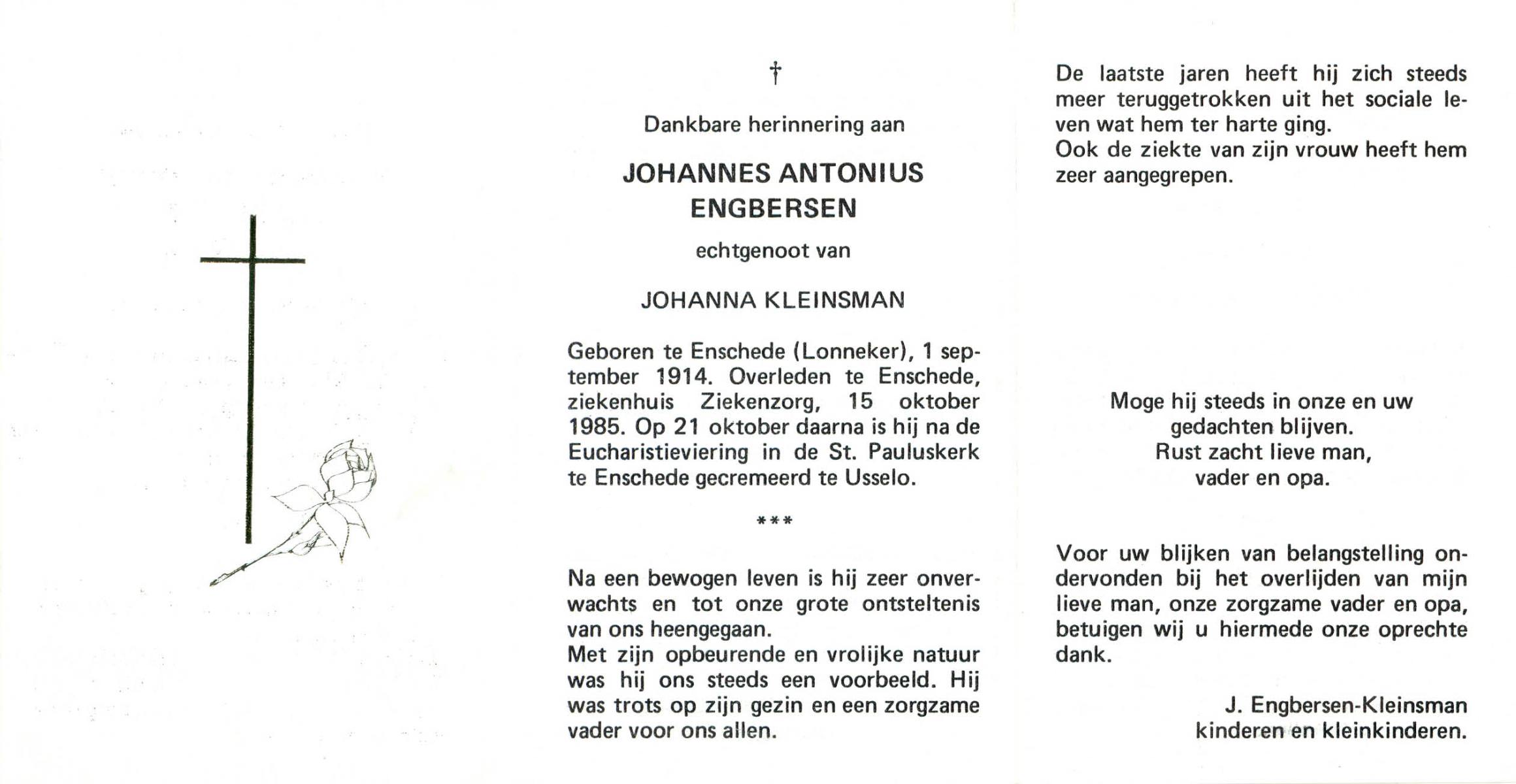 EVERS, Johannes Hendrikus, geboren op 31-5-1927 te Overdinkel, overleden op 4-4-1985 te Enschede op 57-jarige leeftijd, begraven op 10-4-1985 te Enschede.