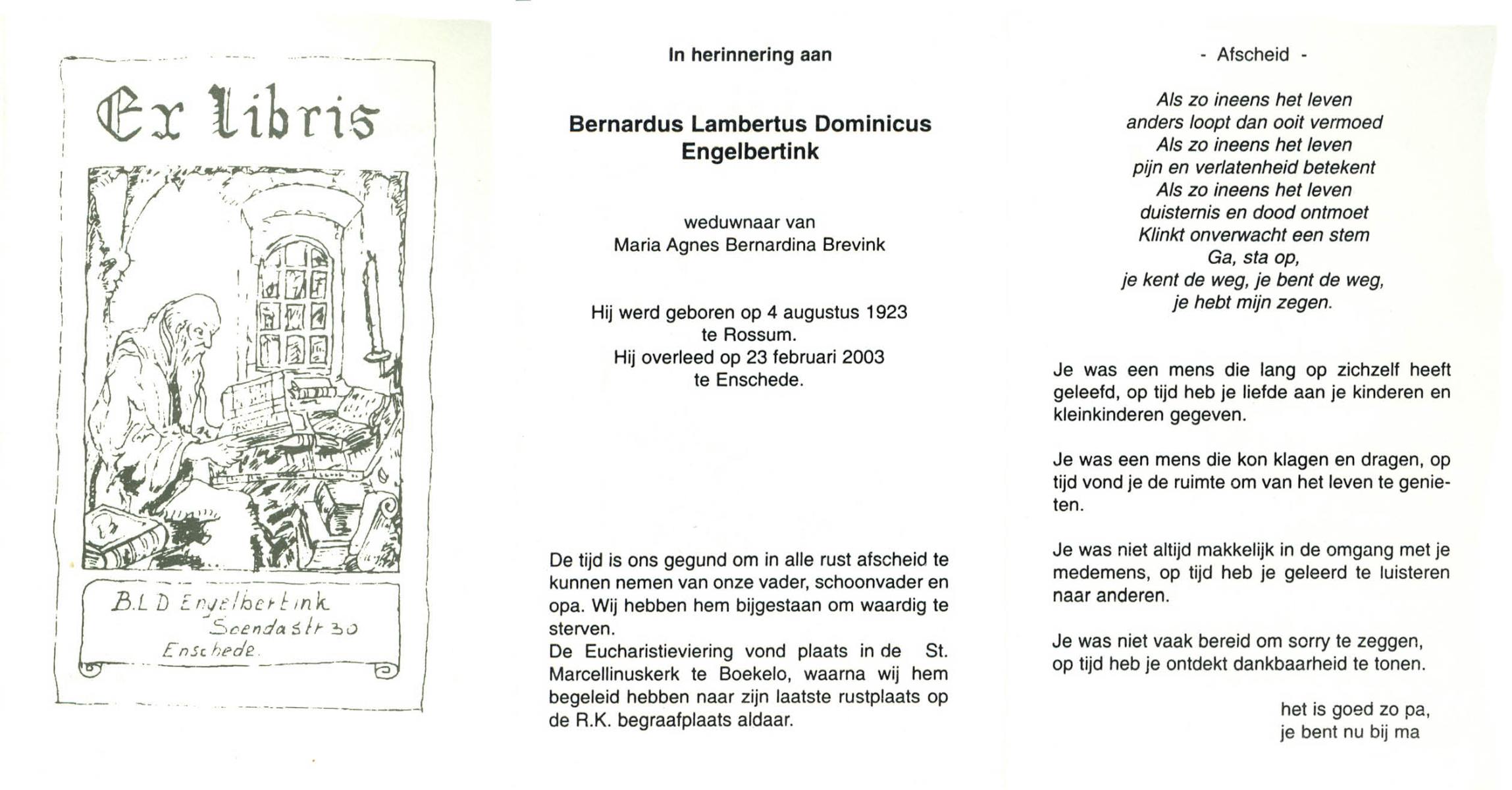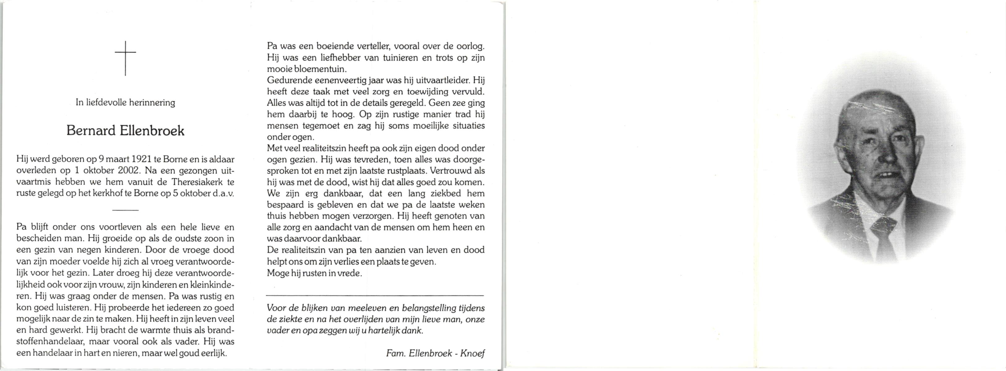 ELLENBROEK, , Bernard, geboren op 9-3-1921 te Borne, overleden op 1-10-2002 te Borne op 81-jarige leeftijd, begraven op 5-10-2002 te Borne.