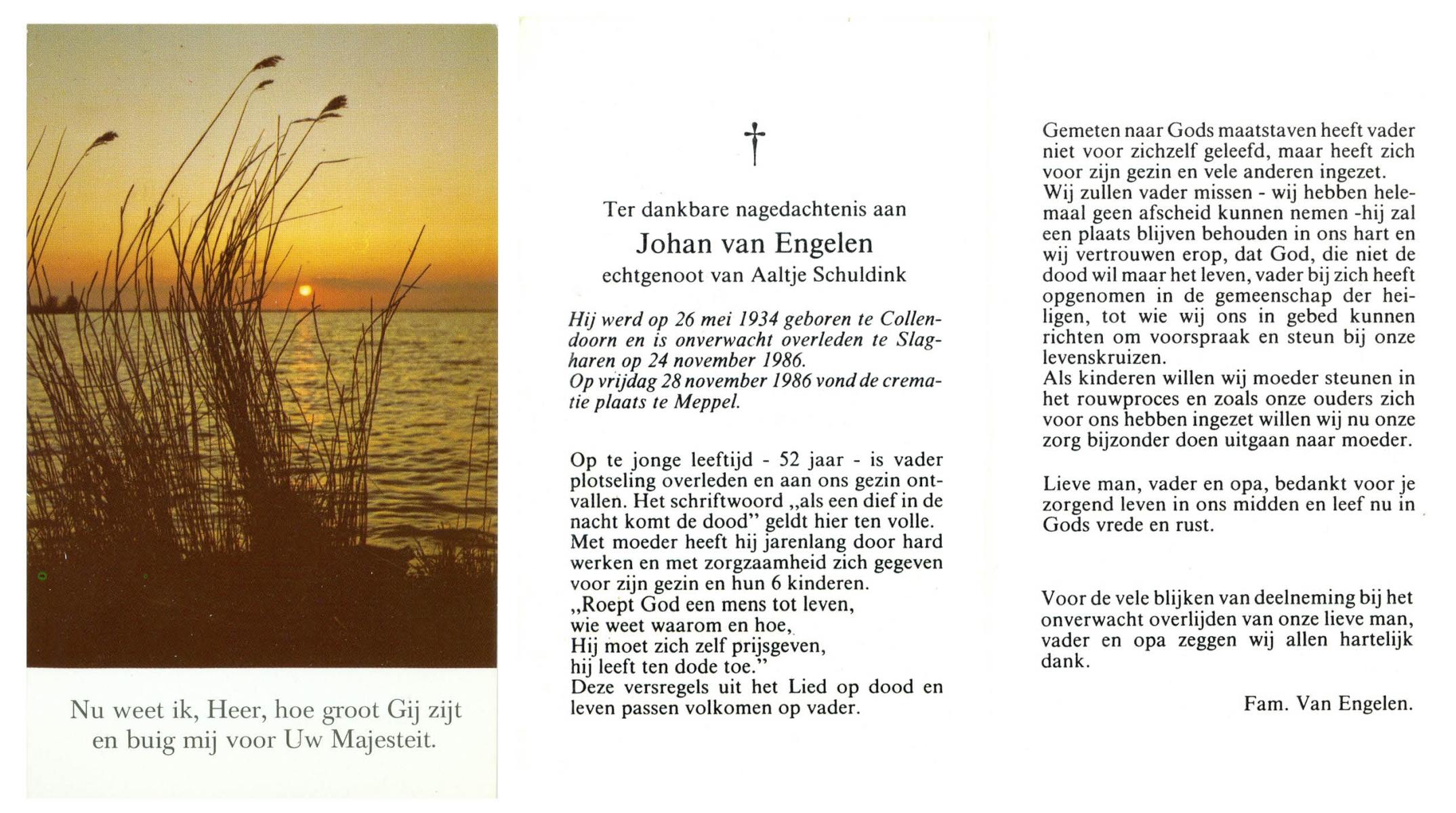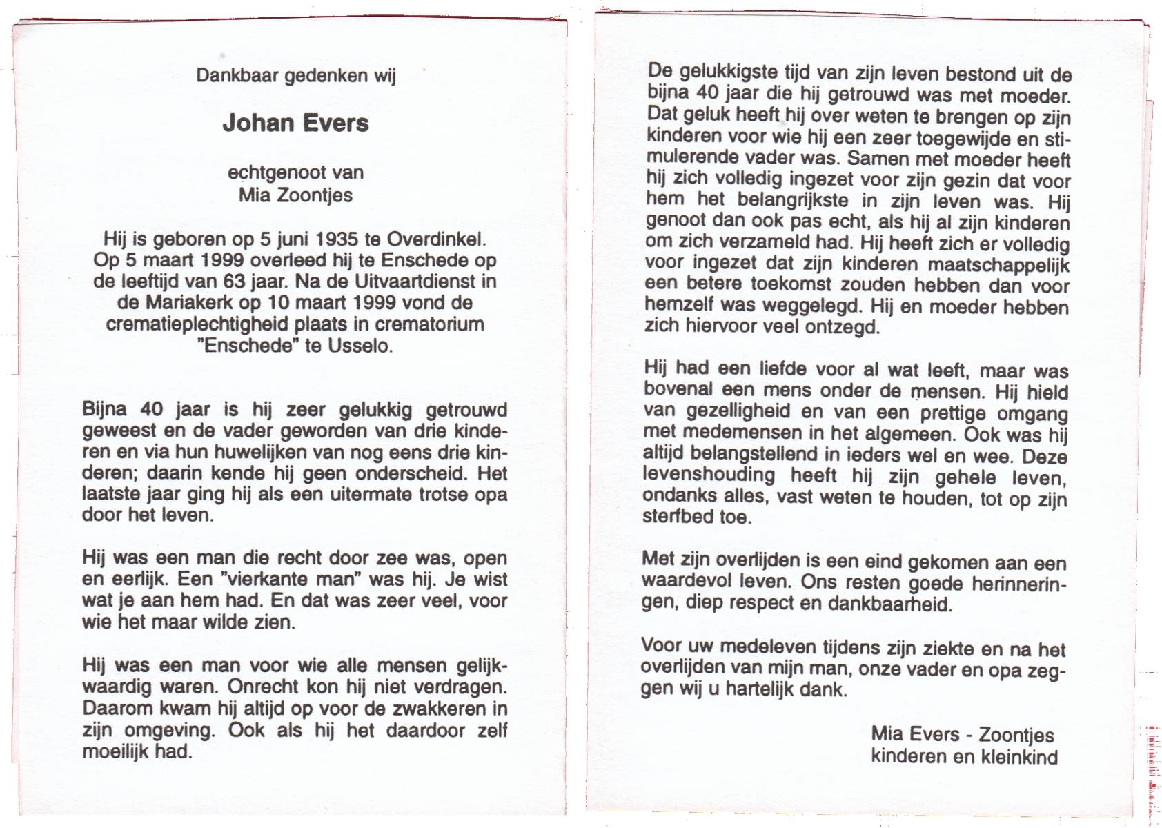 EVERS, Johan, geboren op 5-6-1935 te Overdinkel, overleden op 5-3-1999 te Enschede op 63-jarige leeftijd, gecremeerd op 10-3-1999 te Usselo.