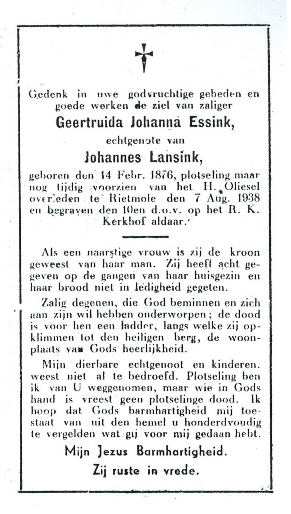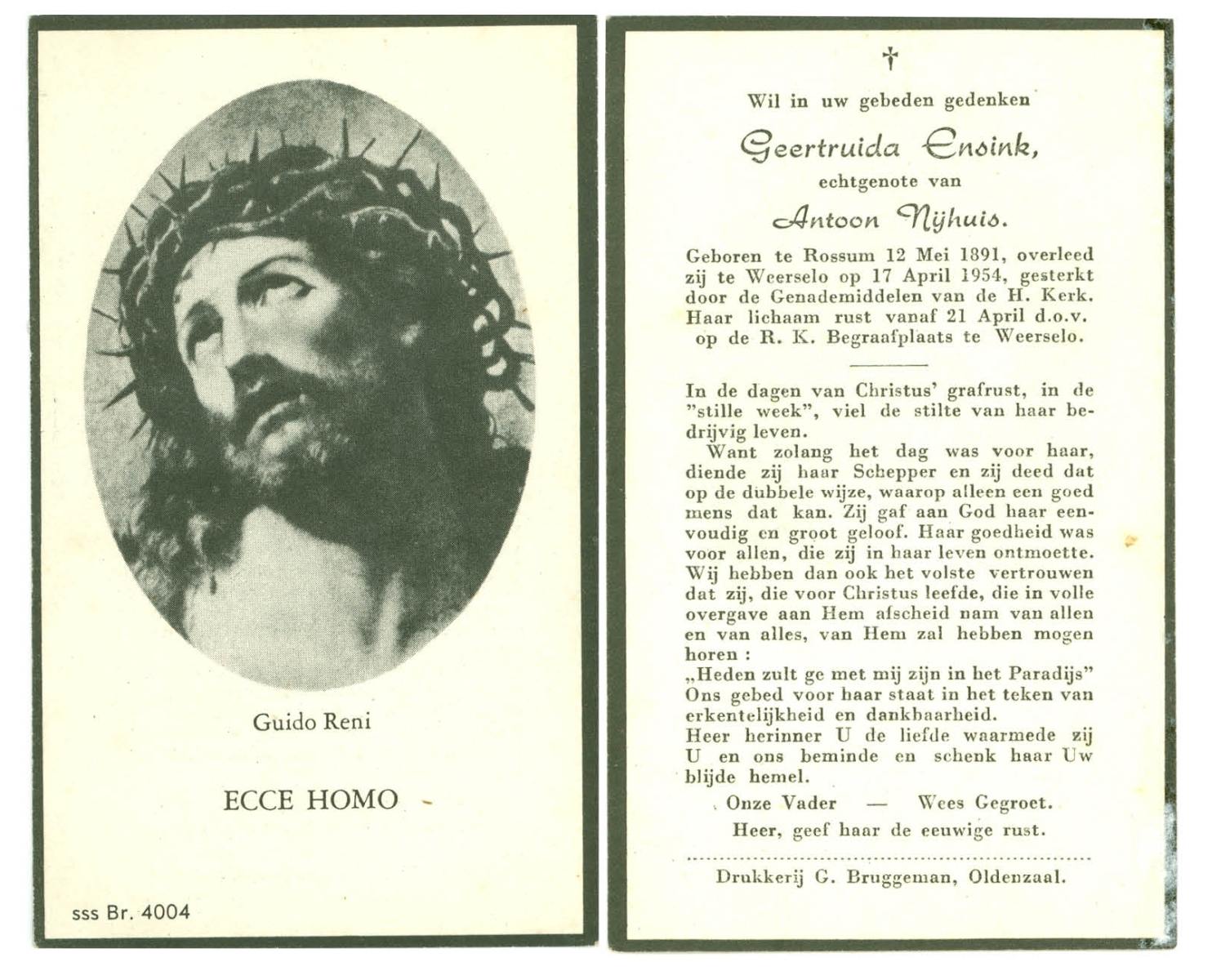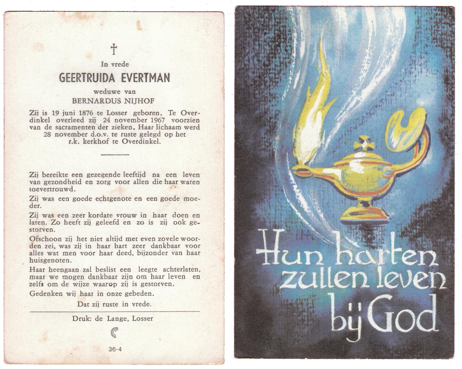 EVERTMAN, Geertruida, geboren op 19-06-1876 te Losser, overleden op 24-11-1967 te Overdinkel op 91-jarige leeftijd, begraven op 28-11-1967 te Overdinkel.