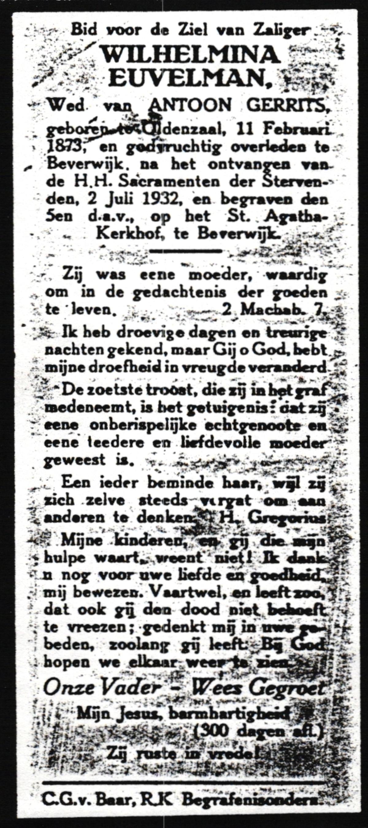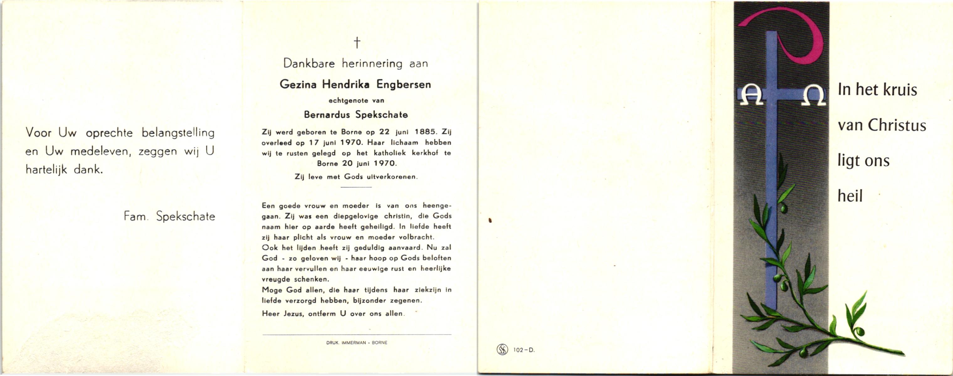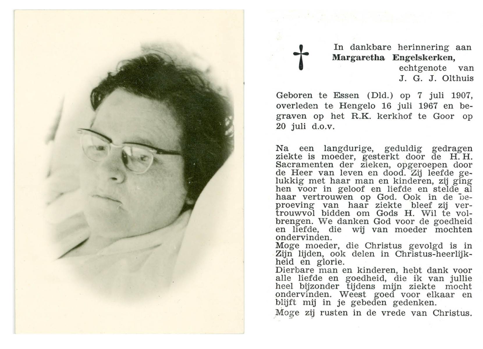 EVERTMAN, Geertruida, geboren op 19-06-1876 te Losser, overleden op 24-11-1967 te Overdinkel op 91-jarige leeftijd, begraven op 28-11-1967 te Overdinkel.