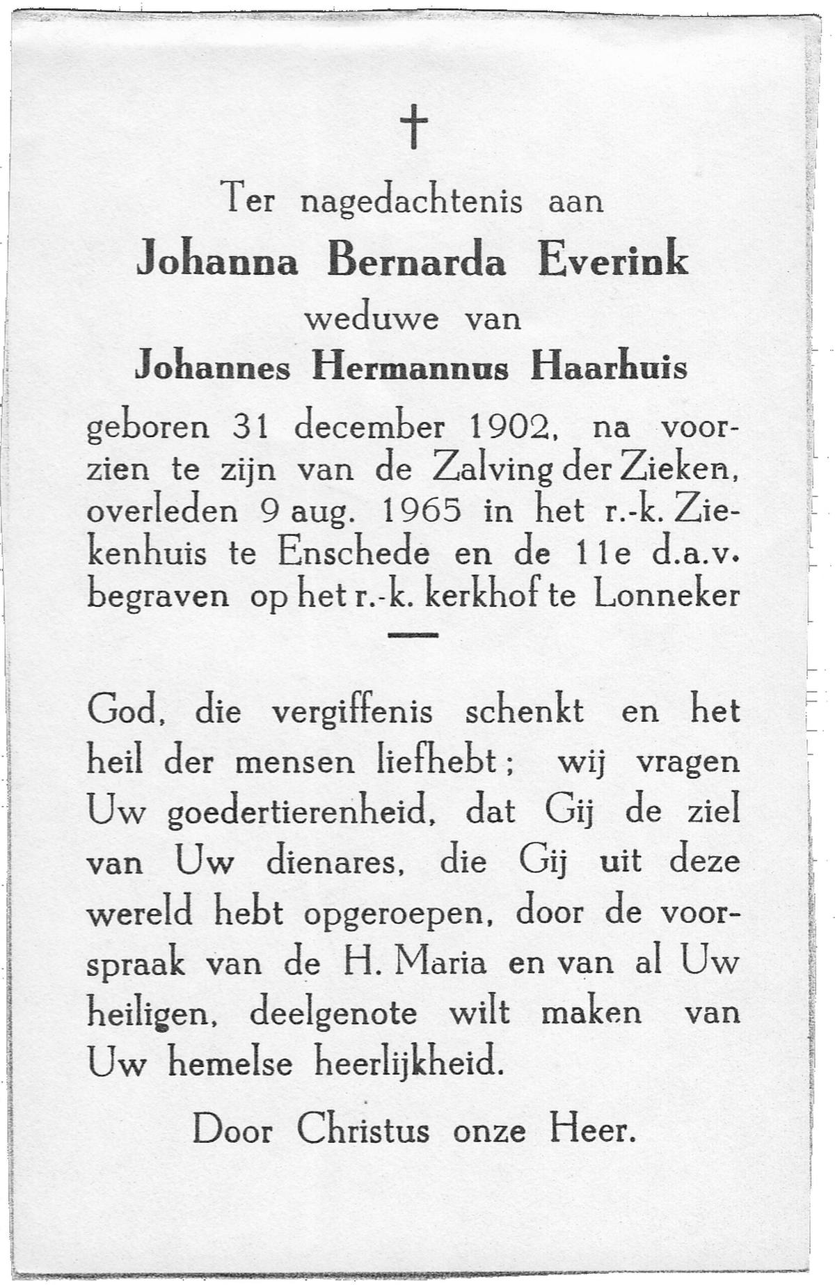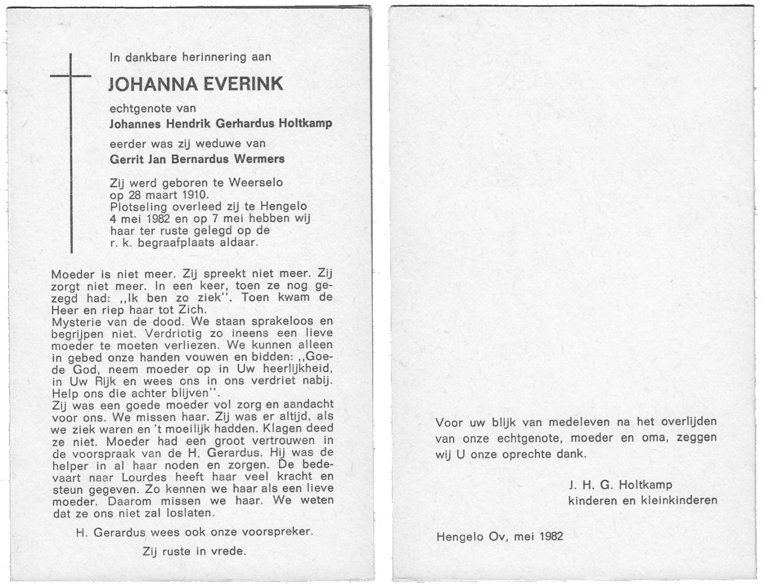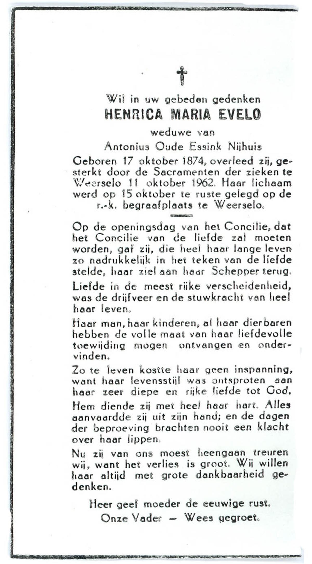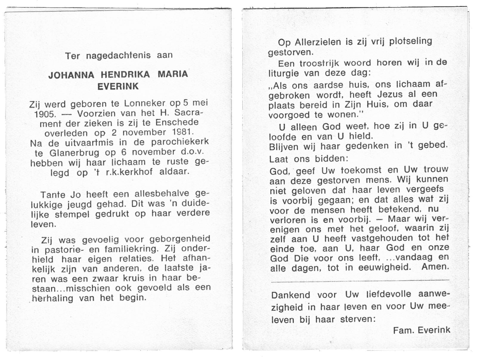 EVERS, Johanna Maria, geboren op 19-01-1891 te Denekamp, overleden op 7-12-1975 te Denekamp op 84-jarige leeftijd, begraven op 10-12-1975 te Denekamp.
