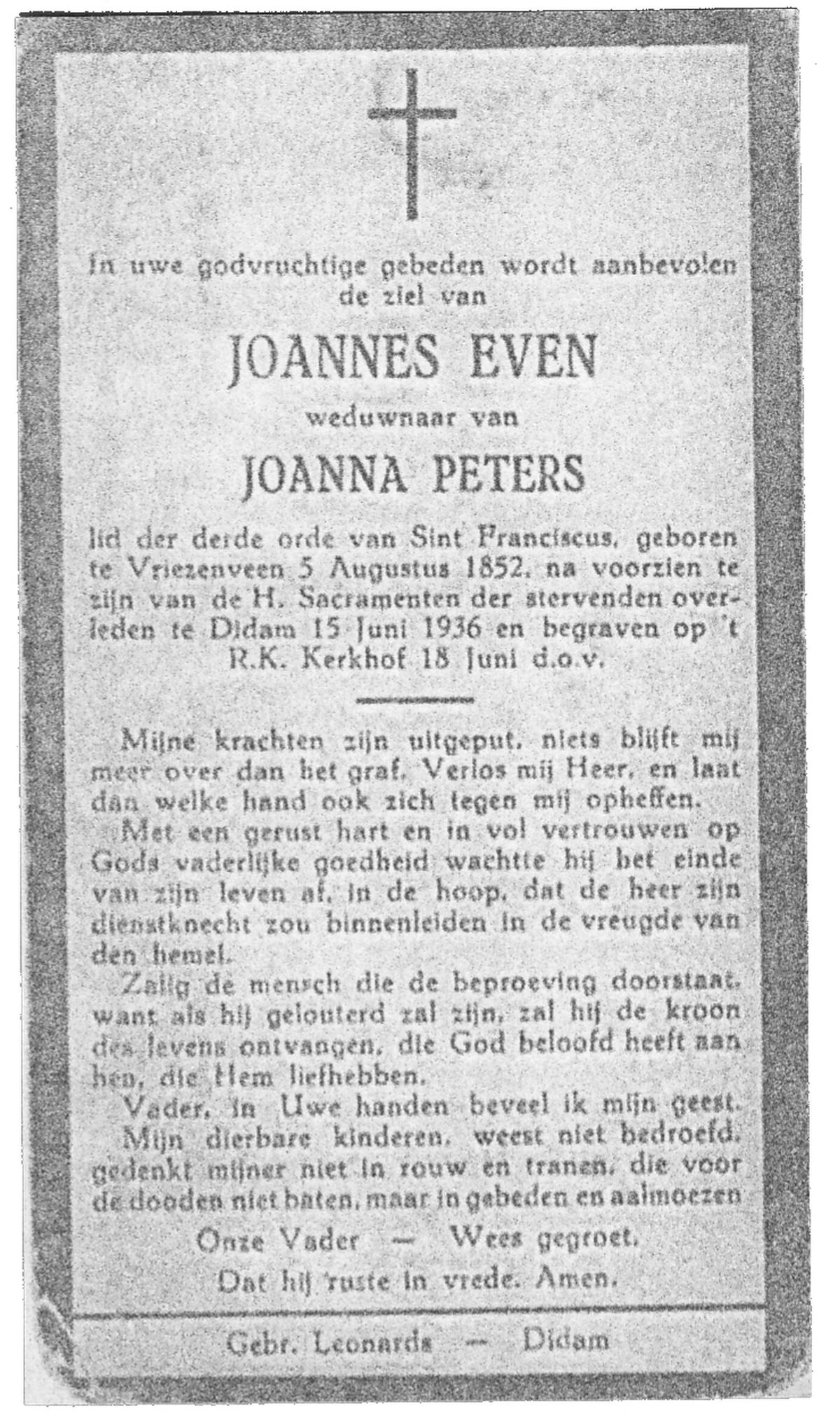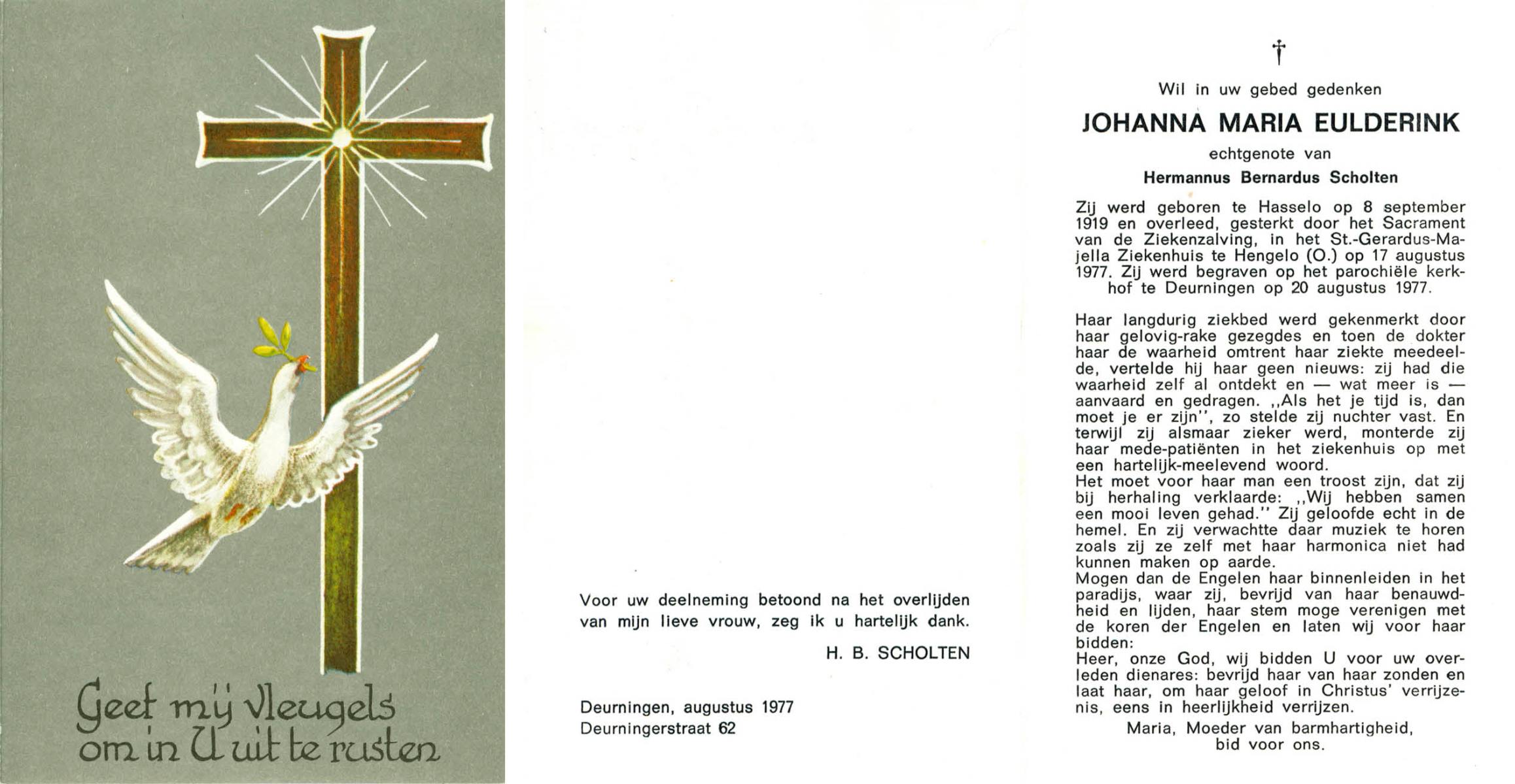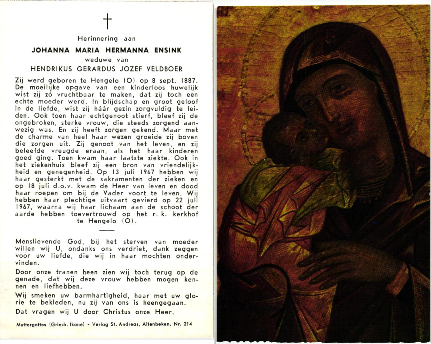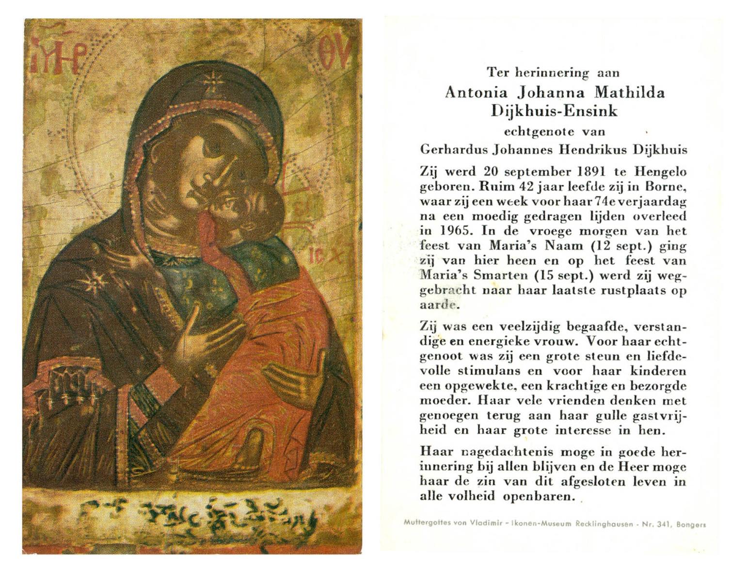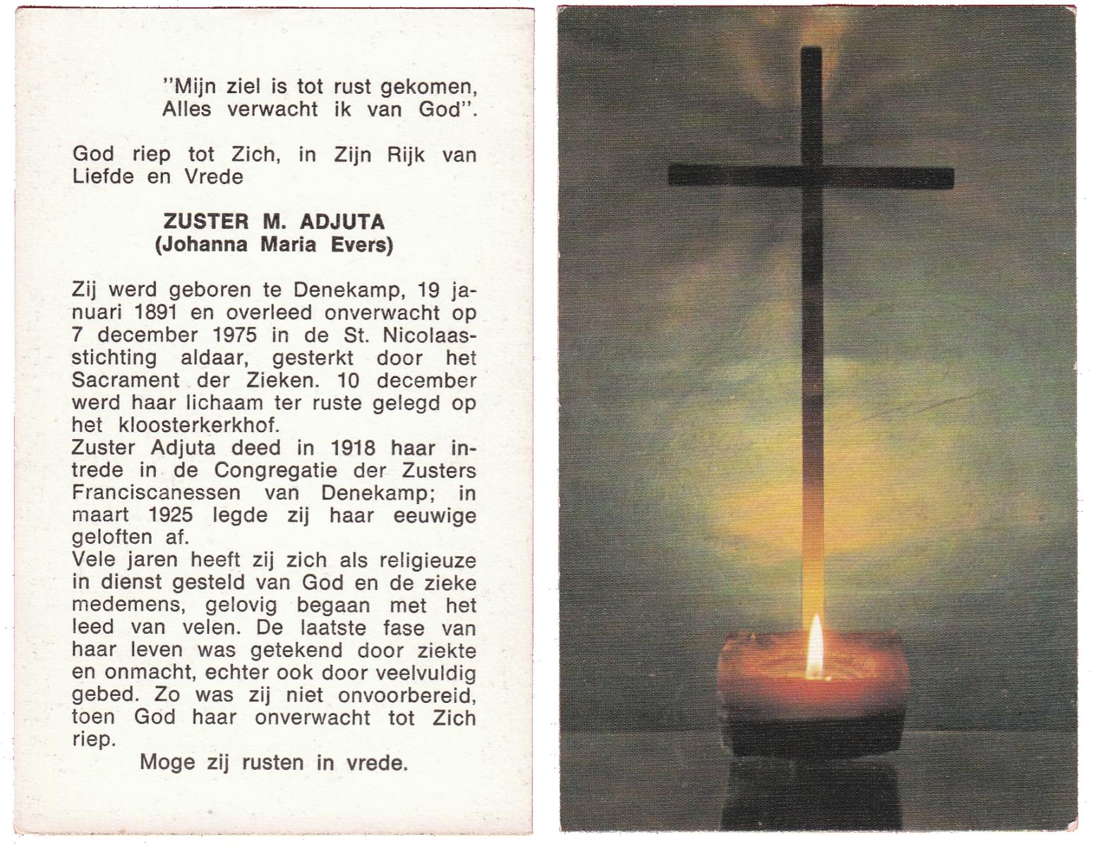 EVERS, Johanna Maria, geboren op 19-01-1891 te Denekamp, overleden op 7-12-1975 te Denekamp op 84-jarige leeftijd, begraven op 10-12-1975 te Denekamp.