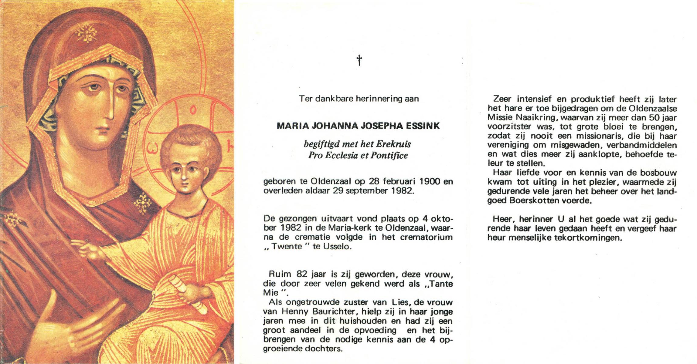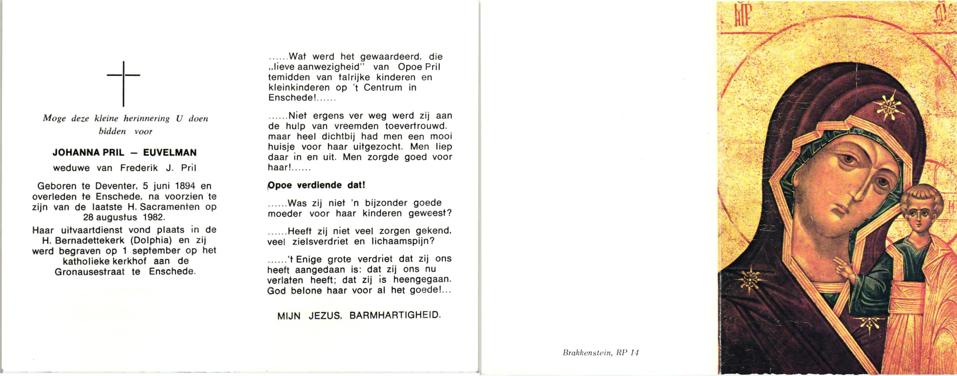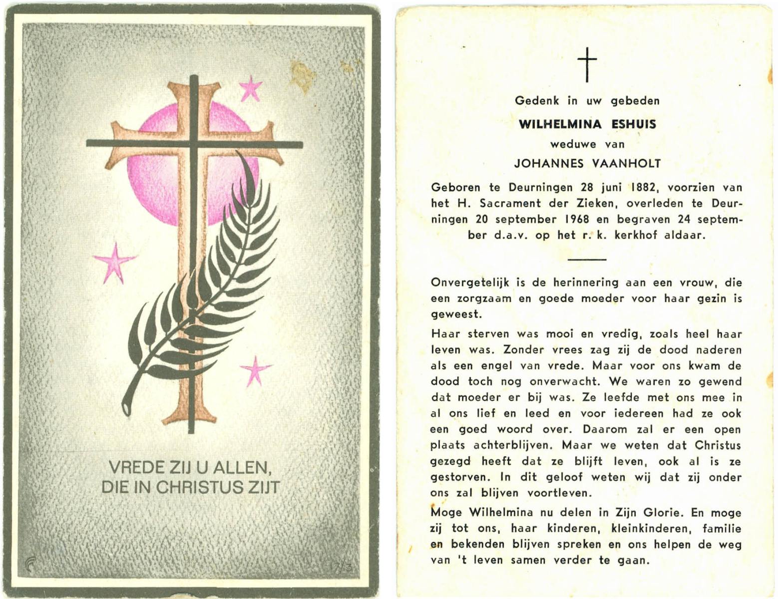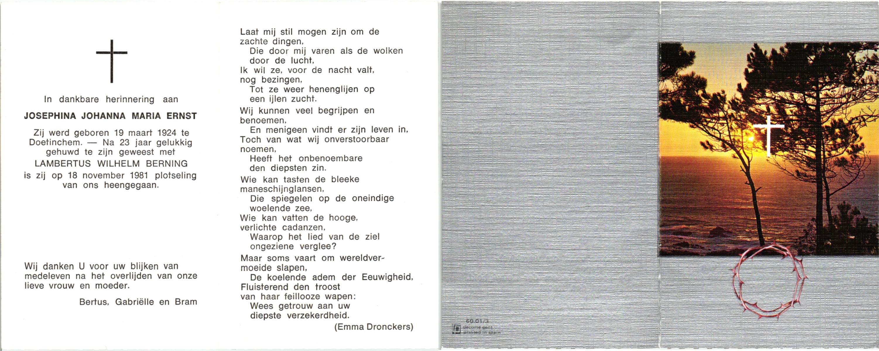 EVERS, Johanna Maria, geboren op 19-01-1891 te Denekamp, overleden op 7-12-1975 te Denekamp op 84-jarige leeftijd, begraven op 10-12-1975 te Denekamp.