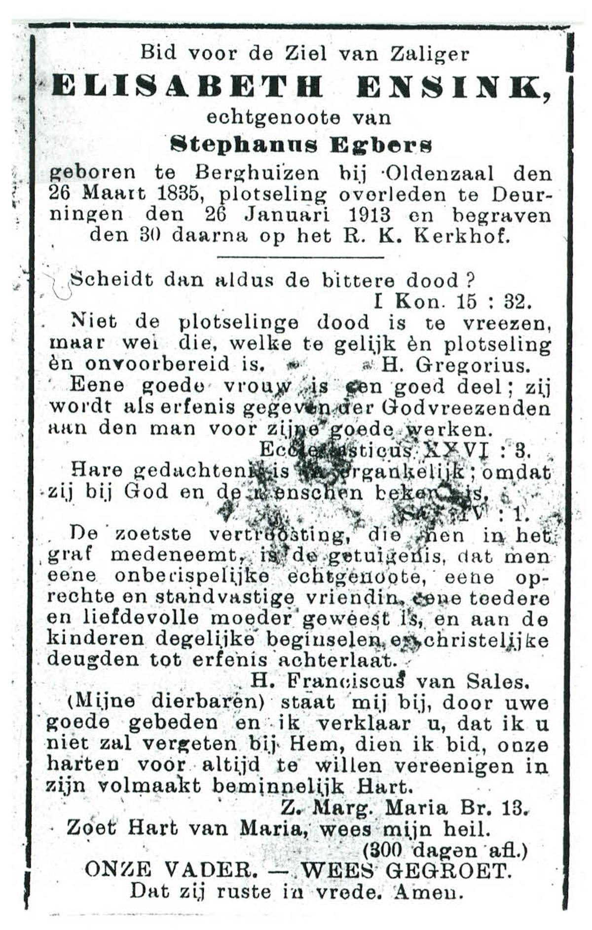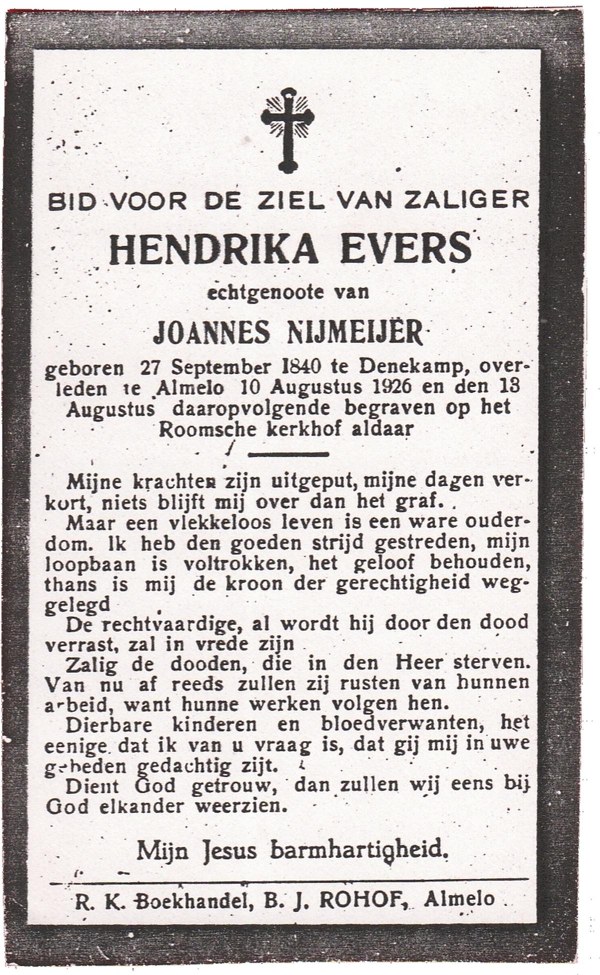 EVERS, Hendrika, geboren op 27-09-1840 te Denekamp, overleden op 10-8-1926 te Almelo op 85-jarige leeftijd, begraven op 13-8-1926 te Almelo.