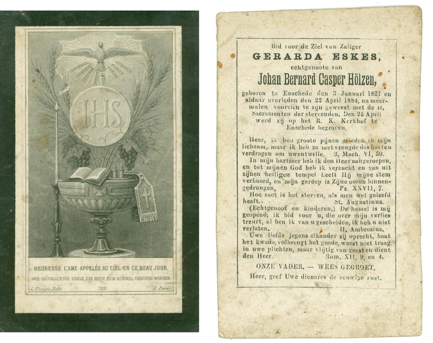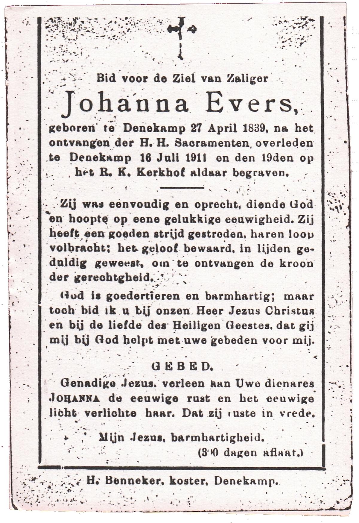 EVERS, Johanna, geboren op 27-04-1839 te Denekamp, overleden op 16-7-1911 te Denekamp op 72-jarige leeftijd, begraven op 19-7-1911 te Denekamp.