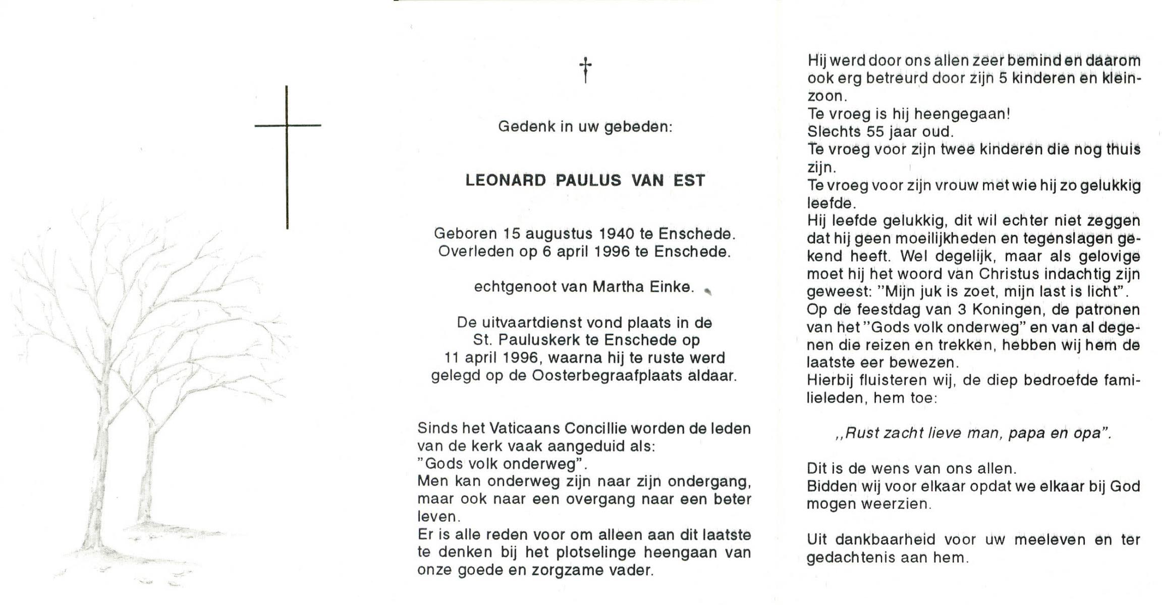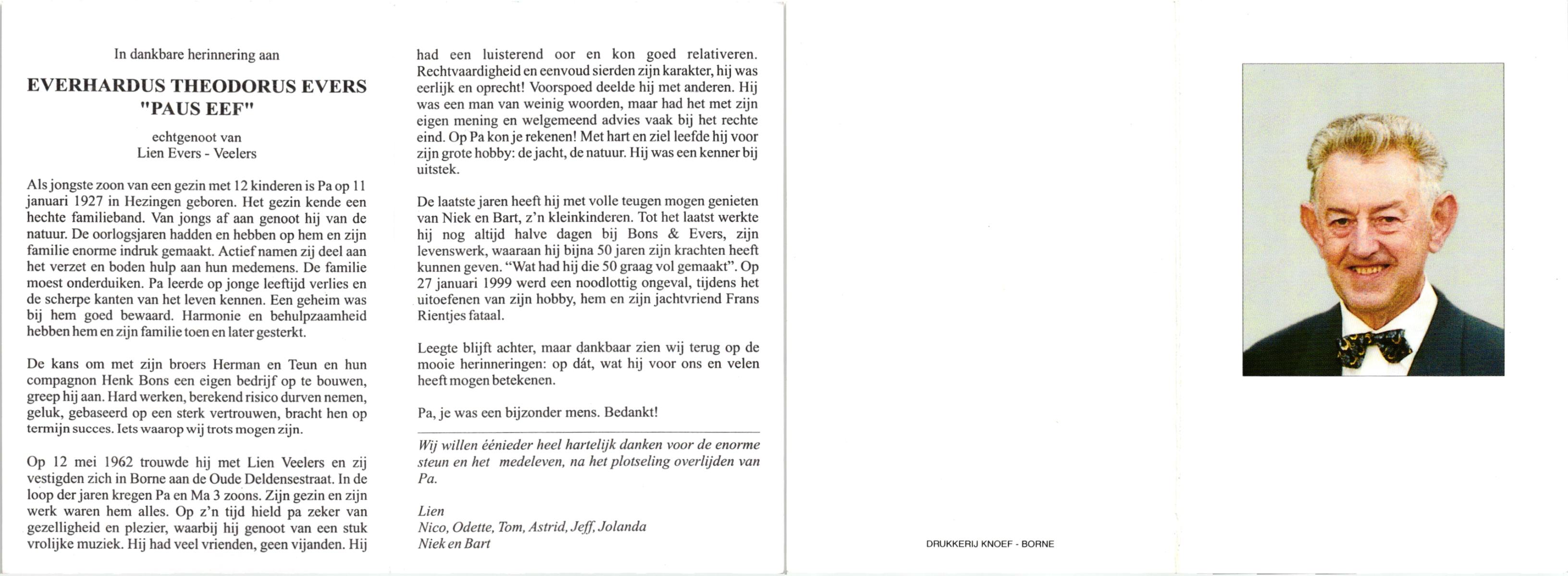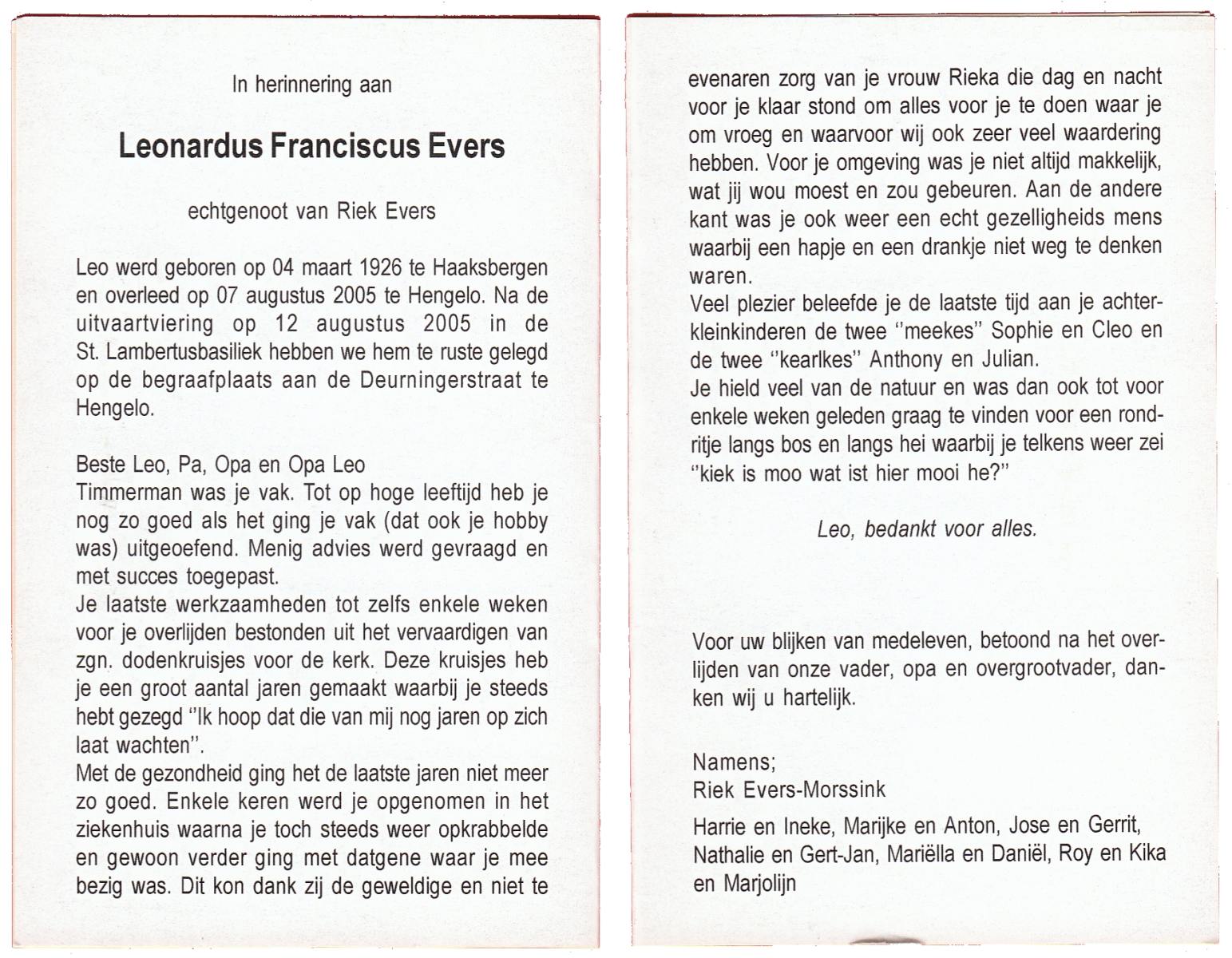 EVERS, Leonardus Franciscus, geboren op 4-3-1926 te Haaksbergen, overleden op 7-8-2005 te Hengelo (Ov.) op 79-jarige leeftijd, begraven op 12-8-2005 te Hengelo (Ov.).