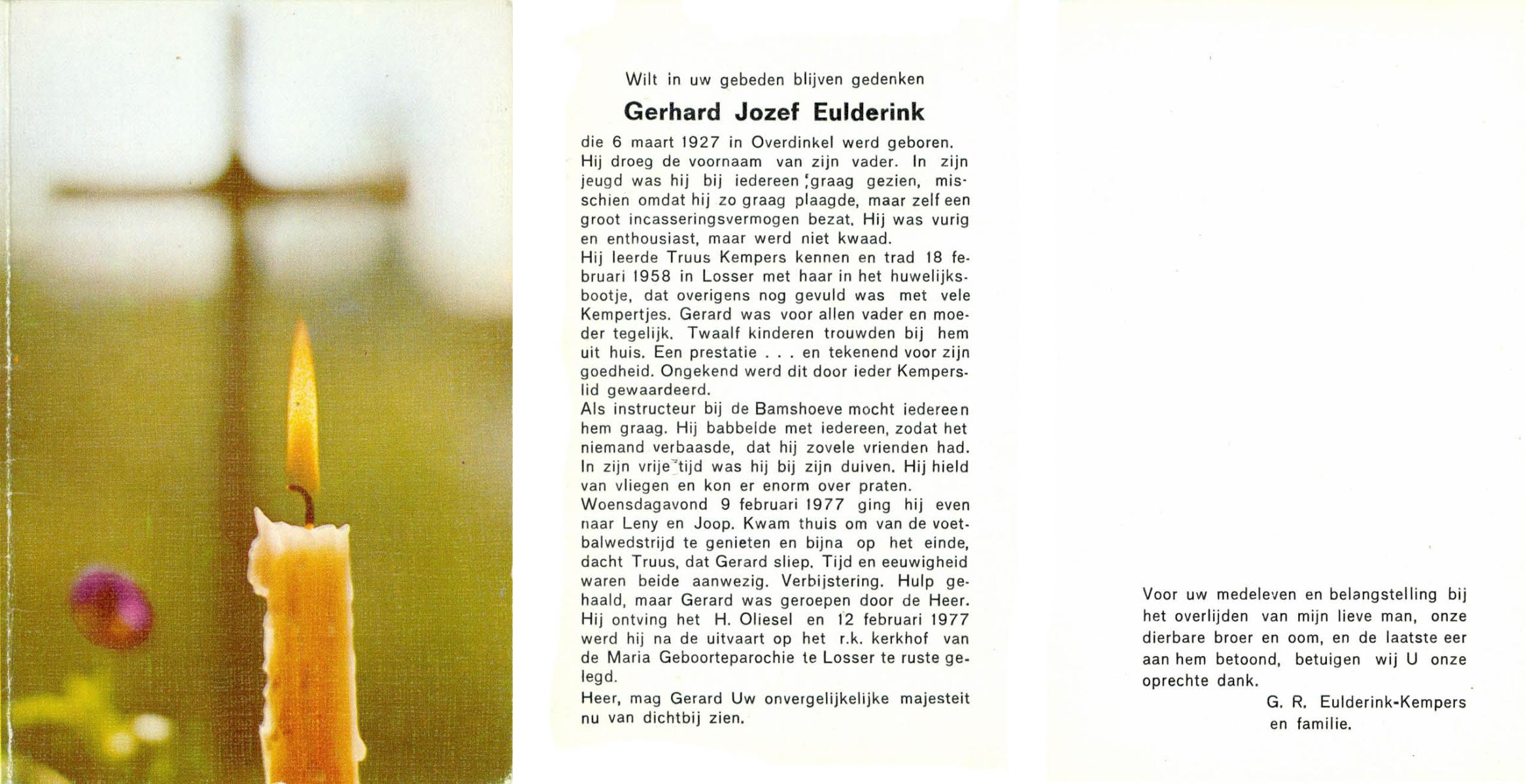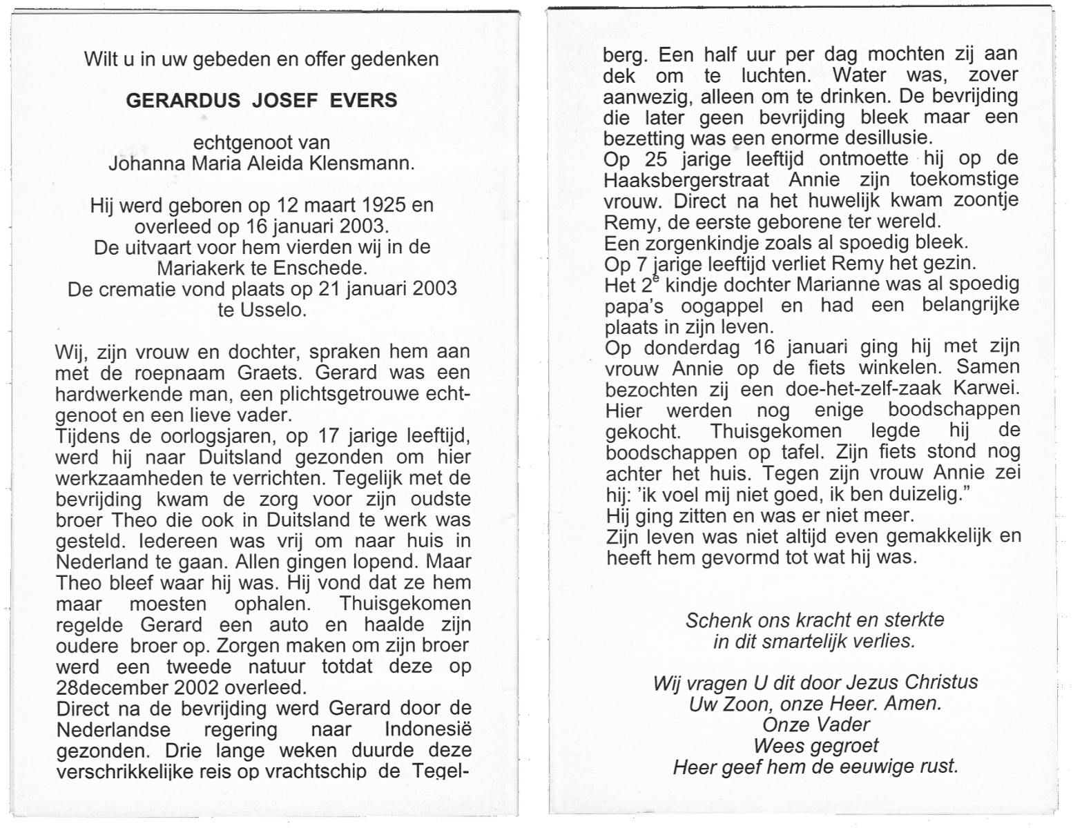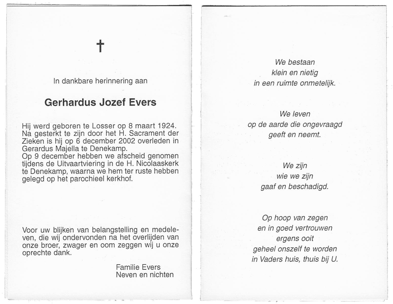 EVERS, Gerhardus Jozef, geboren op 8-3-1924 te Losser, overleden op 6-12-2002 te Denekamp op 78-jarige leeftijd, begraven op 9-12-2002 te Denekamp.