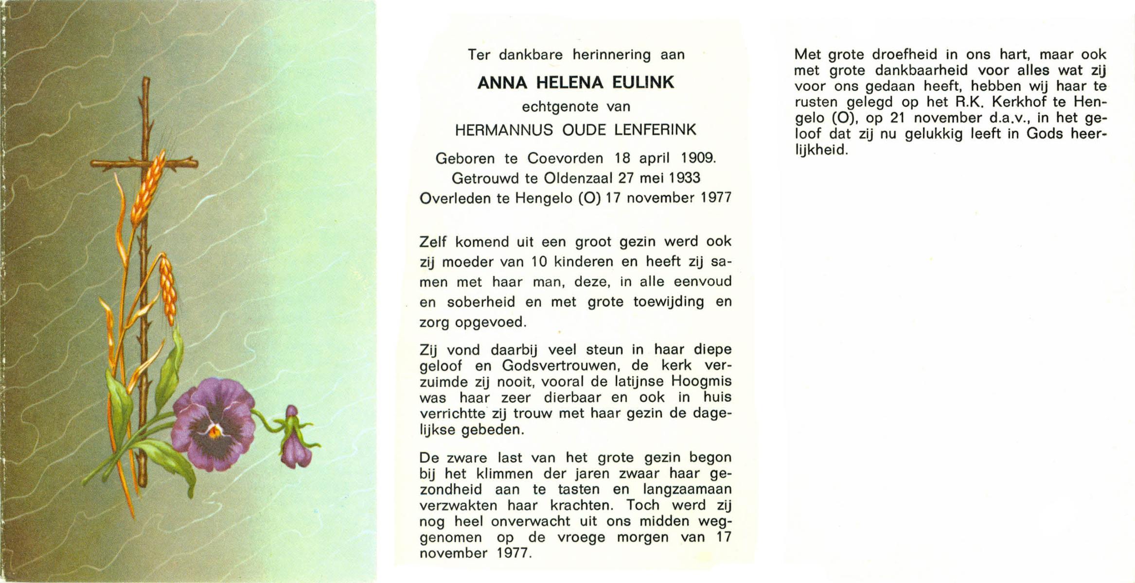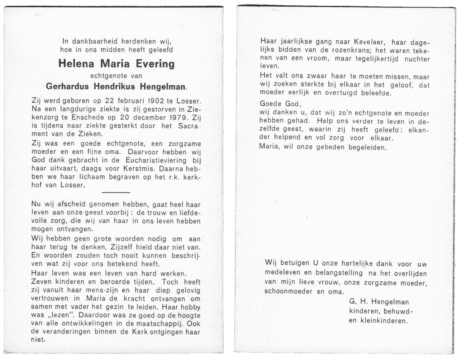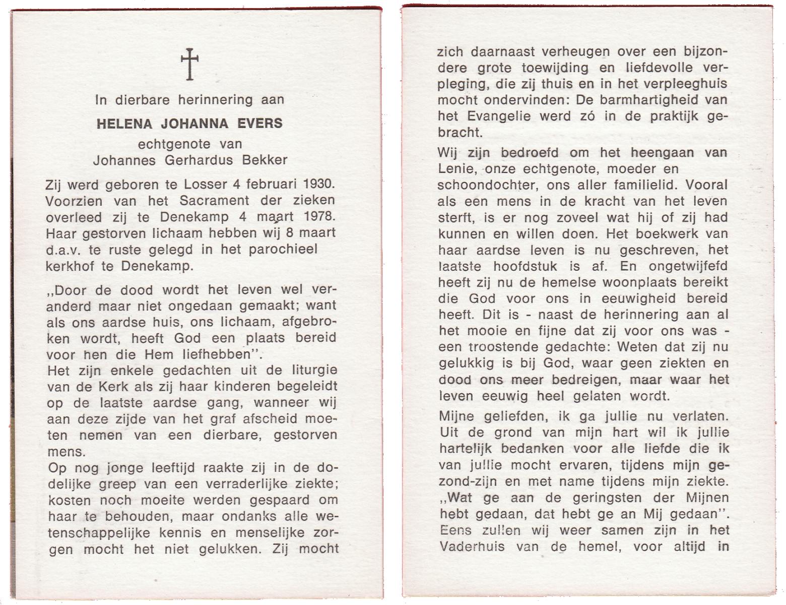EVERS, Helena Johanna, geboren op 4-2-1930 te Losser, overleden op 4-3-1978 te Denekamp op 48-jarige leeftijd, begraven op 8-3-1978 te Denekamp.