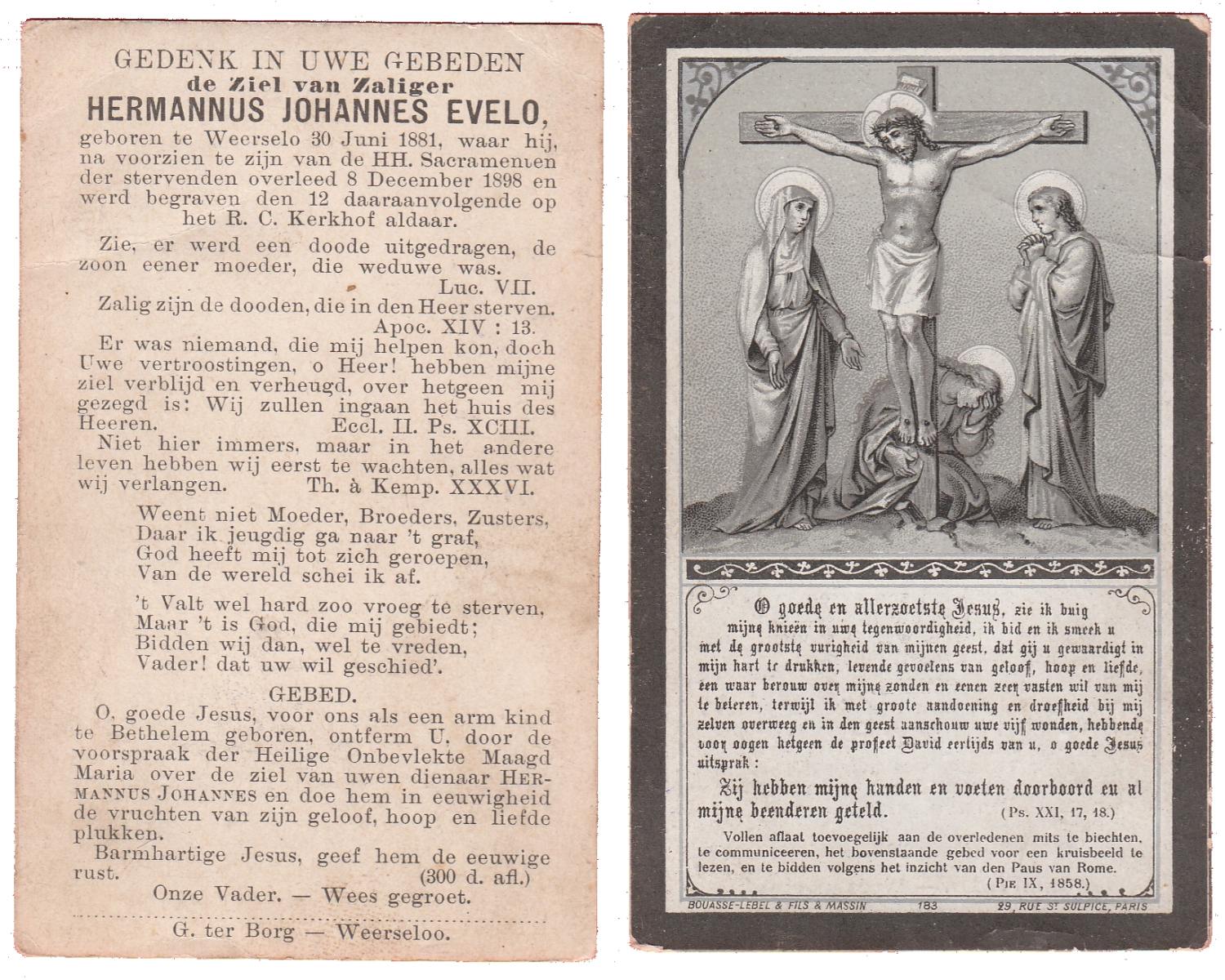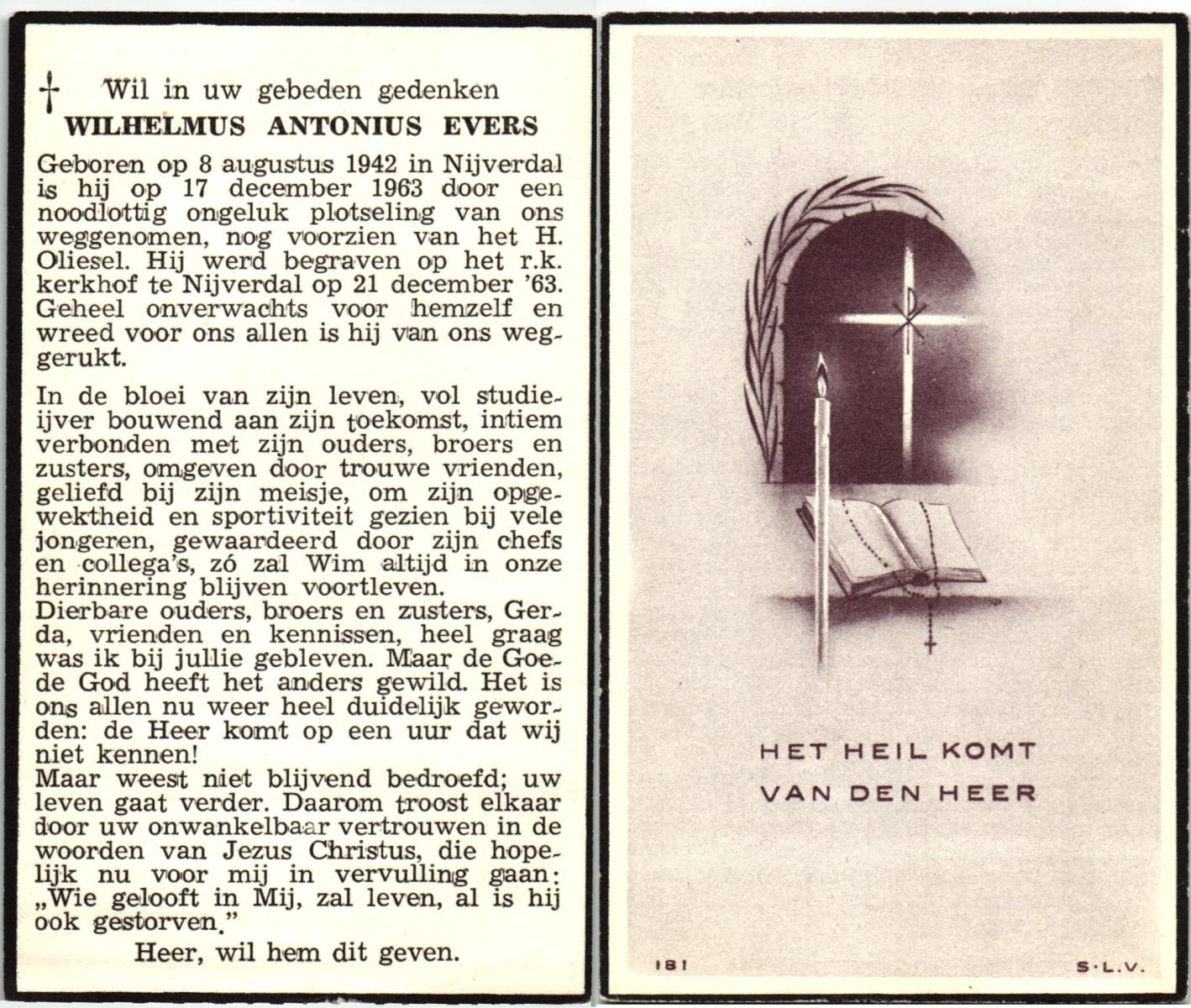 EVERS, Wilhelmus Antonius, geboren op 8-8-1942 te Hellendoorn, Nijverdal, overleden op 17-12-1963 op 21-jarige leeftijd, begraven op 21-12-1963 te Hellendoorn, Nijverdal, rk.