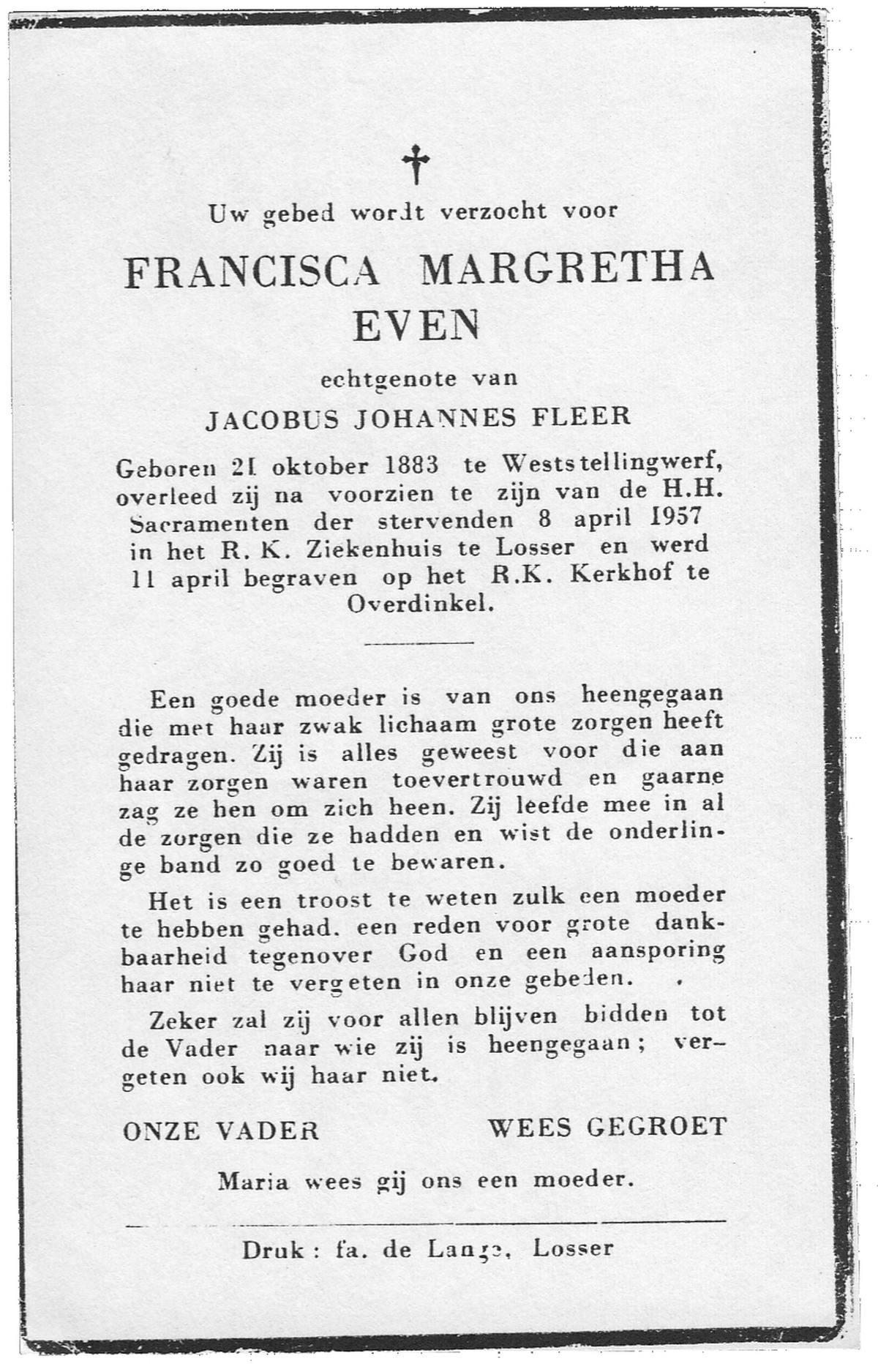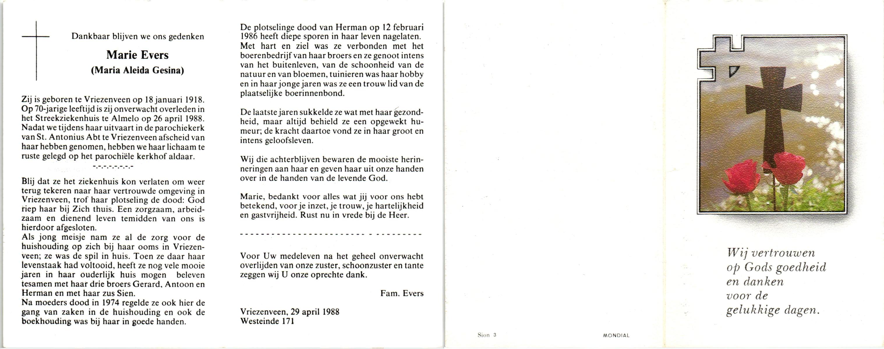 EVERS, Marie (Maria Aleida Gesina), geboren op 18-1-1918 te Vriezenveen, overleden op 26-4-1988 te Almelo, ziekenhuis op 70-jarige leeftijd, begraven te Vriezenveen.