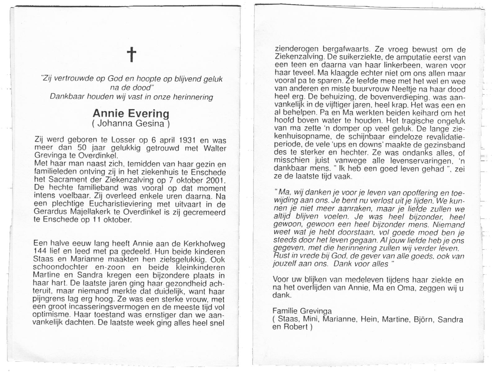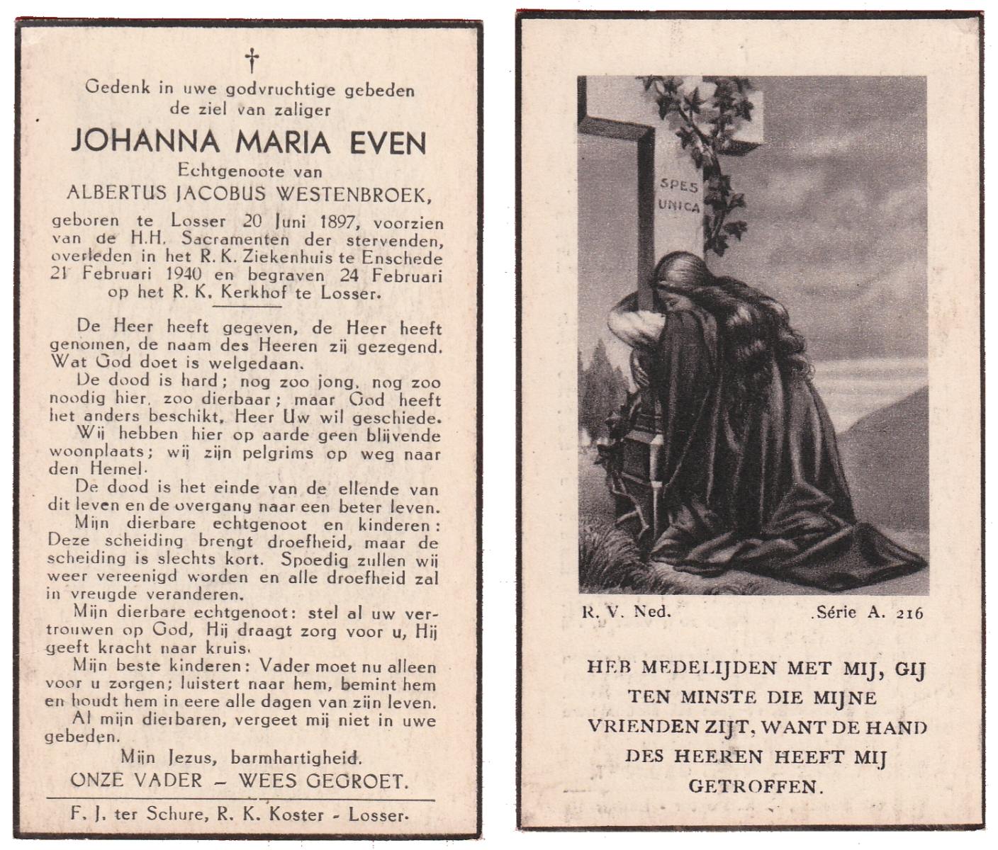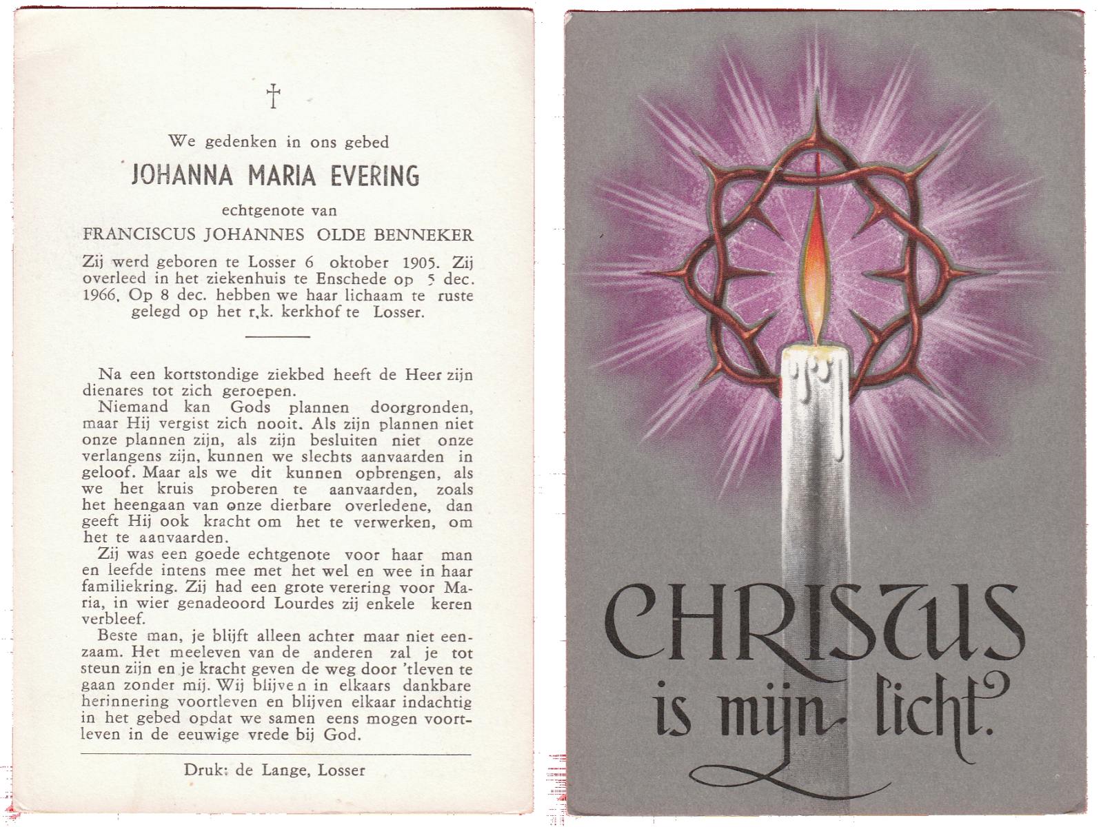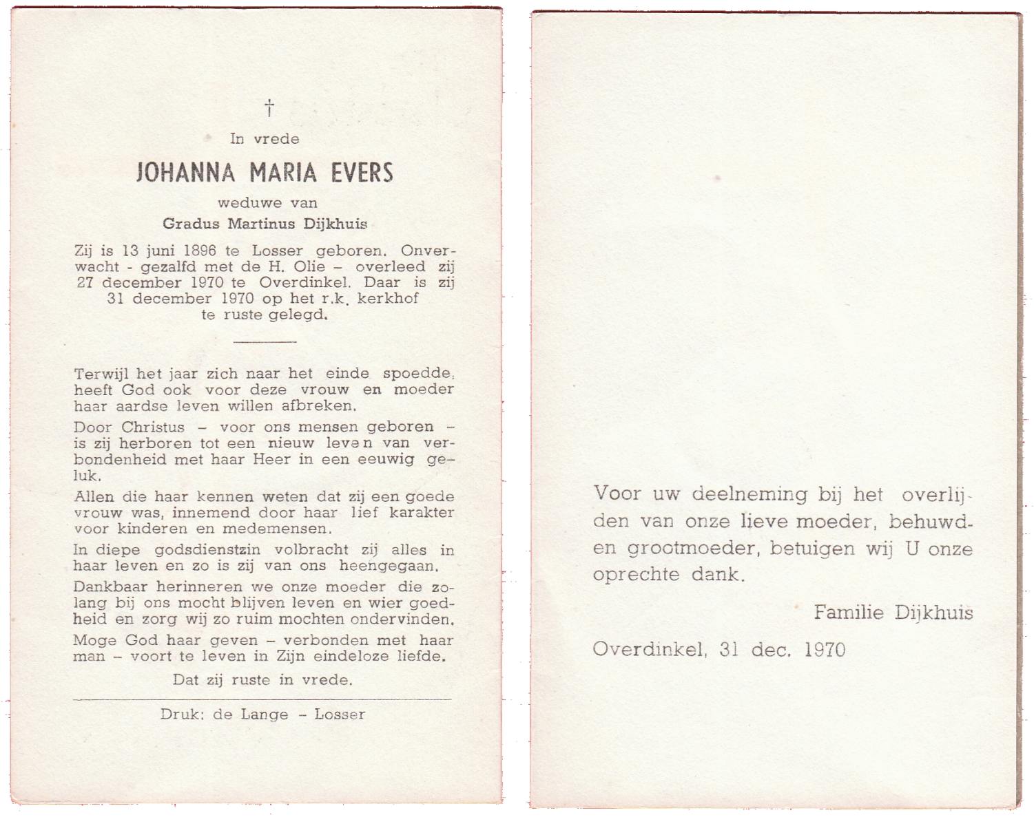 EVERS, Johanna Maria, geboren op 13-06-1896 te Losser, overleden op 27-12-1970 te Overdinkel op 74-jarige leeftijd, begraven op 31-12-1970 te Overdinkel.