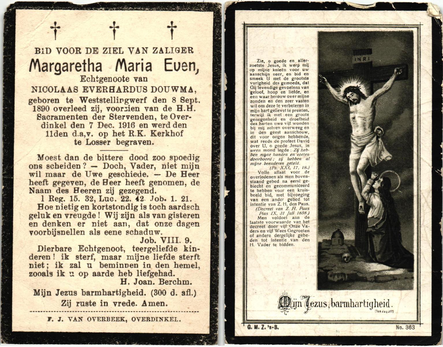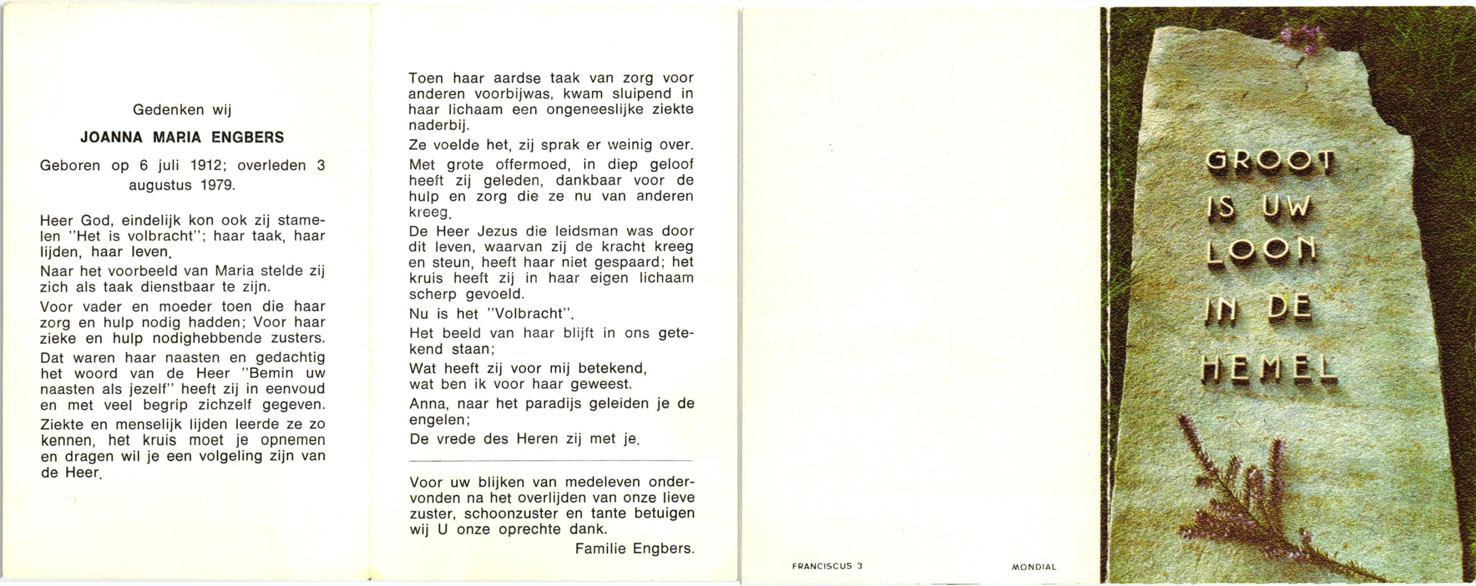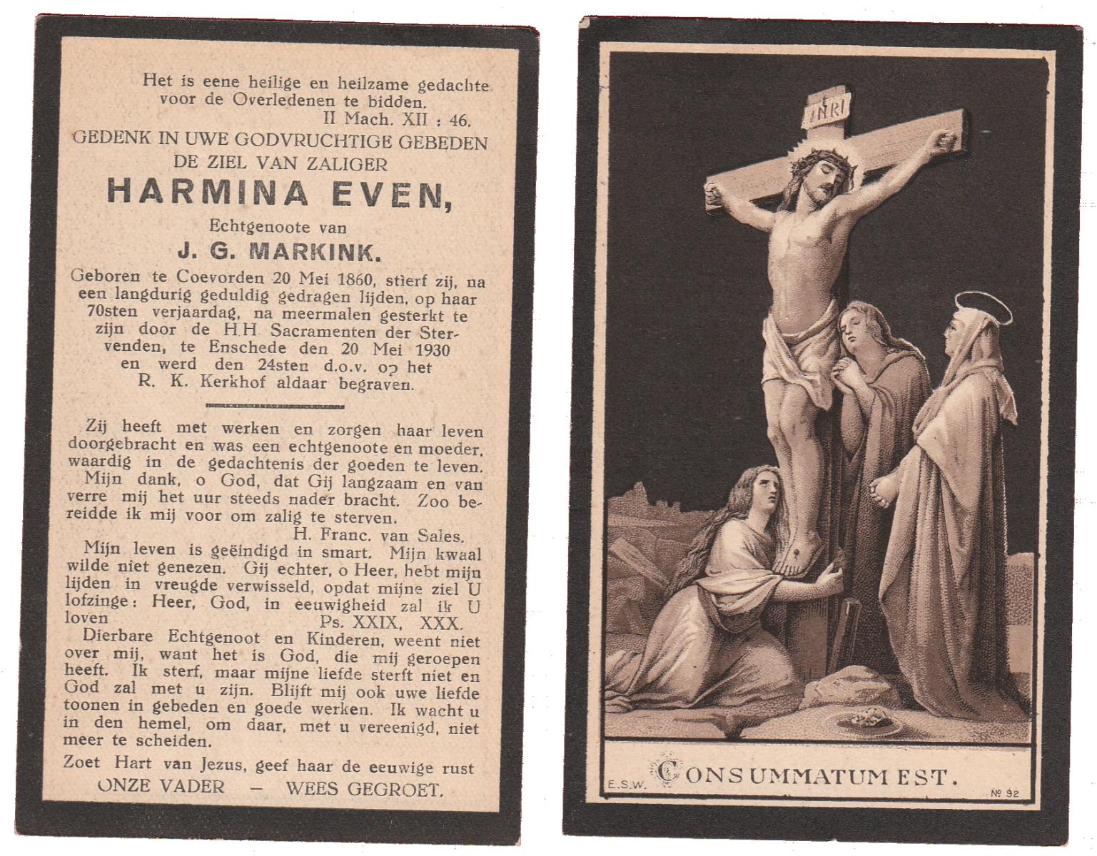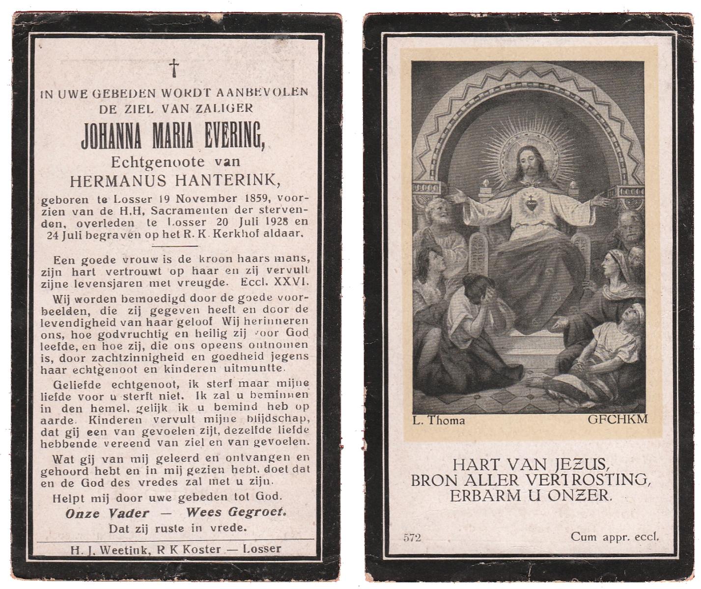 EVERS, Johanna Maria, geboren op 13-06-1896 te Losser, overleden op 27-12-1970 te Overdinkel op 74-jarige leeftijd, begraven op 31-12-1970 te Overdinkel.