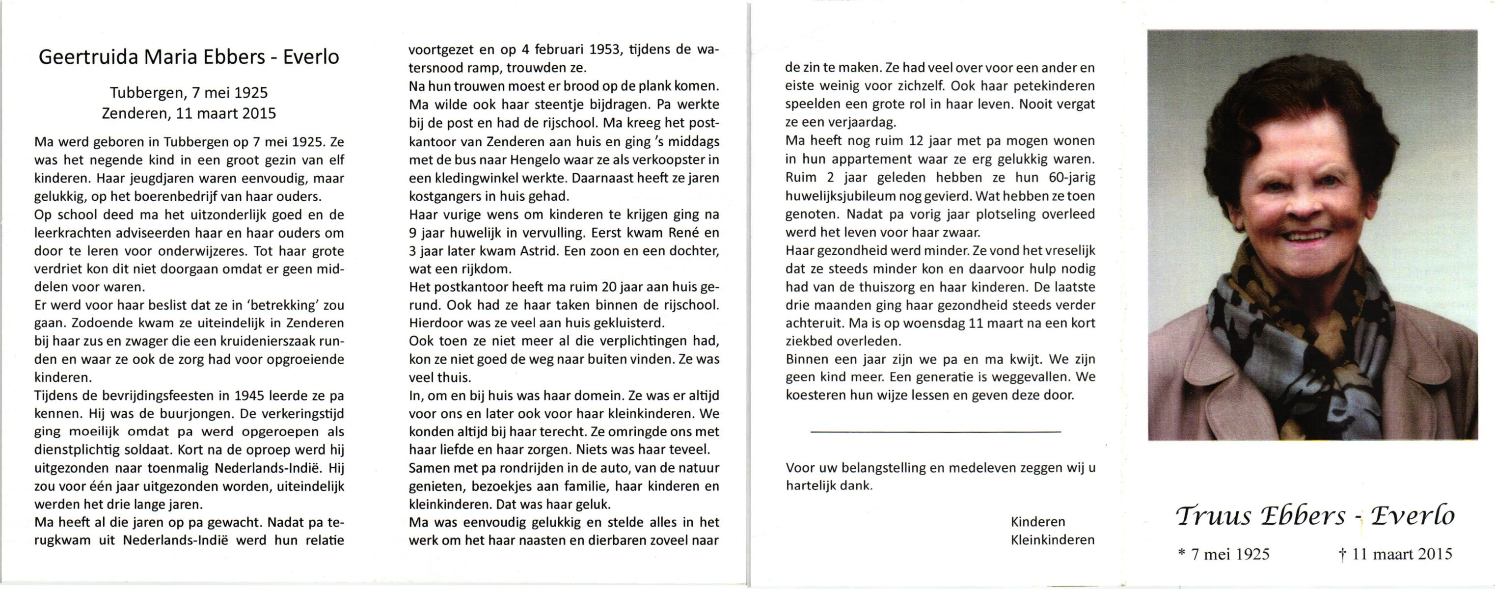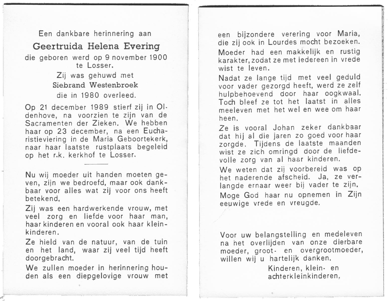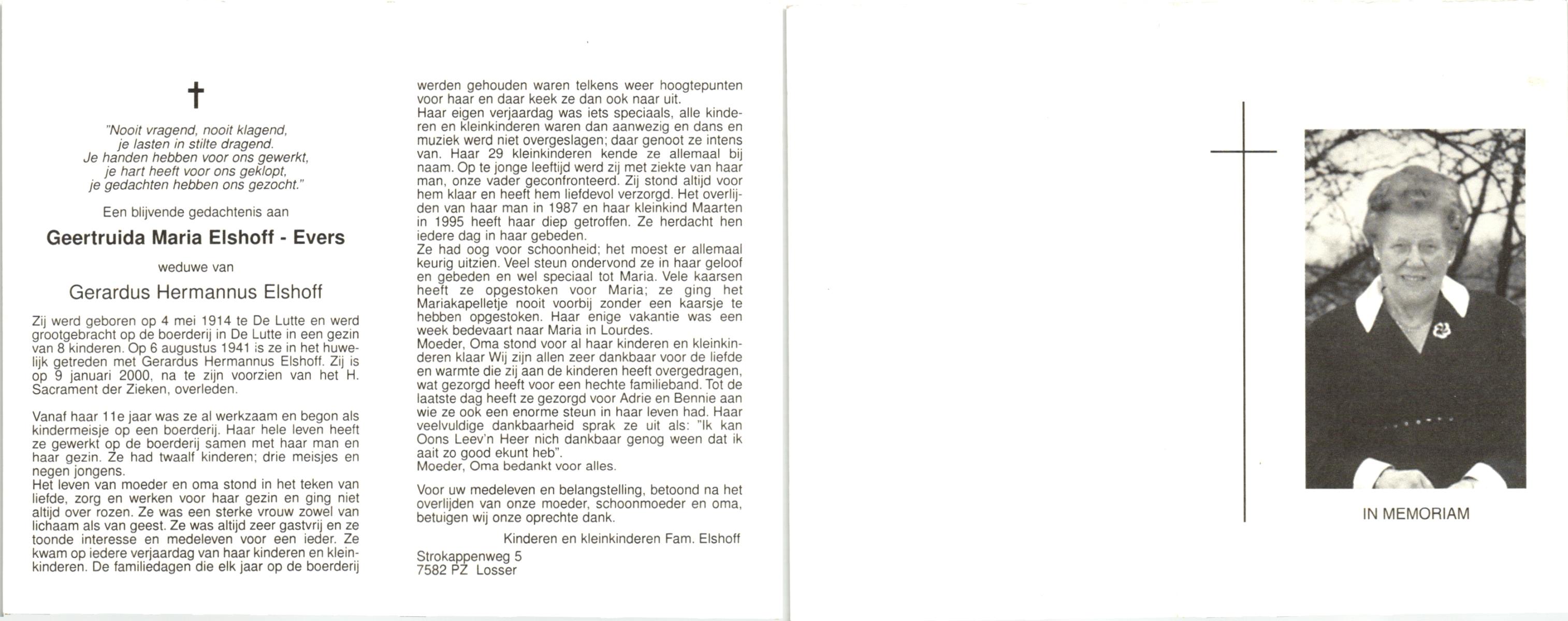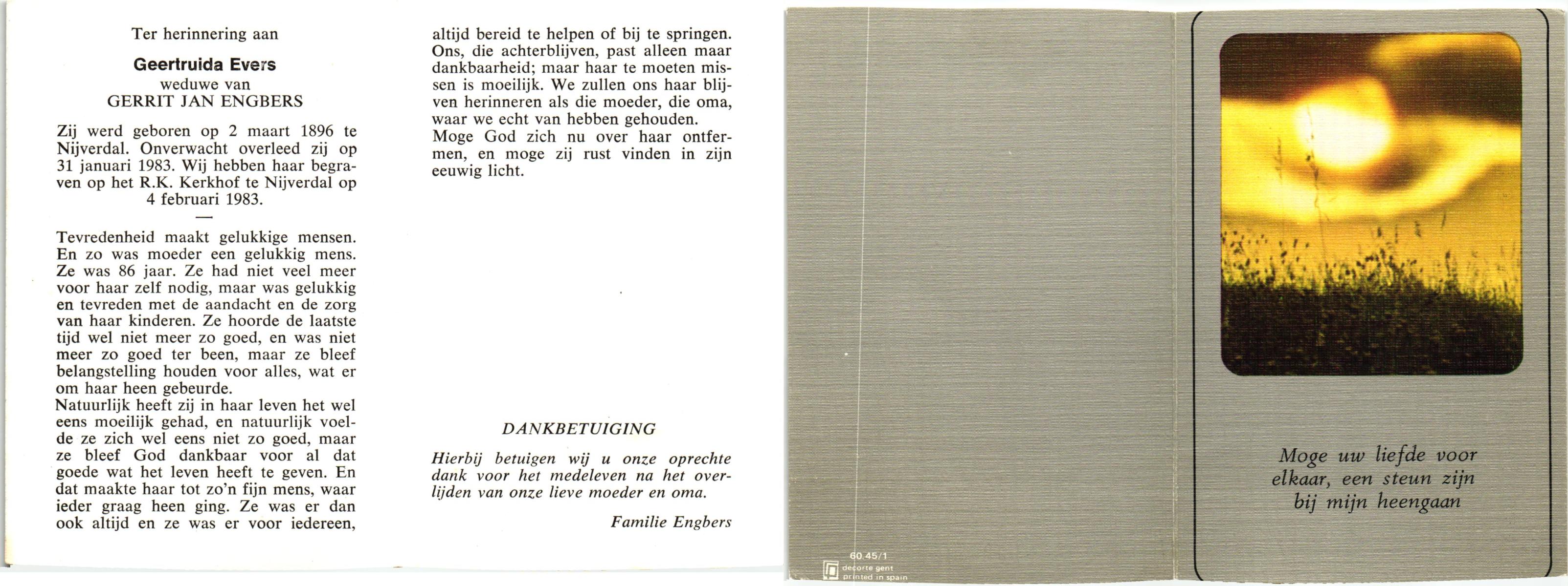EVERS, , Geertruida Maria, geboren op 4-5-1914 te De Lutte, overleden op 9-1-2000 op 85-jarige leeftijd.