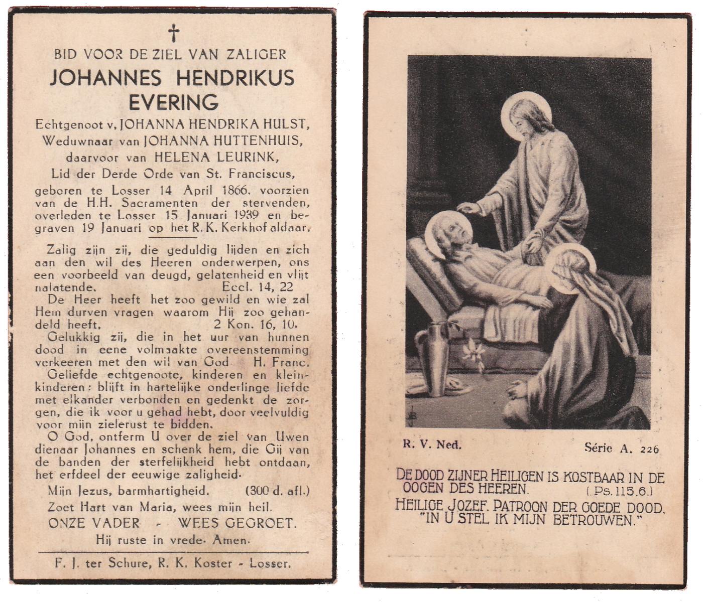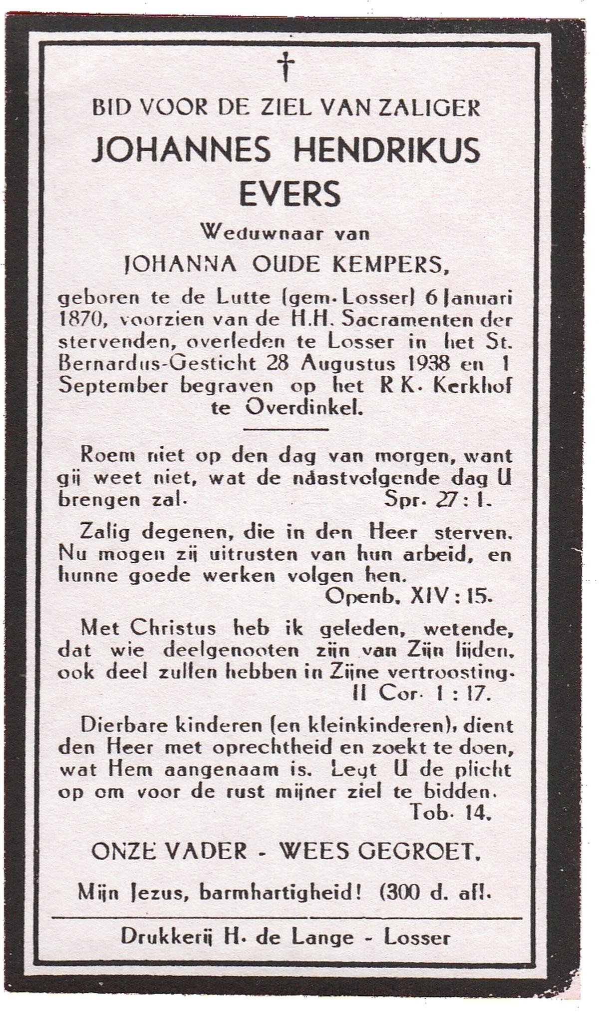 EVERS, Johannes Hendrikus, geboren op 06-01-1870 te De Lutte, overleden op 28-8-1938 te Losser op 68-jarige leeftijd, begraven op 1-9-1938 te Overdinkel.