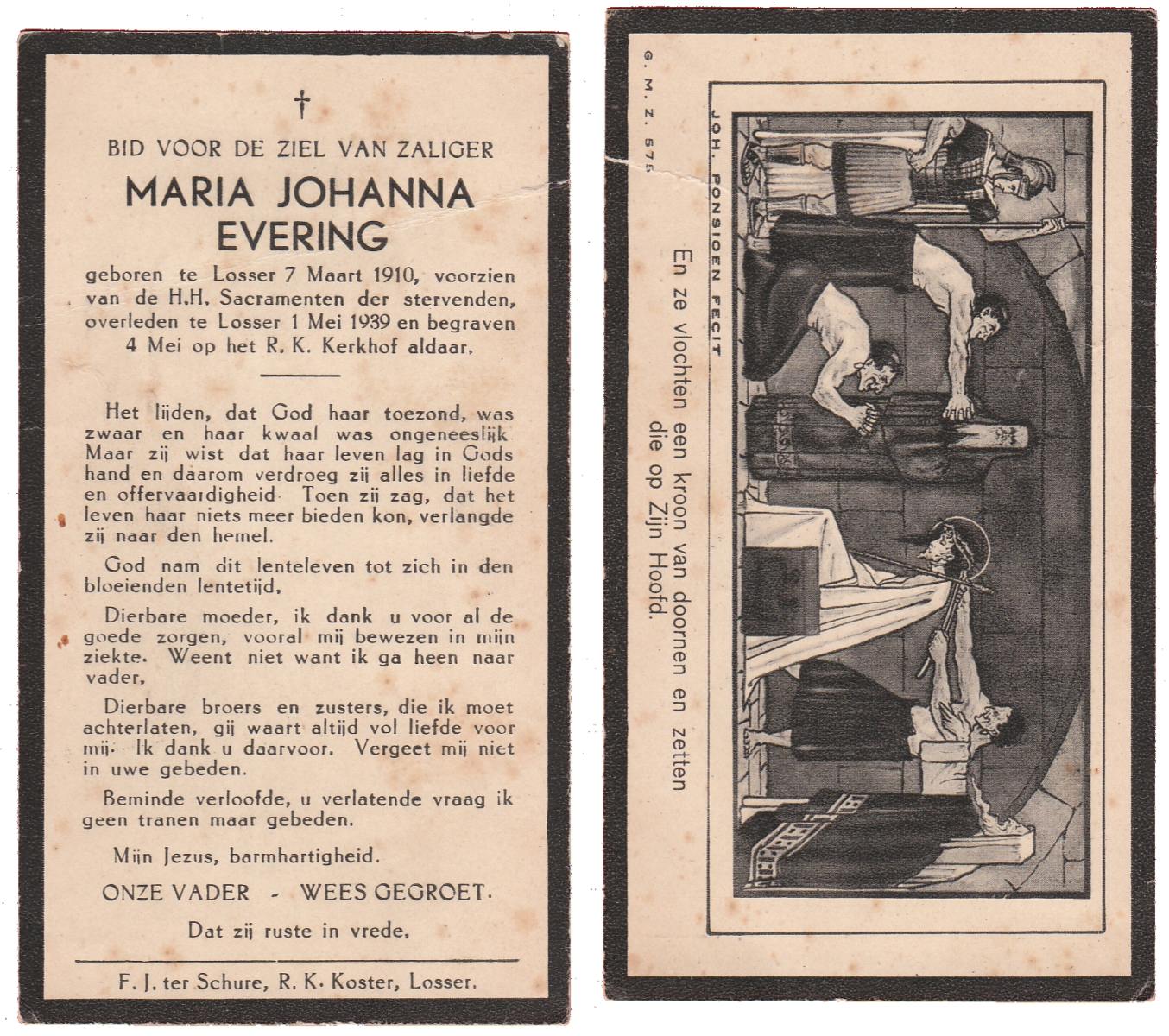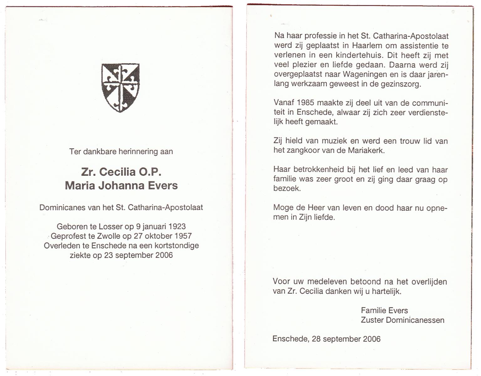 EVERS, Maria Johanna, geboren op 9-1-1923 te Losser, overleden op 23-9-2006 te Enschede op 83-jarige leeftijd.