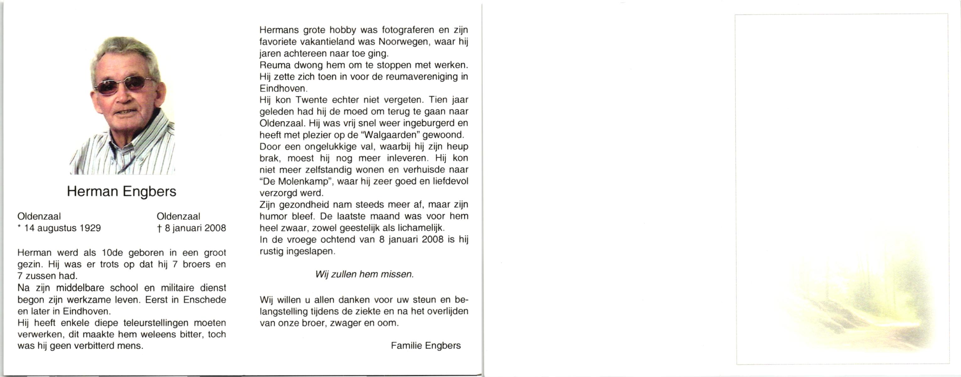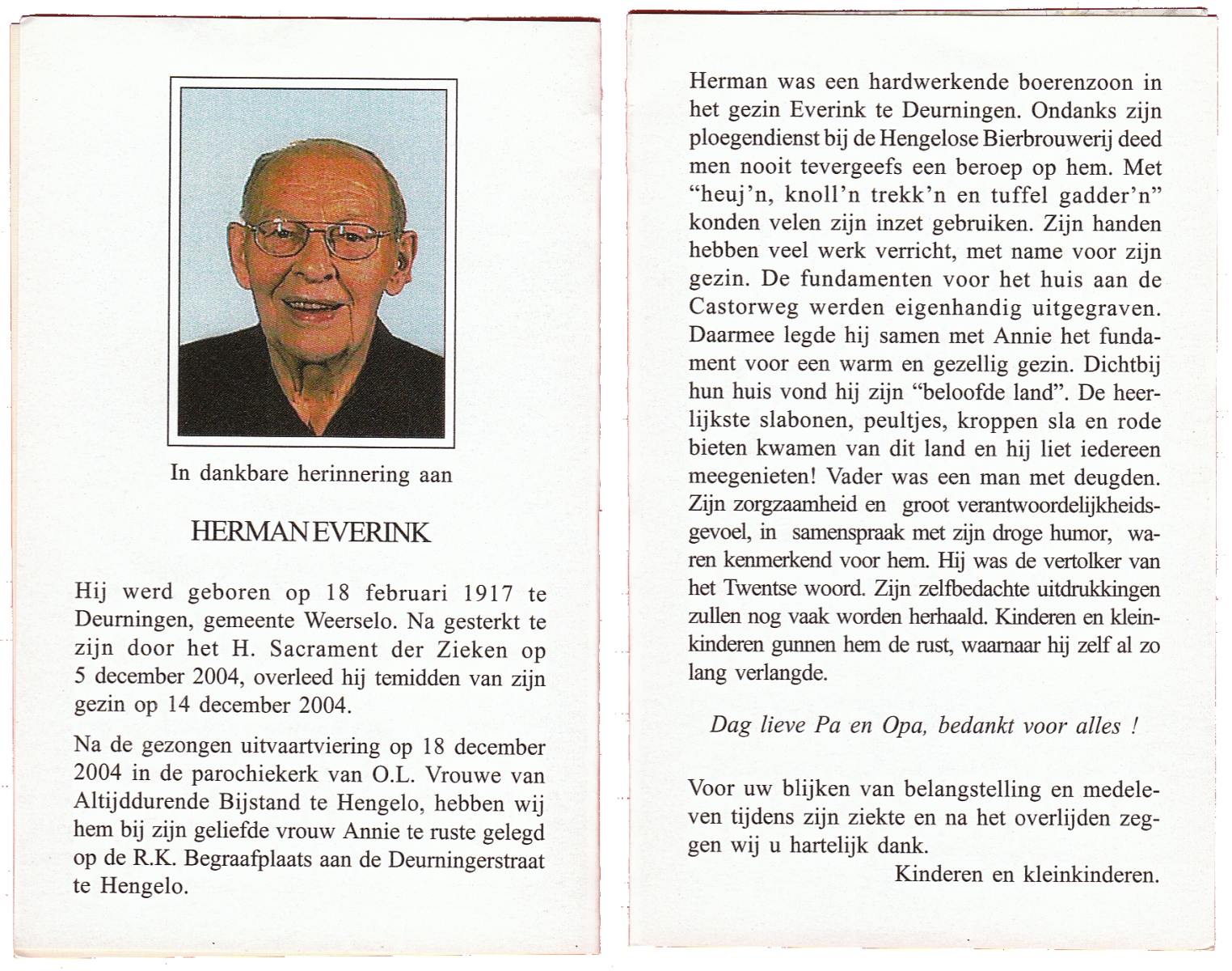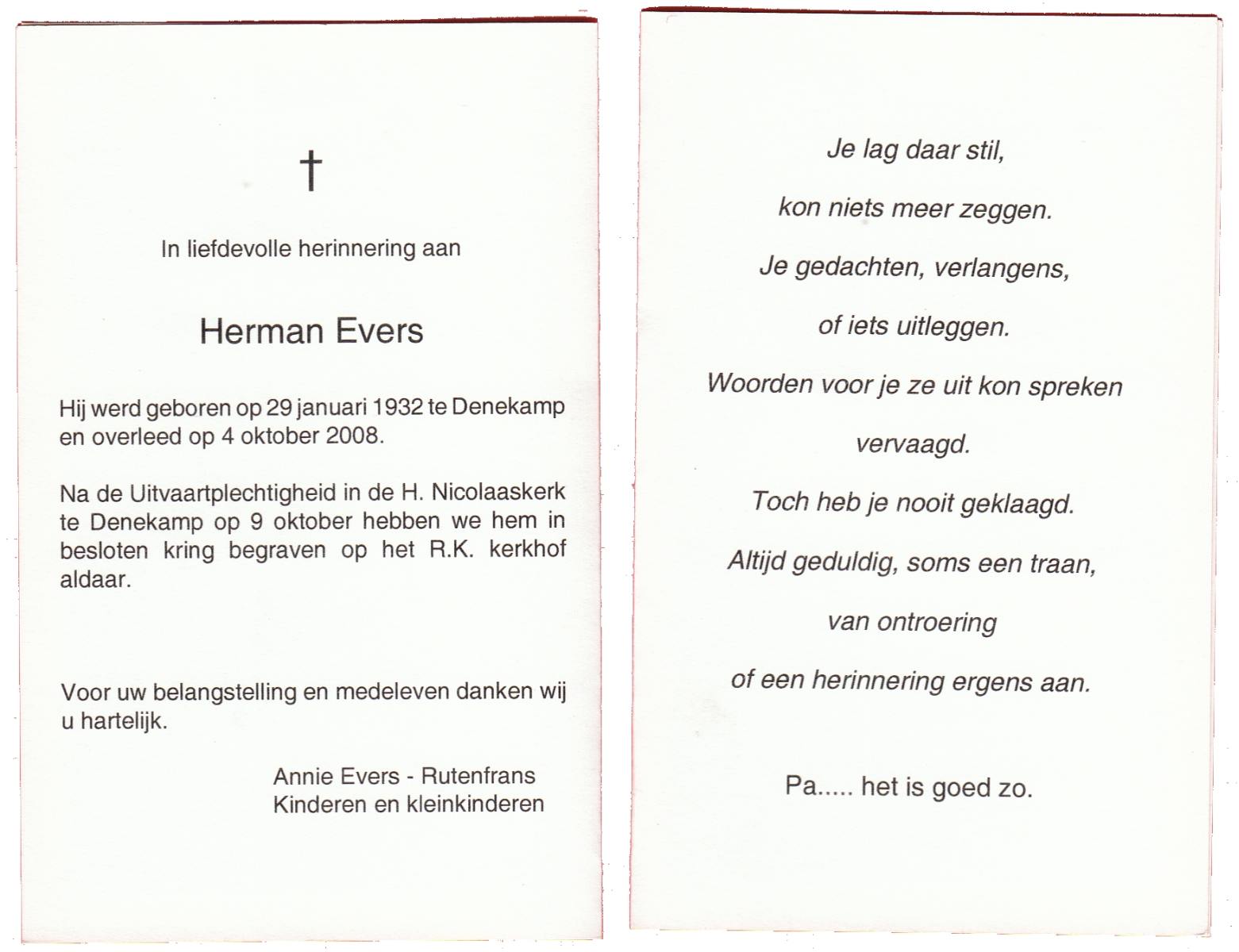 EVERS, Herman, geboren op 29-1-1932 te Denekamp, overleden op 4-10-2008 op 76-jarige leeftijd, begraven op 9-10-2008 te Denekamp.