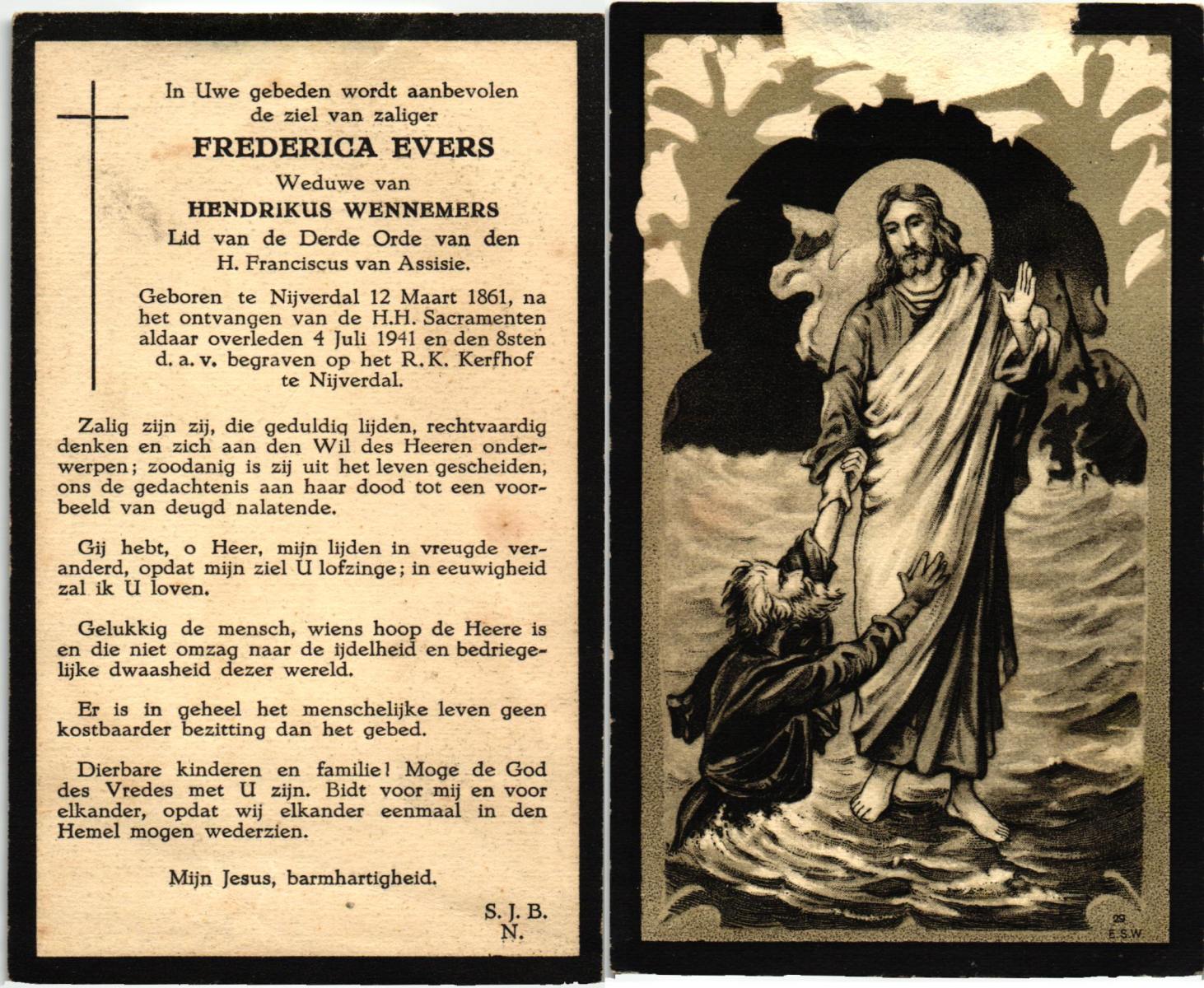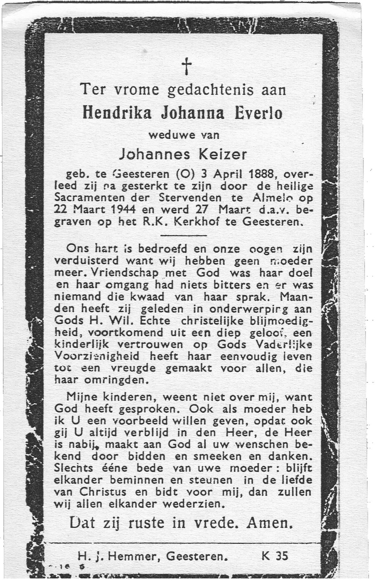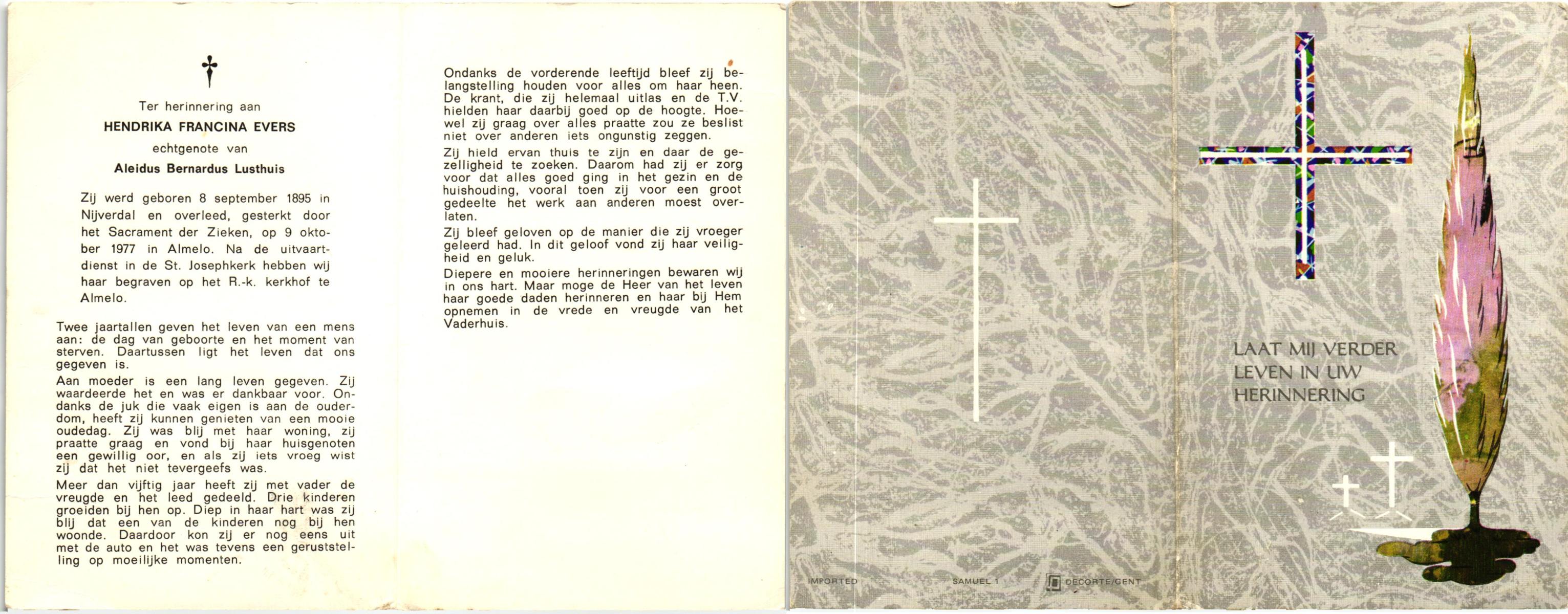 EVERS, Hendrika Francina, geboren op 08-09-1895 te Hellendoorn, Nijverdal, overleden op 9-10-1977 te Almelo op 82-jarige leeftijd, begraven te Almelo.