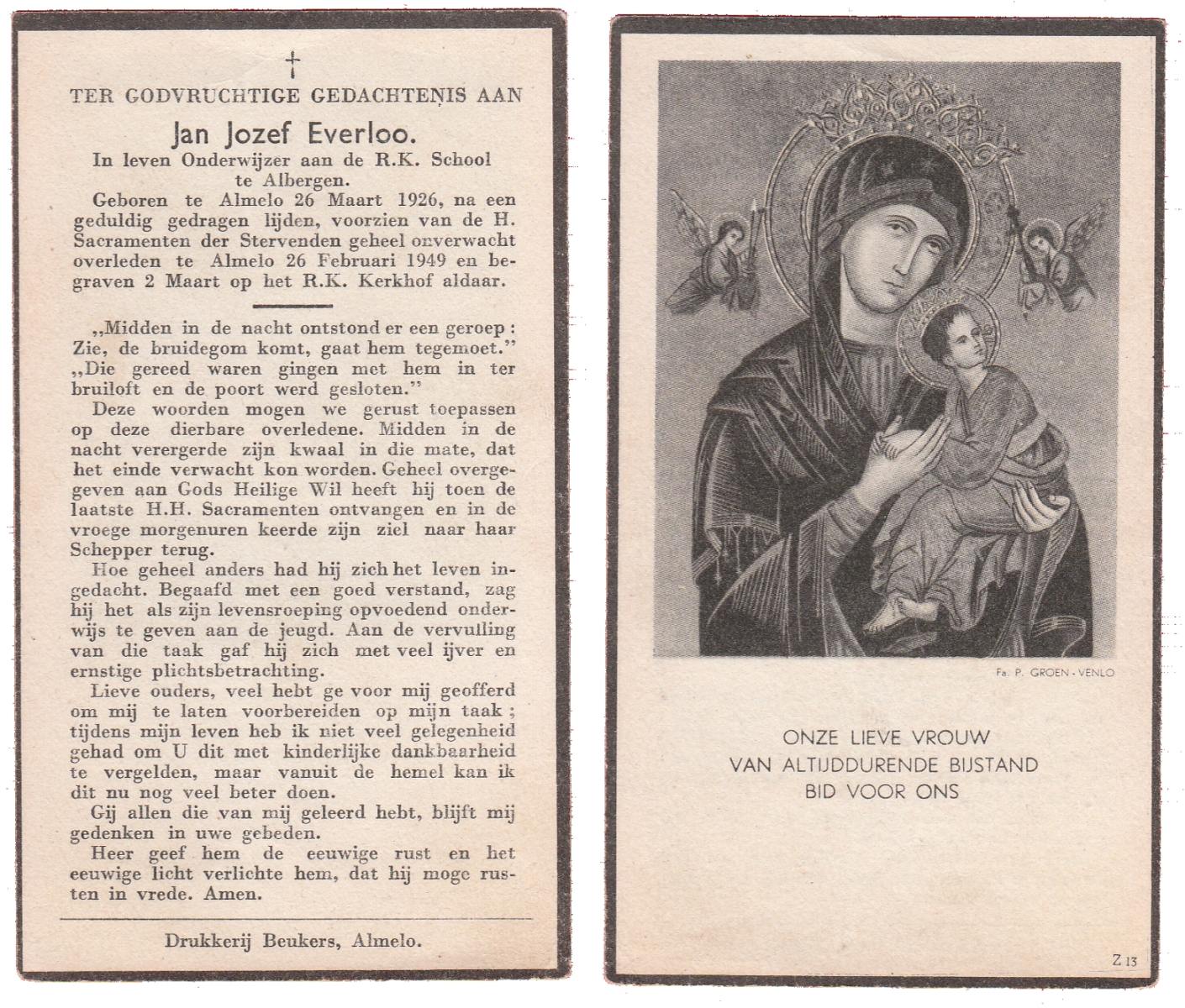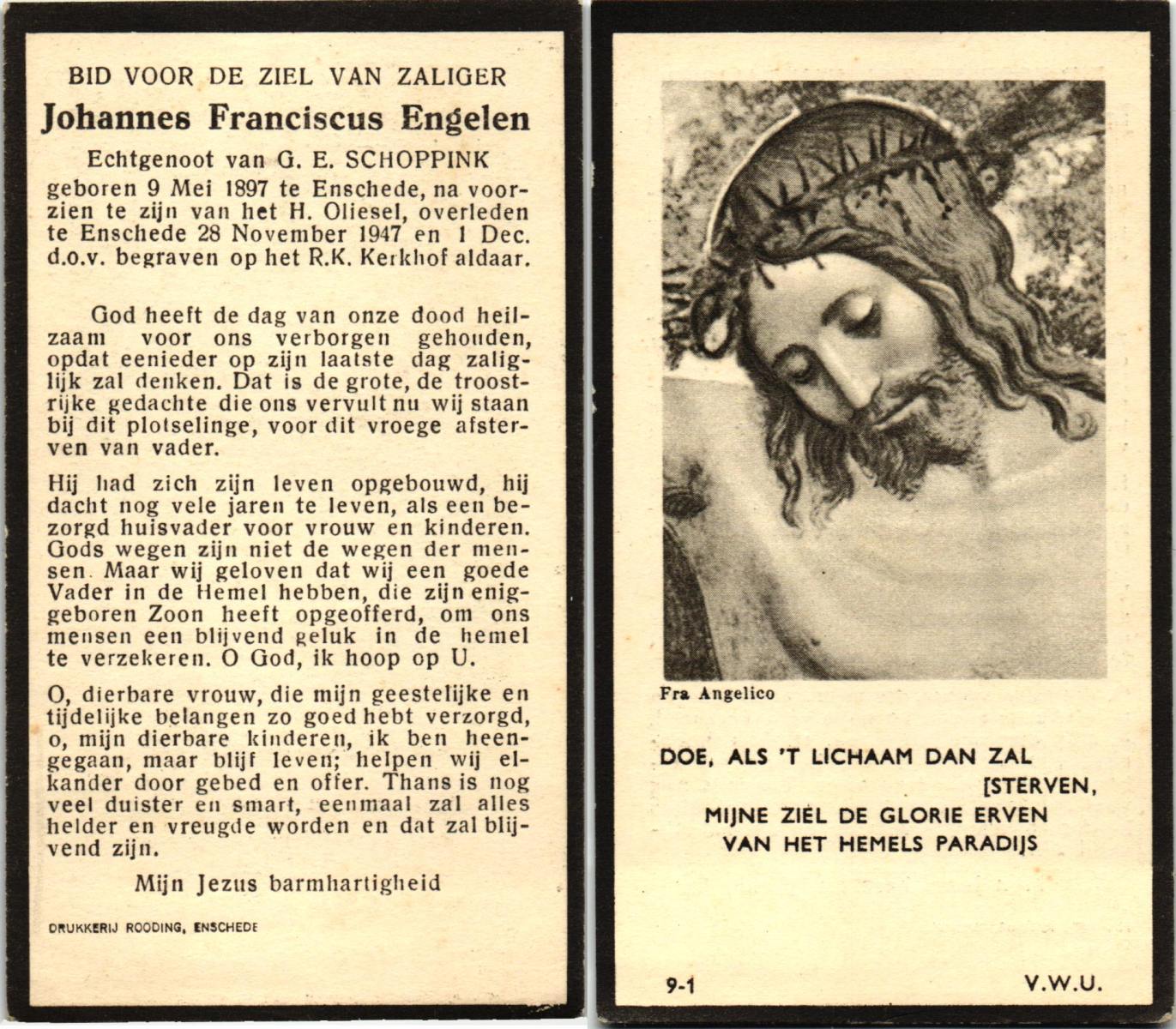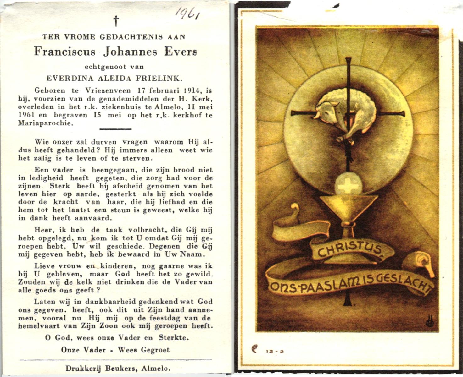 EVERS, , Franciscus Johannes, geboren op 17-2-1914 te Vriezenveen, overleden op 11-5-1961 te Almelo op 47-jarige leeftijd, begraven op 15-5-1961 te Mariaparochie.