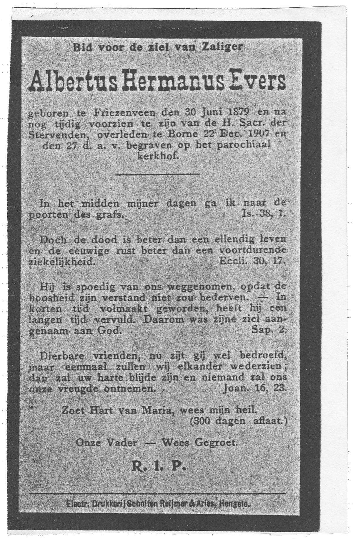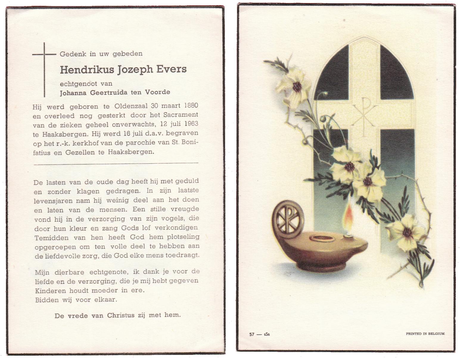 EVERS, Hendrikus Jozeph, geboren op 30-03-1880 te Oldenzaal, overleden op 12-7-1963 te Haaksbergen op 83-jarige leeftijd, begraven op 16-7-1963 te Haaksbergen.