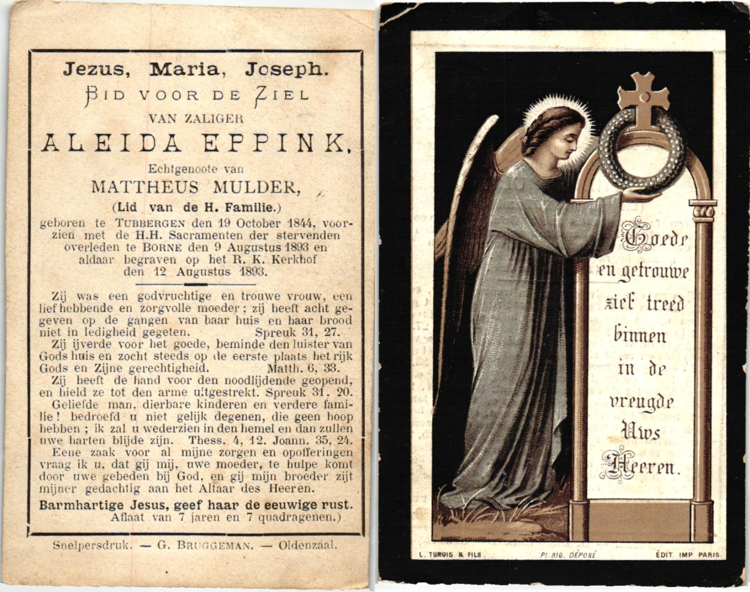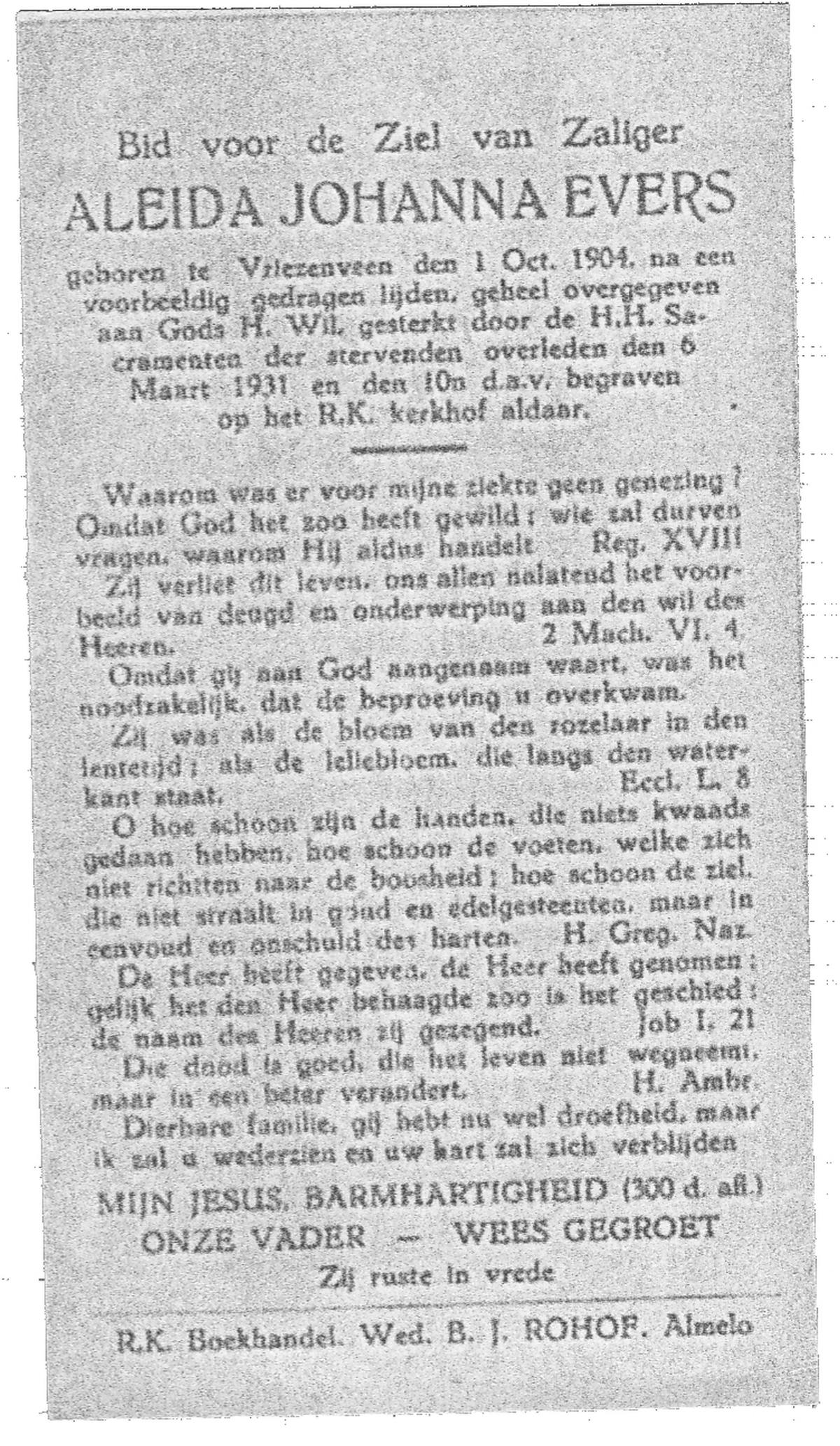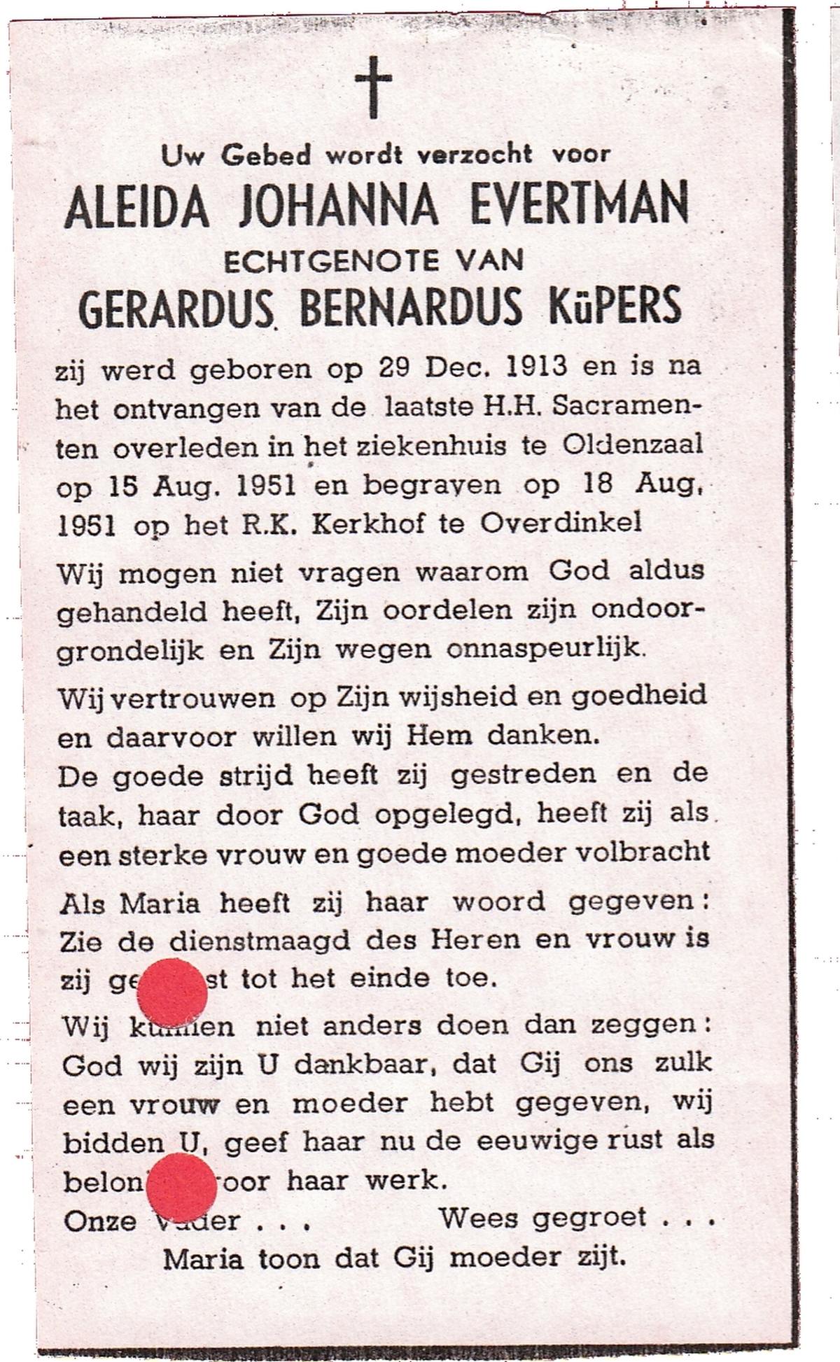 EVERTMAN, Aleida Johanna, geboren op 29-12-1913 te Overdinkel, overleden op 15-8-1951 te Oldenzaal op 37-jarige leeftijd, begraven op 18-8-1951 te Overdinkel.