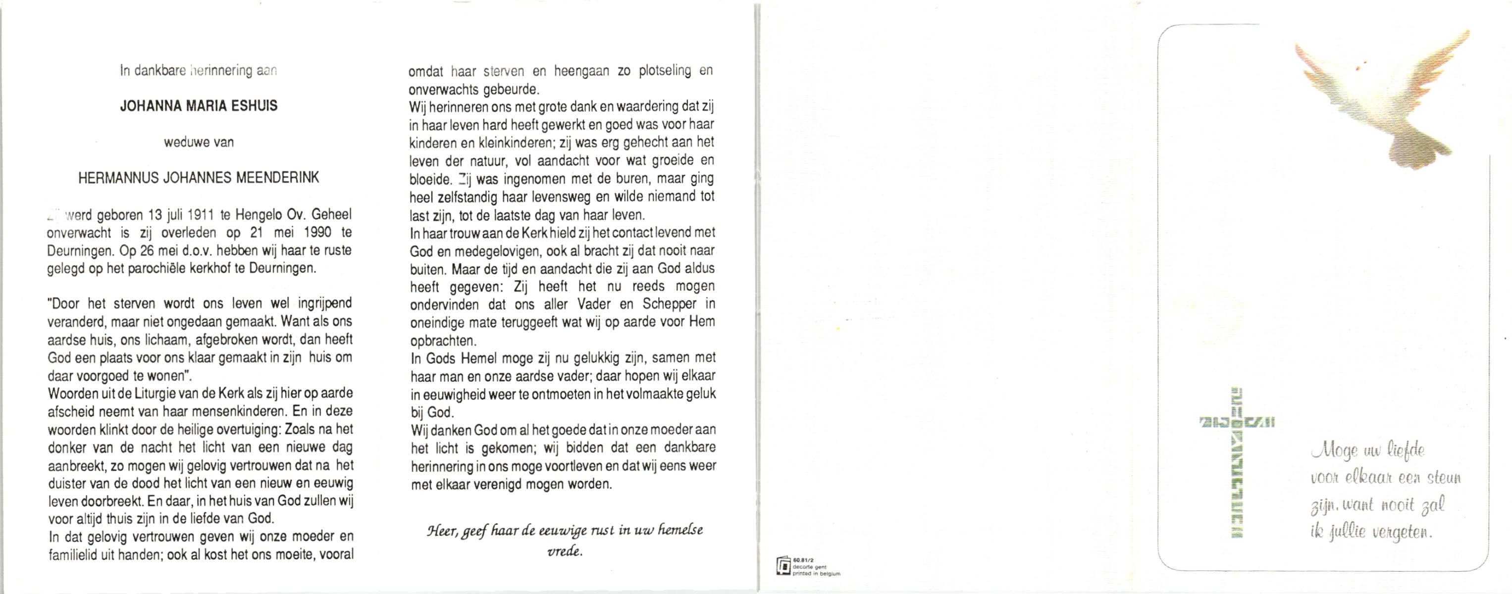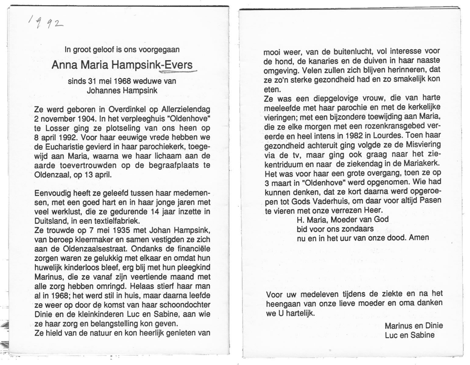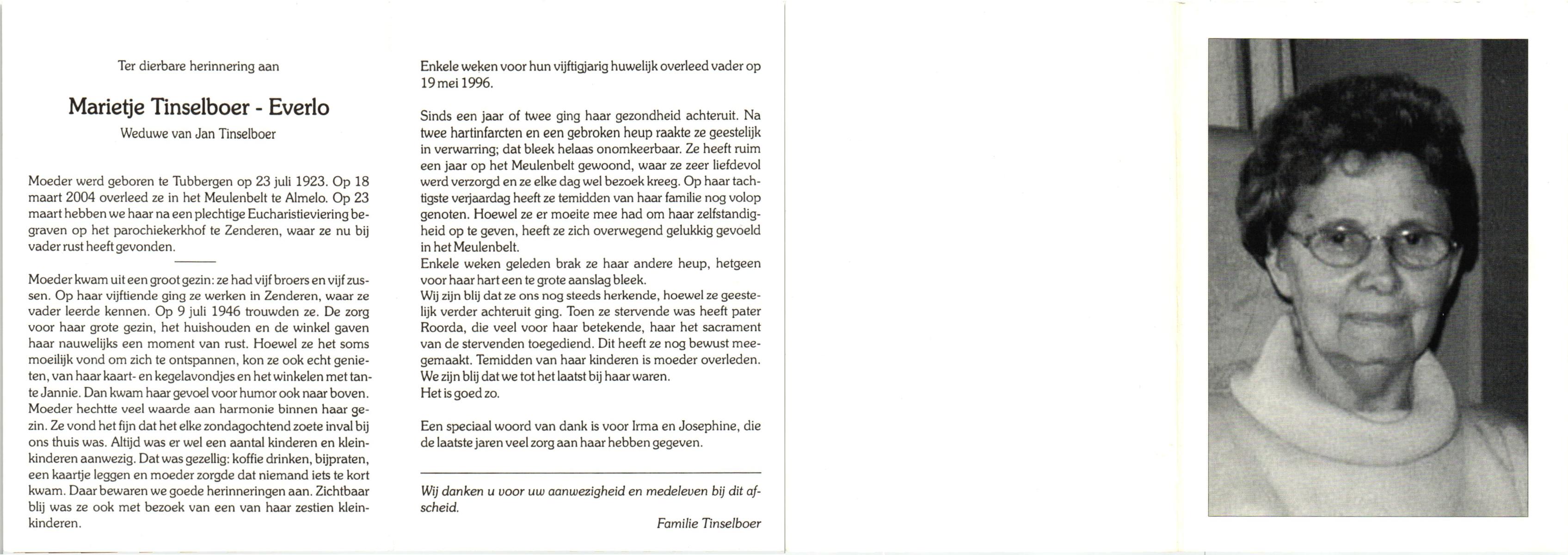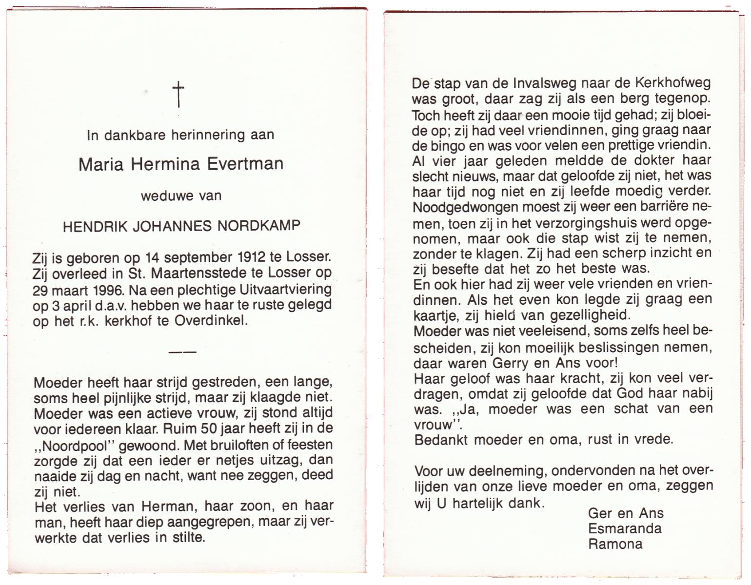 EVERTMAN, Maria Hermina, geboren op 14-9-1912 te Losser, overleden op 29-3-1996 te Losser op 83-jarige leeftijd, begraven op 3-4-1996 te Overdinkel.
