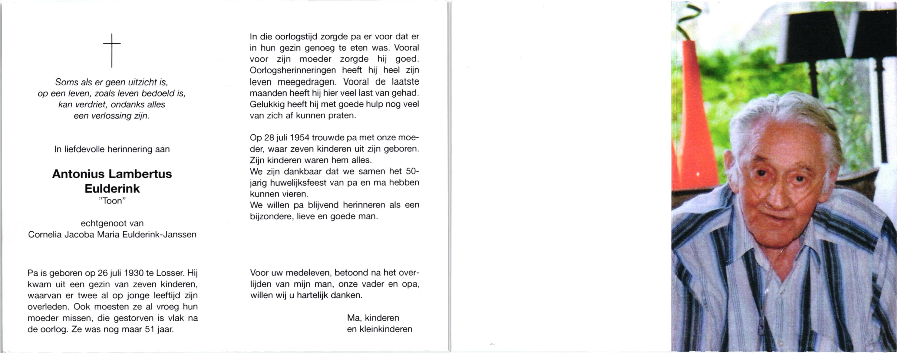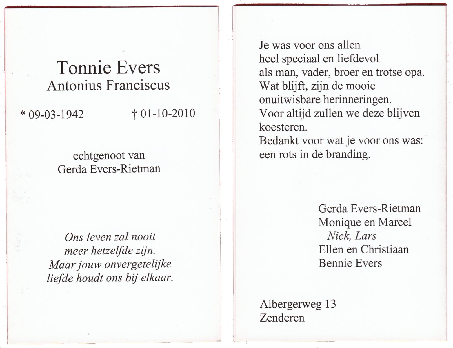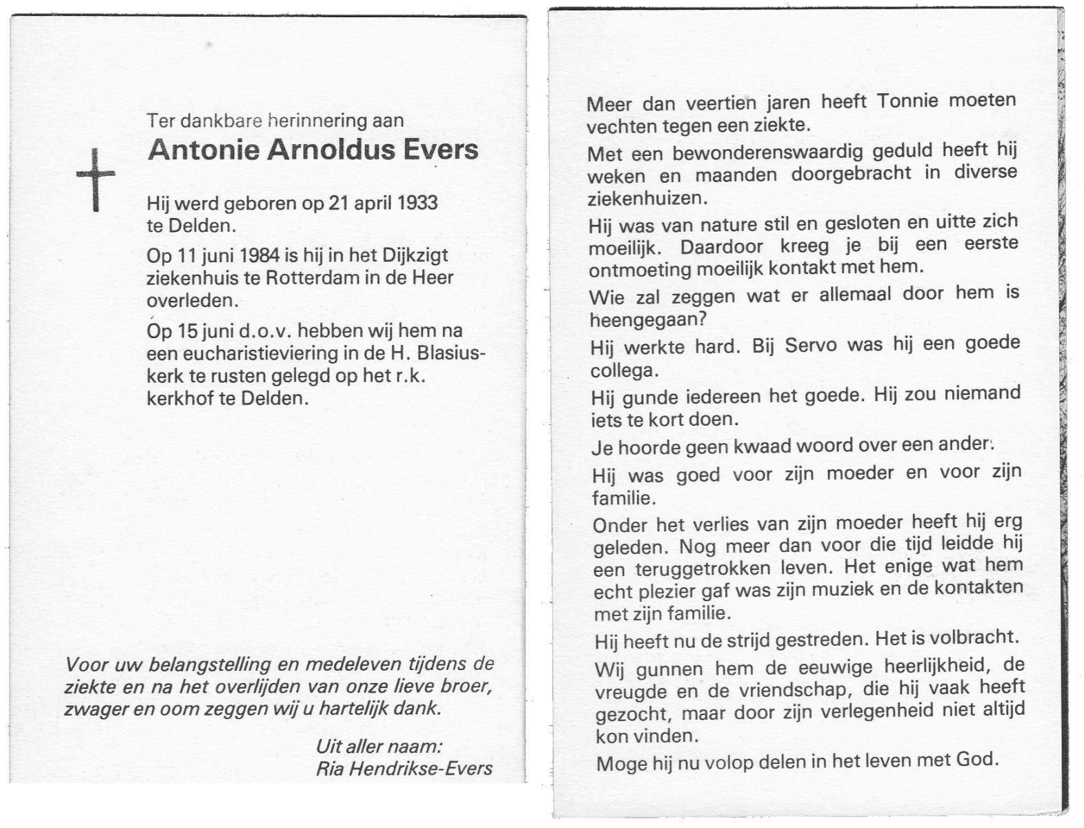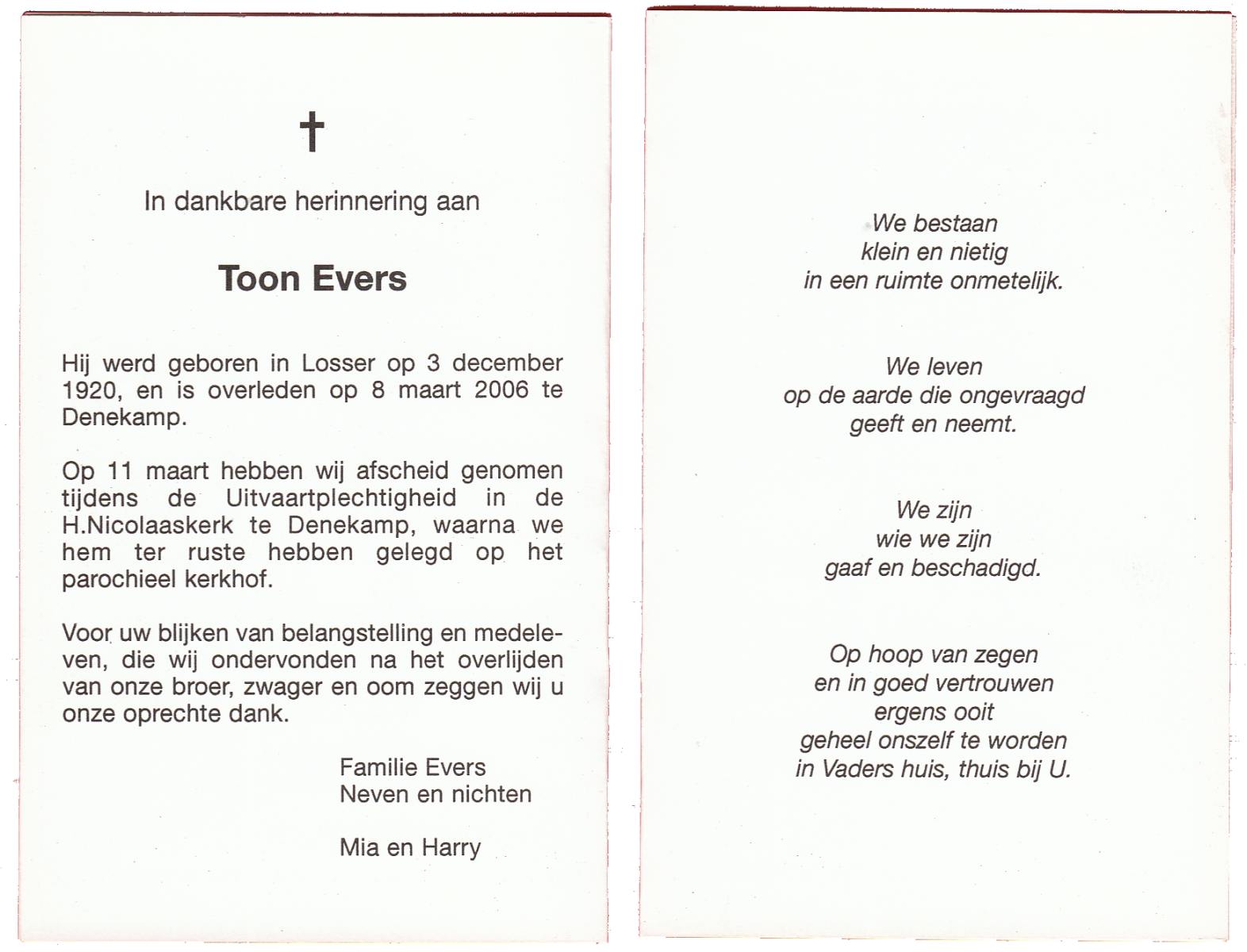 EVERS, Toon, geboren op 3-12-1920 te Losser, overleden op 8-3-2006 te Denekamp op 85-jarige leeftijd, begraven op 11-3-2006 te Denekamp.