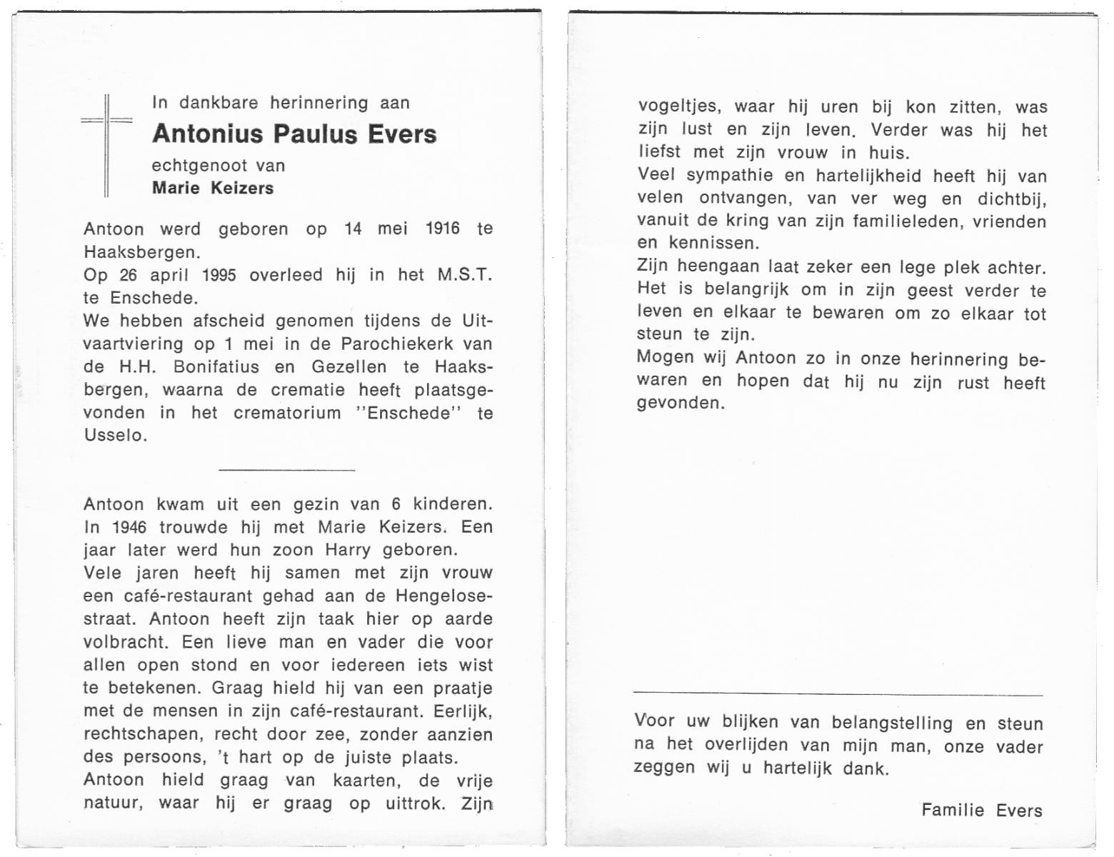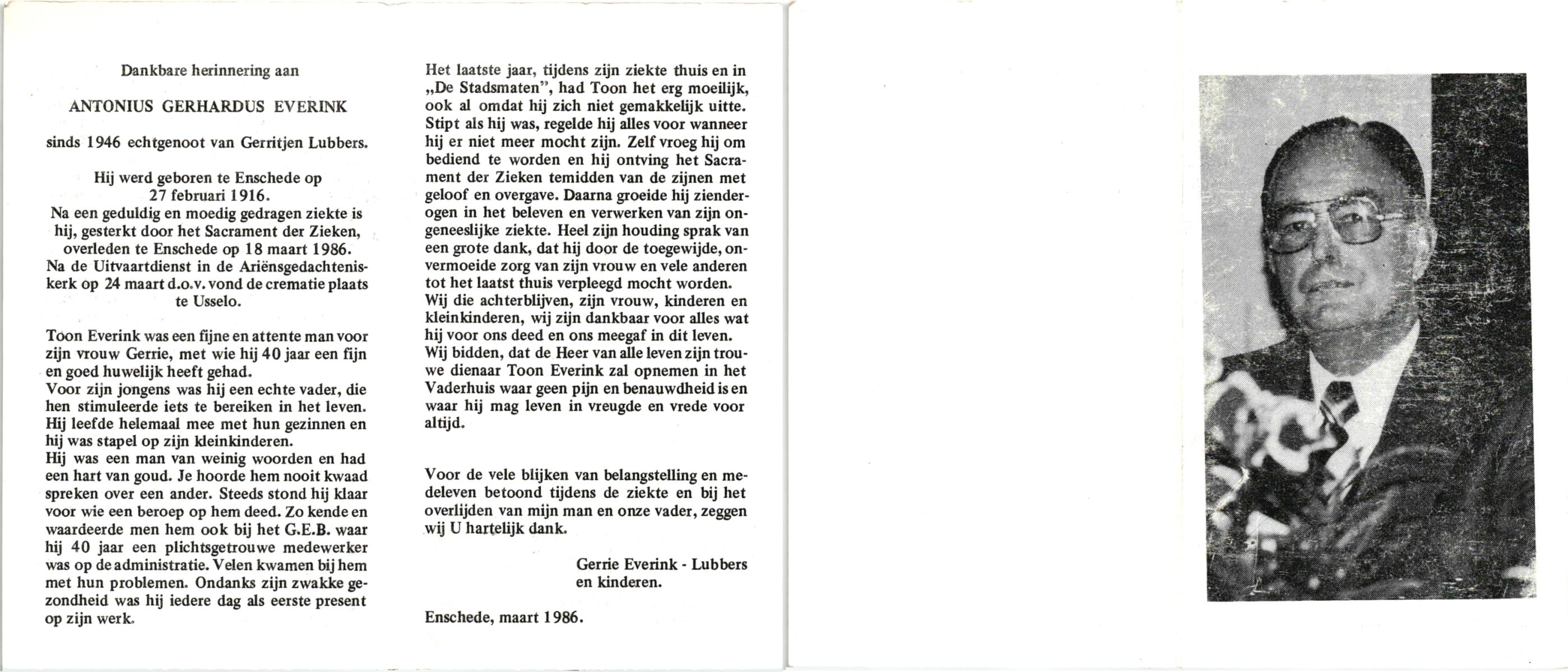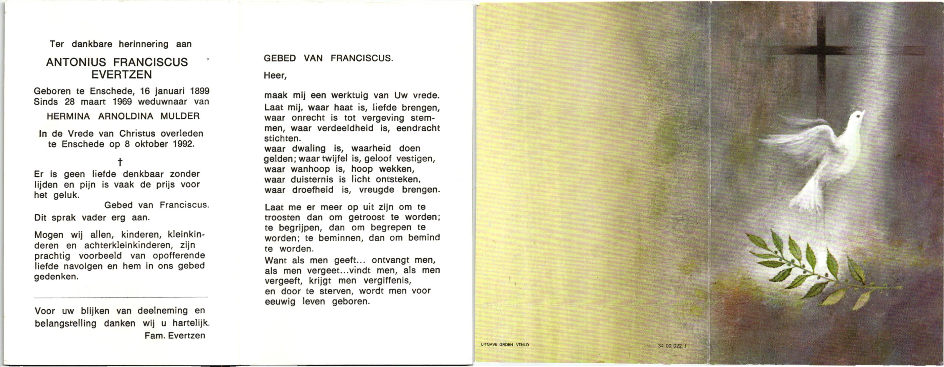 EVERTZEN, , Antonius Franciscus, geboren op 16-01-1899 te Enschede, overleden op 8-10-1992 te Enschede op 93-jarige leeftijd.