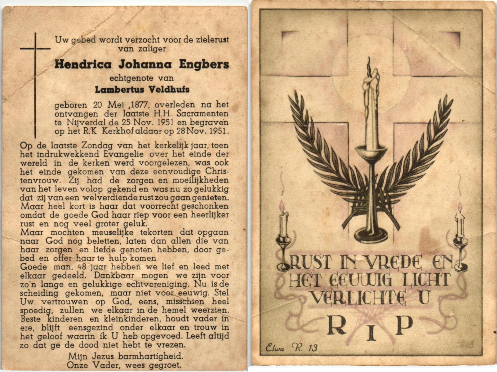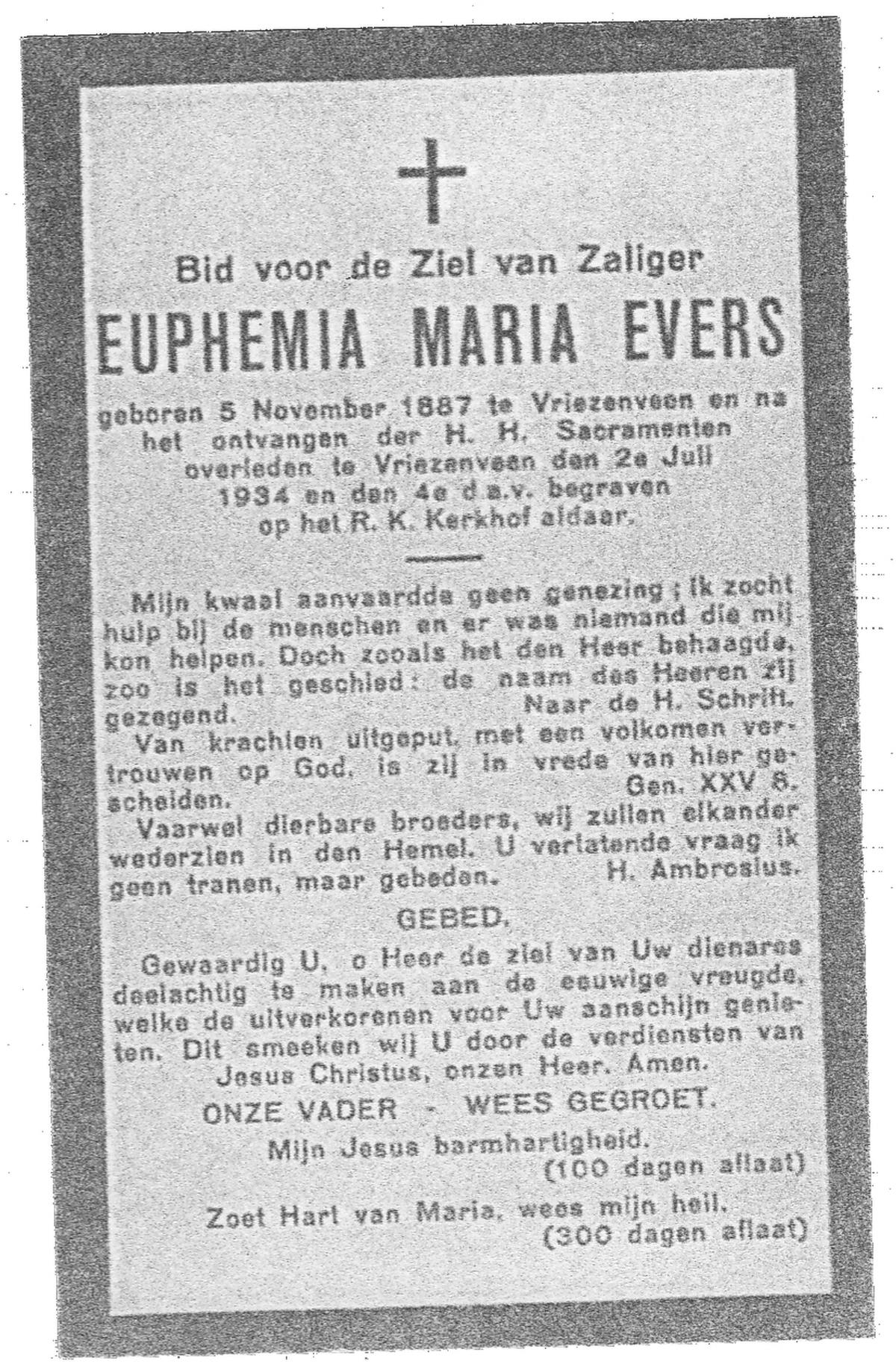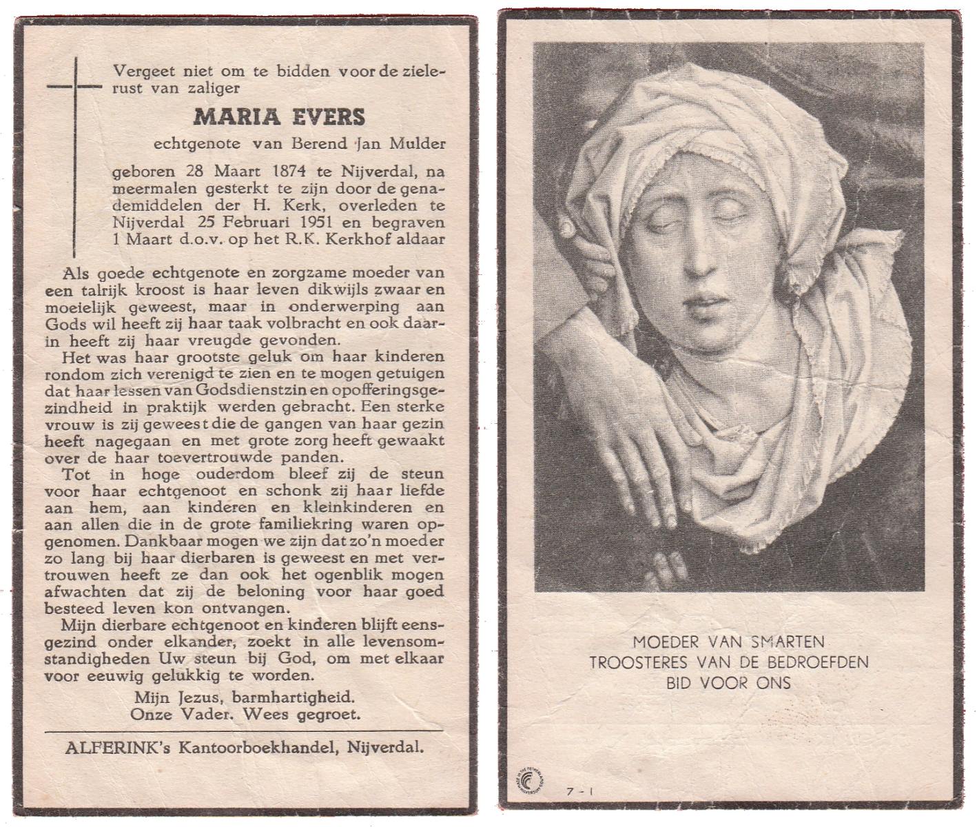 EVERS, Maria, geboren op 28-03-1874 te Nijverdal, overleden op 25-2-1951 te Nijverdal op 76-jarige leeftijd, begraven op 1-3-1951 te Nijverdal.