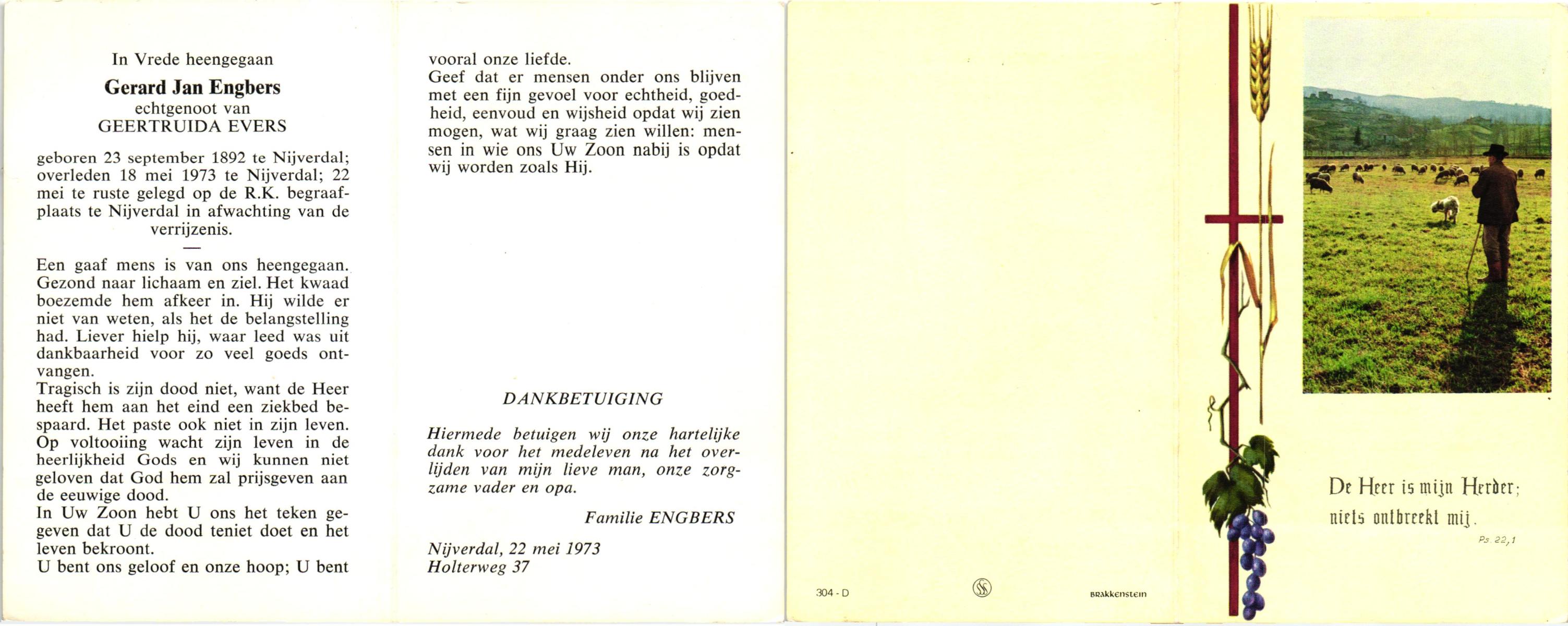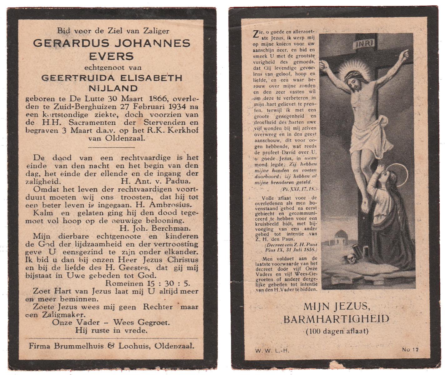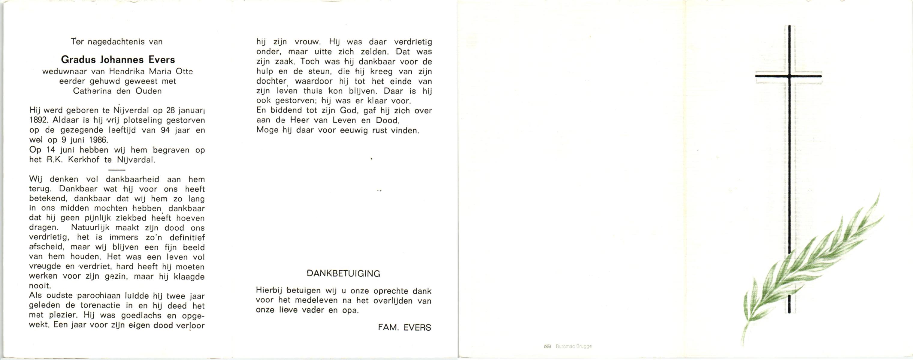 EVERS, Gradus Johannes, geboren op 28-01-1892 te Hellendoorn, Nijverdal, overleden op 9-6-1986 te Hellendoorn, Nijverdal op 94-jarige leeftijd, begraven op 14-6-1986 te Hellendoorn, Nijverdal, rk.