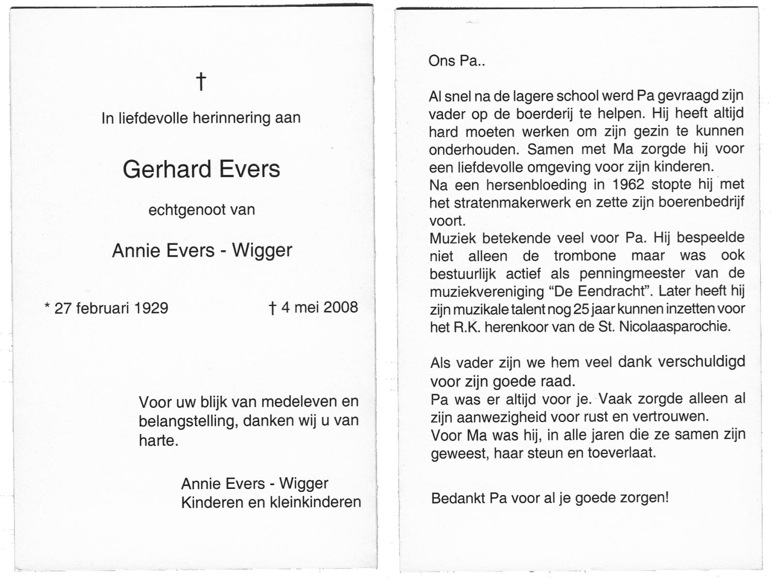 EVERS, Gerhard, geboren op 27-2-1929, overleden op 4-5-2008 op 79-jarige leeftijd.