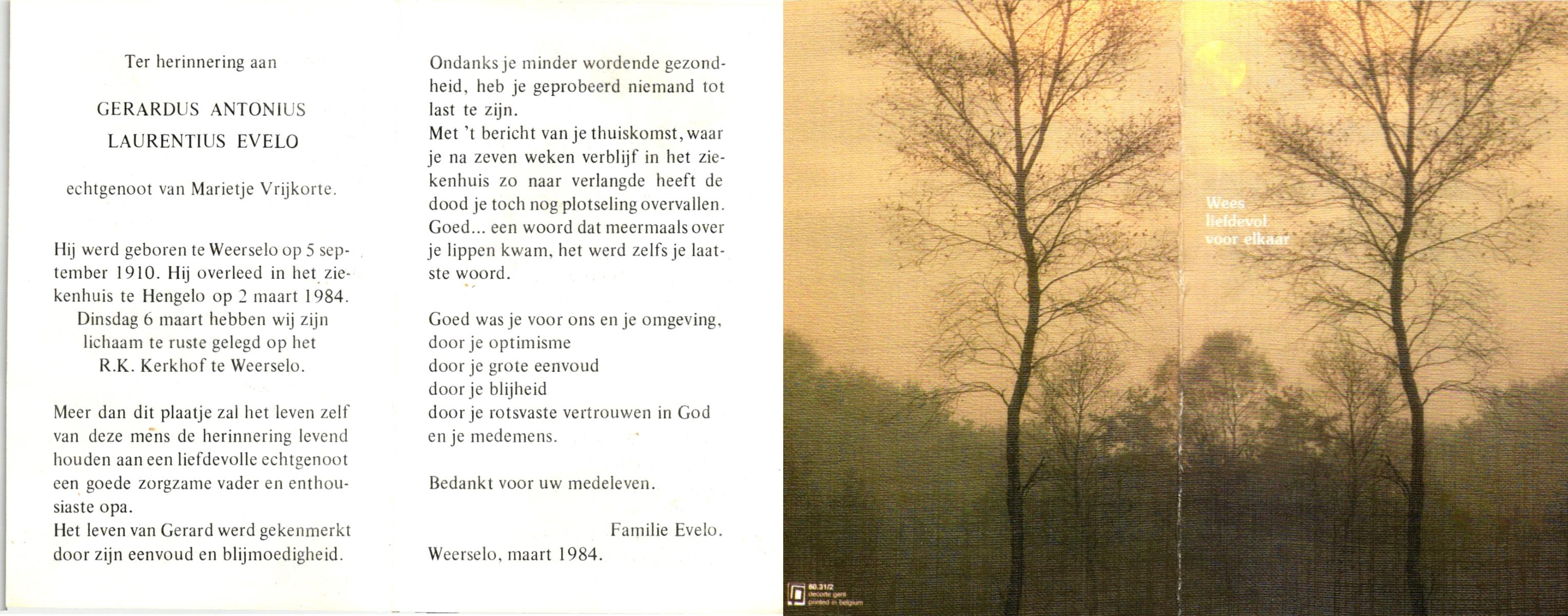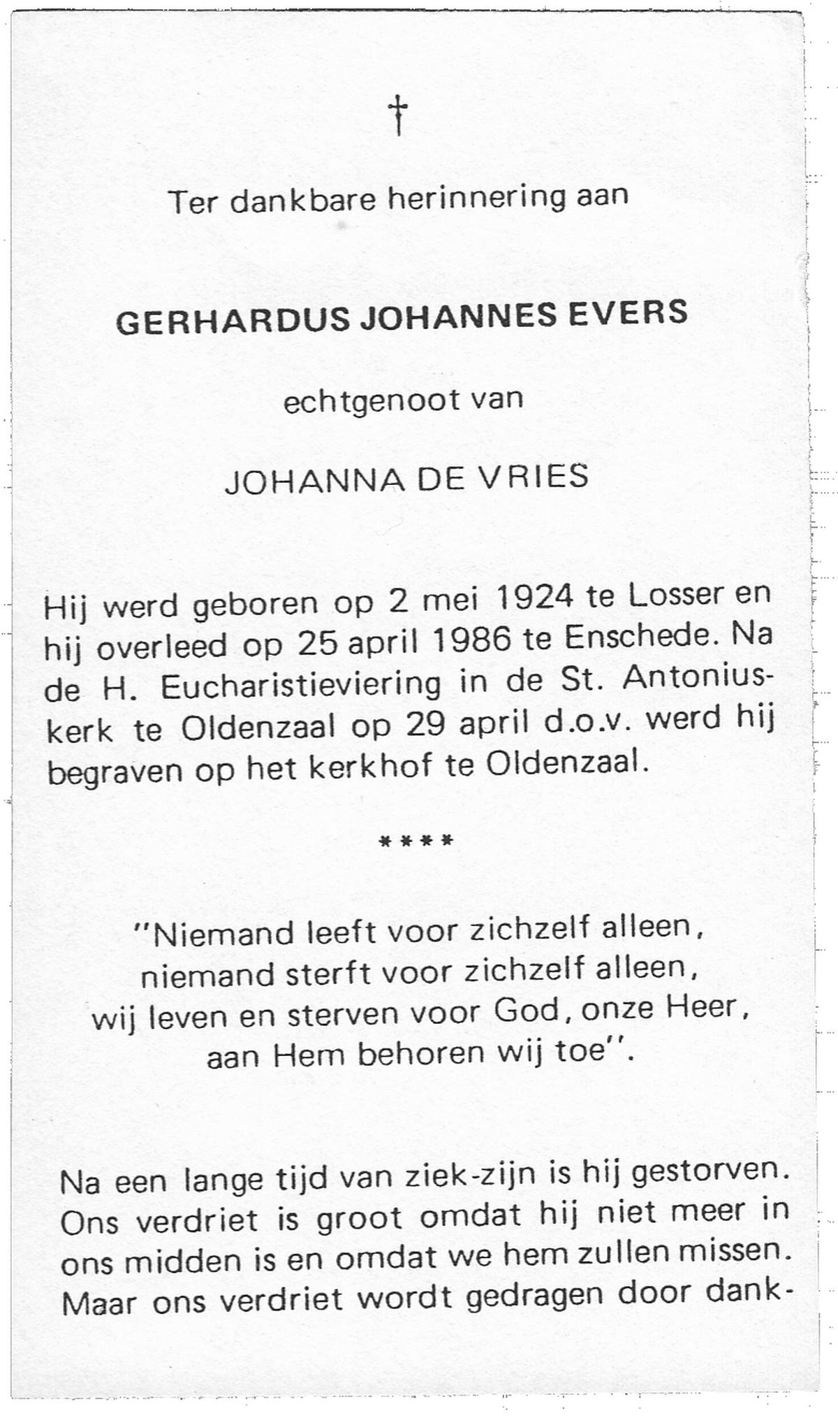 EVERS, Gerhardus Johannes, geboren op 2-5-1924 te Losser, overleden op 25-4-1986 te Enschede op 61-jarige leeftijd, begraven op 29-4-1986 te Oldenzaal.