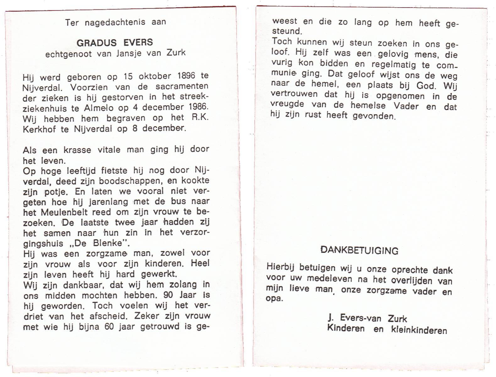 EVERS, Gradus, geboren op 15-10-1896 te Nijverdal, overleden op 4-12-1986 te Almelo op 90-jarige leeftijd, begraven op 8-12-1986 te Hellendoorn, Nijverdal.
