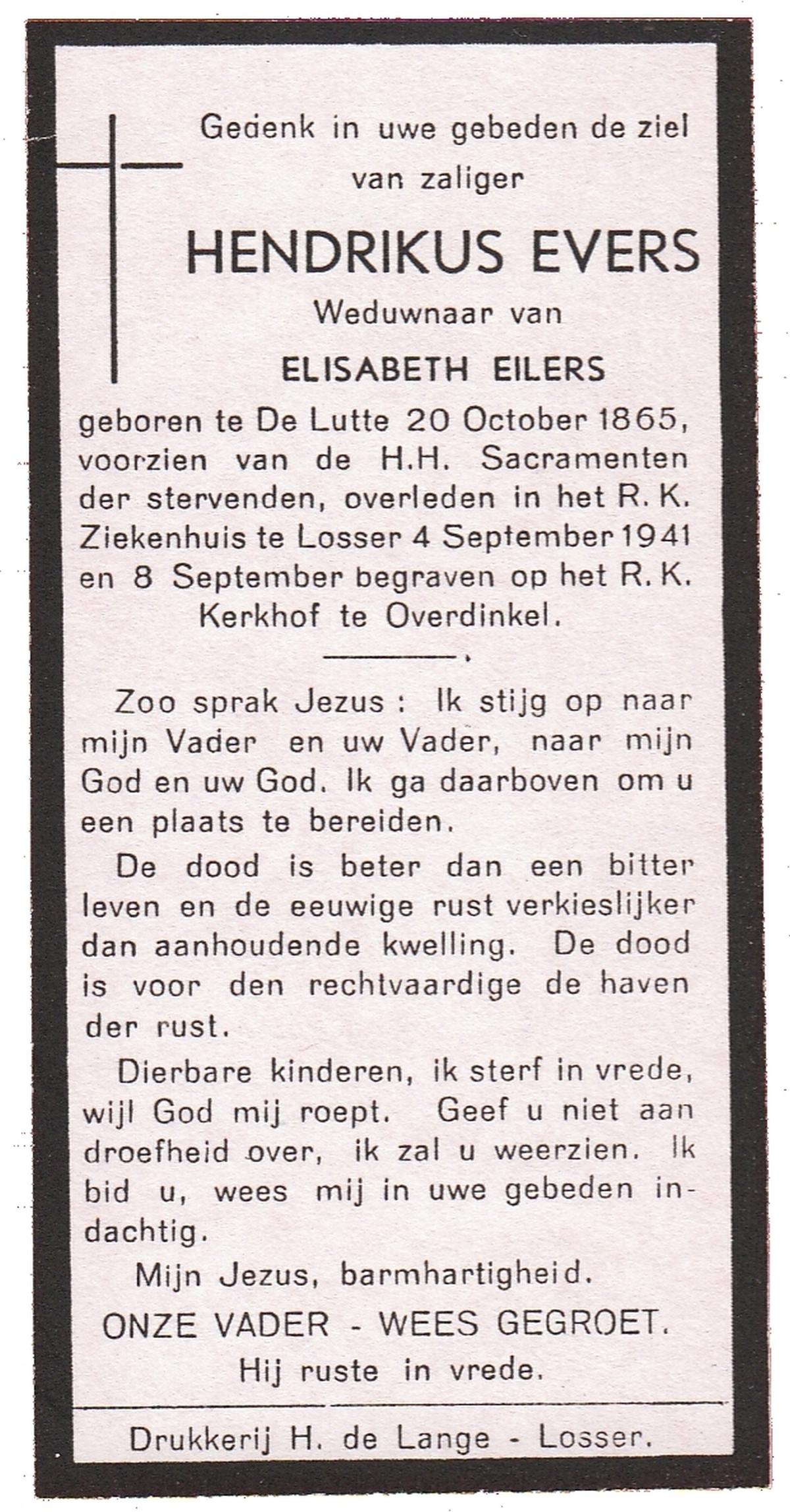 EVERS, Hendrikus, geboren op 20-10-1865 te De Lutte, overleden op 4-9-1941 te Losser op 75-jarige leeftijd, begraven op 8-9-1941 te Overdinkel.