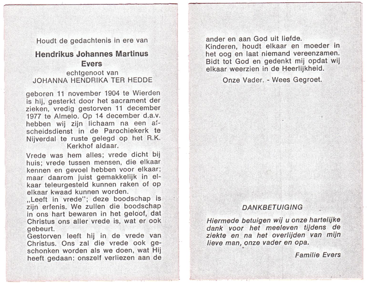 EVERS, Hendrikus Johannes Martinus, geboren op 11-11-1904 te Wierden, overleden op 11-12-1977 te Almelo op 73-jarige leeftijd, begraven op 14-12-1977 te Hellendoorn, Nijverdal.