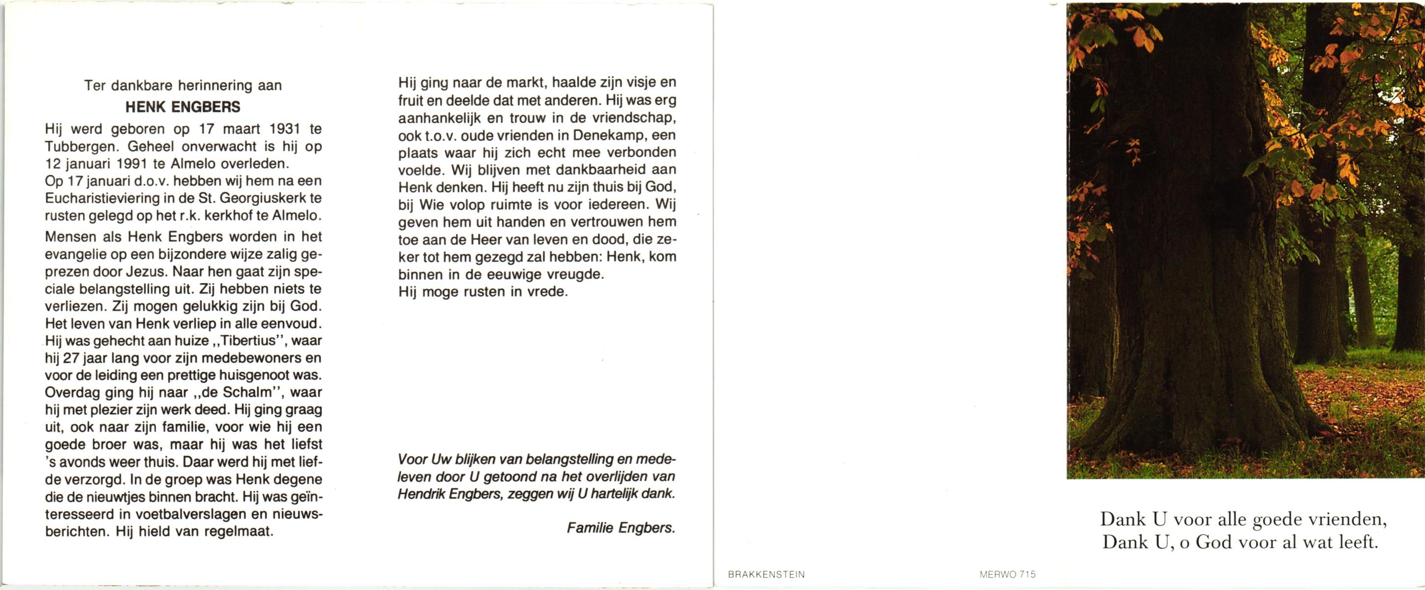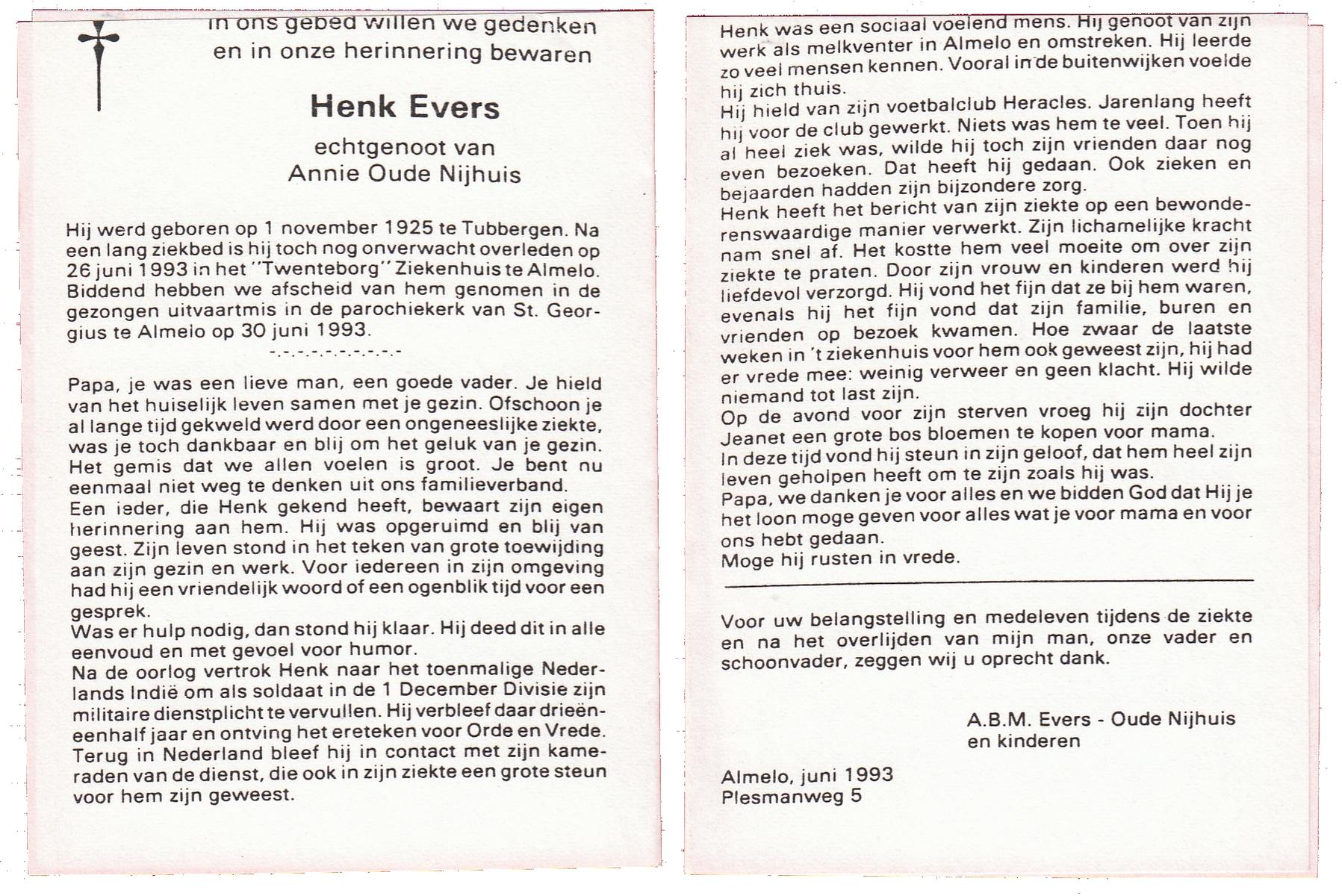 EVERS, Henk, geboren op 1-11-1925 te Tubbergen, overleden op 26-6-1993 te Almelo op 67-jarige leeftijd.