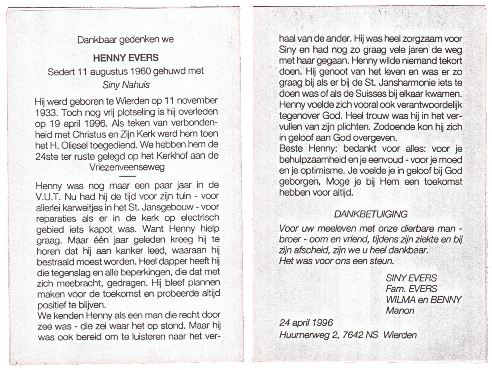 EVERS, Henny, geboren op 11-11-1933 te Wierden, overleden op 19-4-1996 te Wierden op 62-jarige leeftijd, begraven op 24-4-1996 te Wierden.