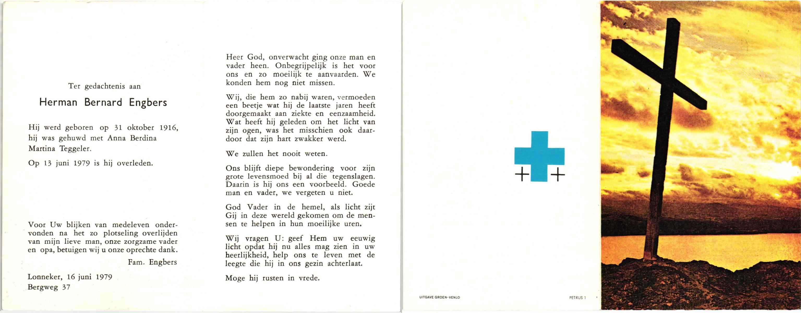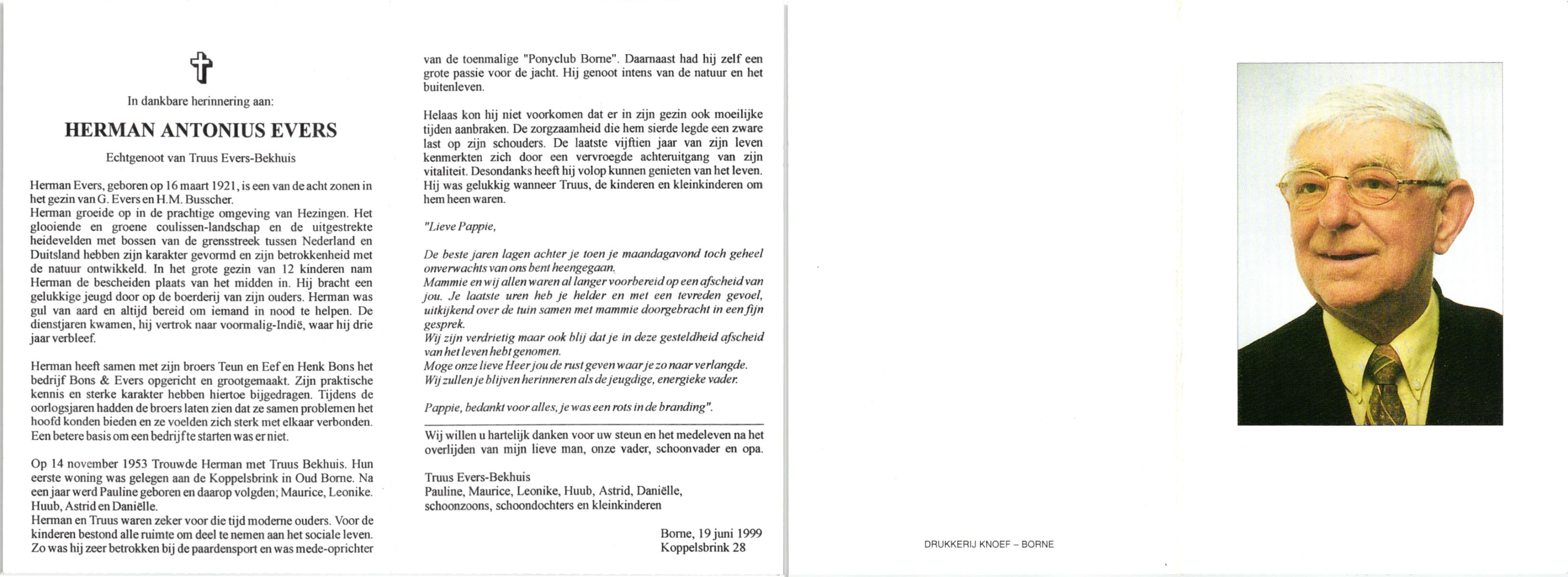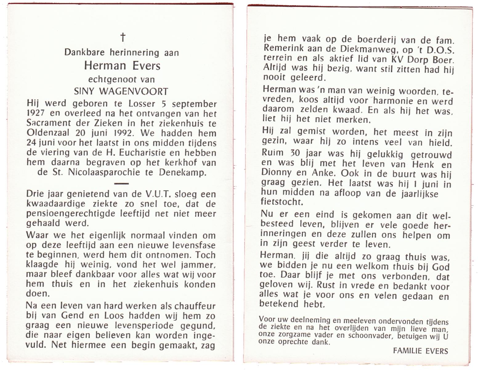 EVERS, Herman, geboren op 5-9-1927 te Losser, overleden op 20-6-1992 te Oldenzaal op 64-jarige leeftijd, begraven op 24-6-1992 te Denekamp.