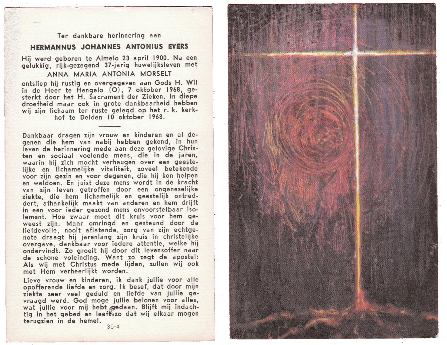 EVERS, Hermannus Johannes Antonius, geboren op 23-4-1900 te Almelo, overleden op 7-10-1968 te Hengelo (Ov.) op 68-jarige leeftijd, begraven op 10-10-1968 te Delden.