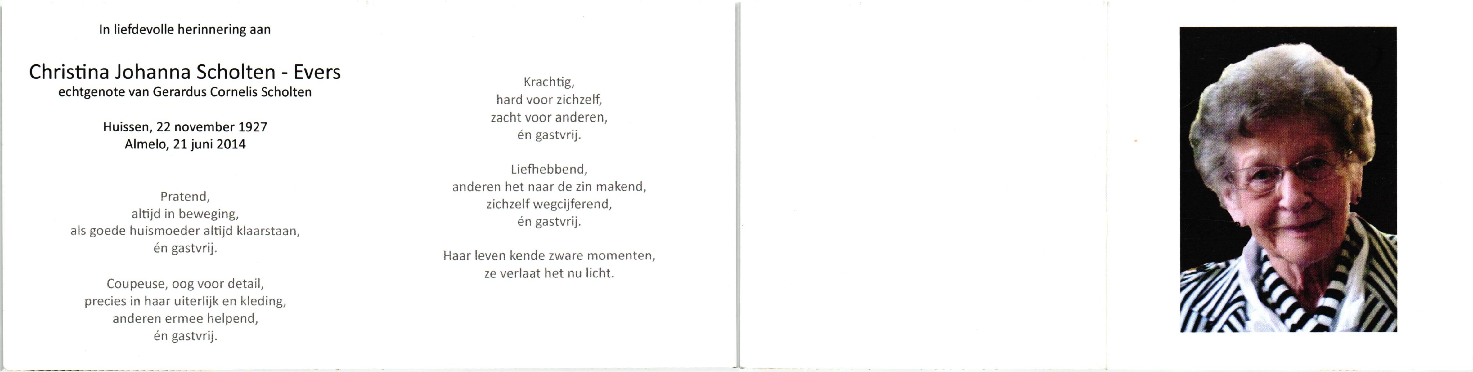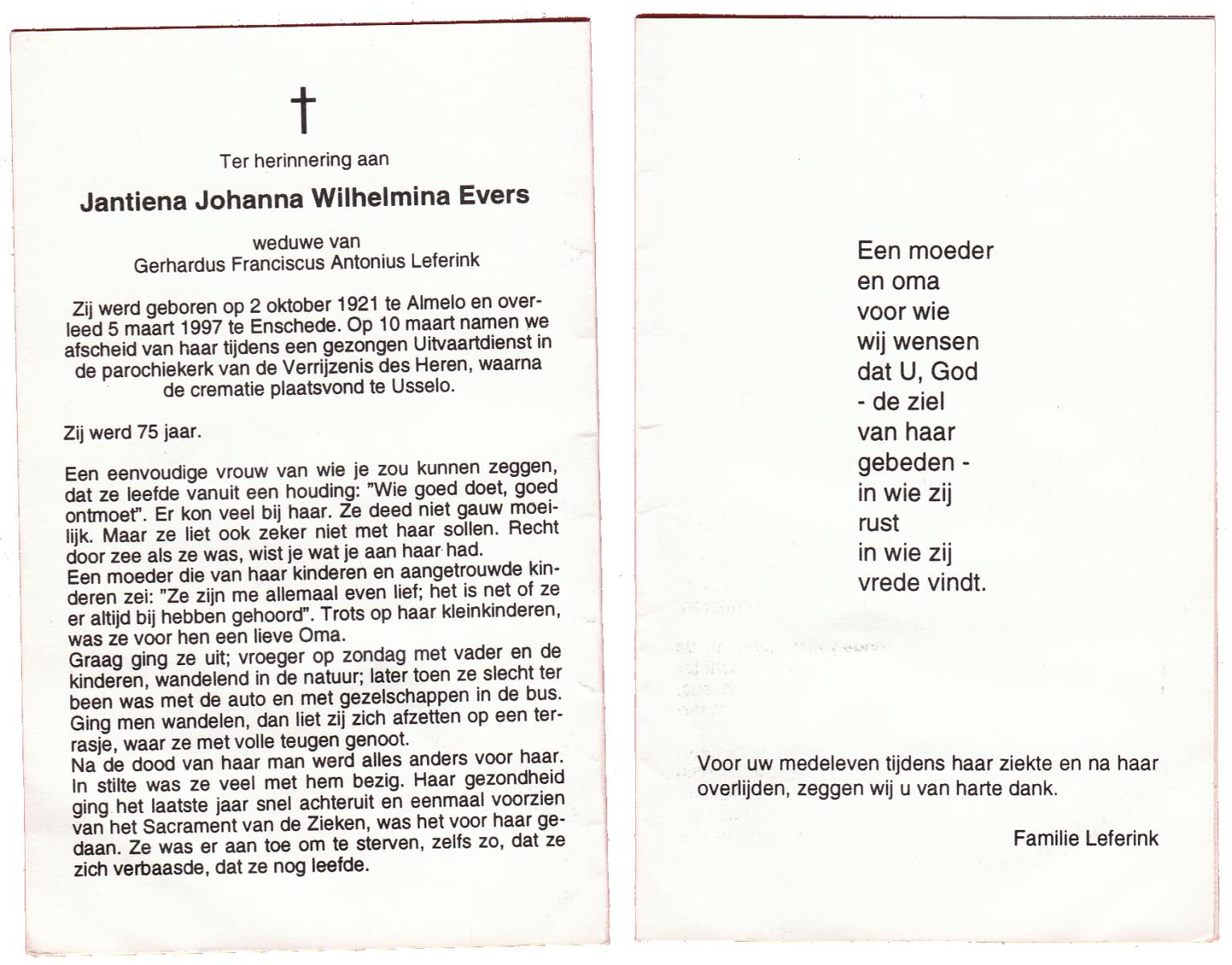 EVERS, Jantiena Johanna Wilhelmina, geboren op 2-10-1921 te Almelo, overleden op 5-3-1997 te Enschede op 75-jarige leeftijd, gecremeerd op 10-3-1997 te Usselo.