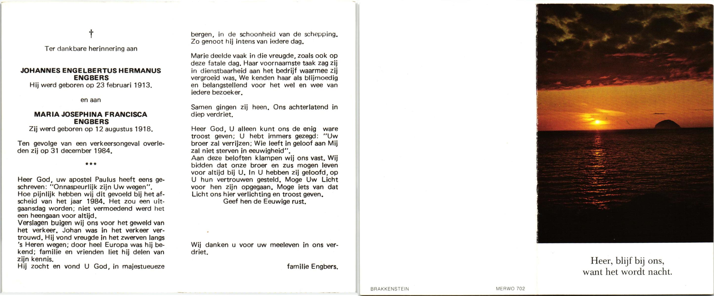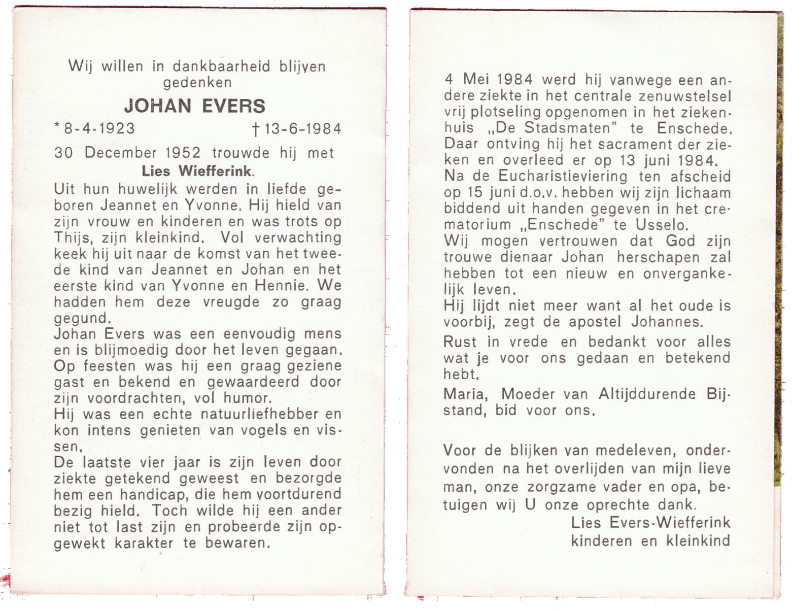 EVERS, Johan, geboren op 8-4-1923, overleden op 13-6-1984 te Enschede op 61-jarige leeftijd, gecremeerd op 15-6-1984 te Usselo.