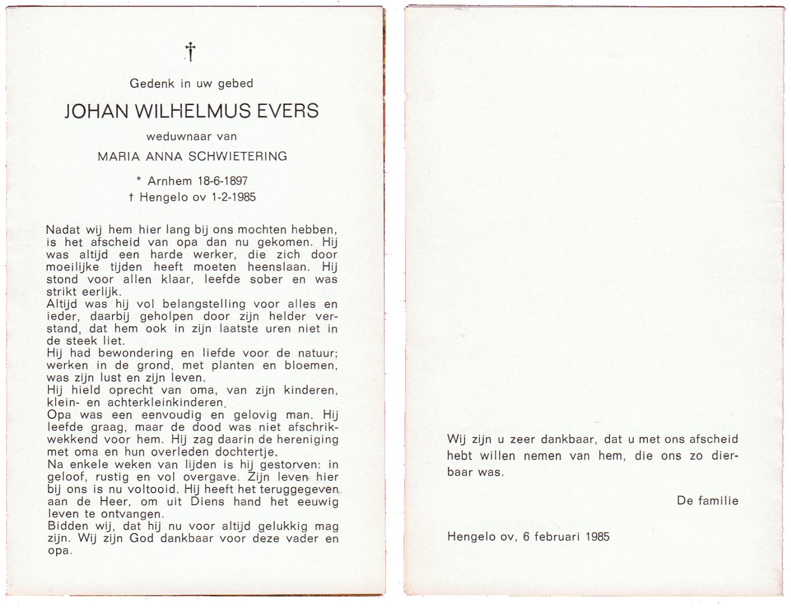 EVERS, Johan Wilhelmus, geboren op 18-06-1897 te Arnhem, overleden op 1-2-1985 te Hengelo (Ov.) op 87-jarige leeftijd.