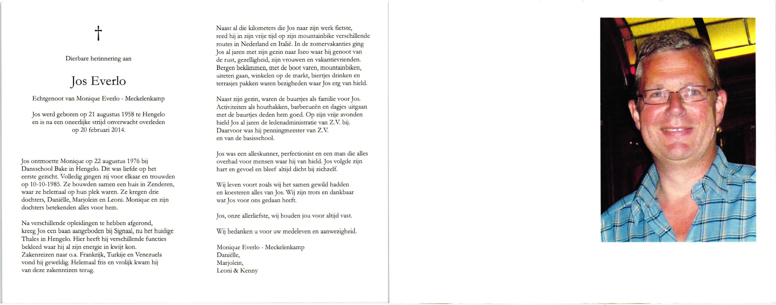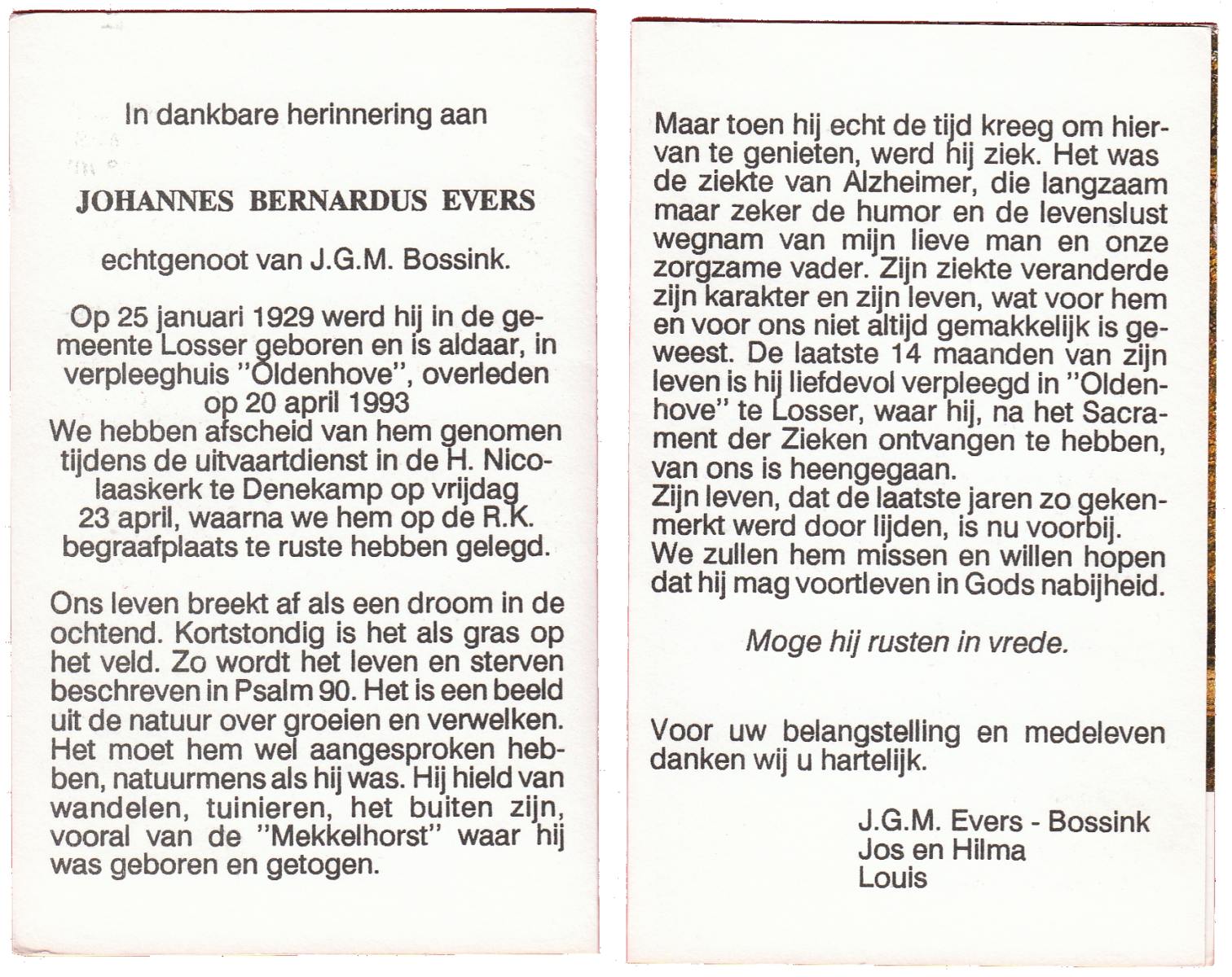 EVERS, Johannes Bernardus, geboren op 25-1-1929 te Losser, overleden op 20-4-1993 te Losser op 64-jarige leeftijd, begraven op 23-4-1993 te Denekamp.