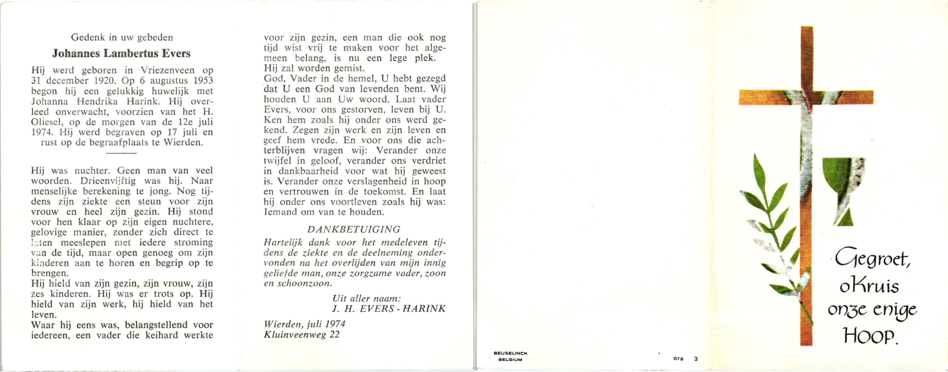 EVERS, Johannes Lambertus, geboren op 31-12-1920 te Vriezenveen, overleden op 12-7-1974 op 53-jarige leeftijd, begraven op 17-7-1974 te Wierden.